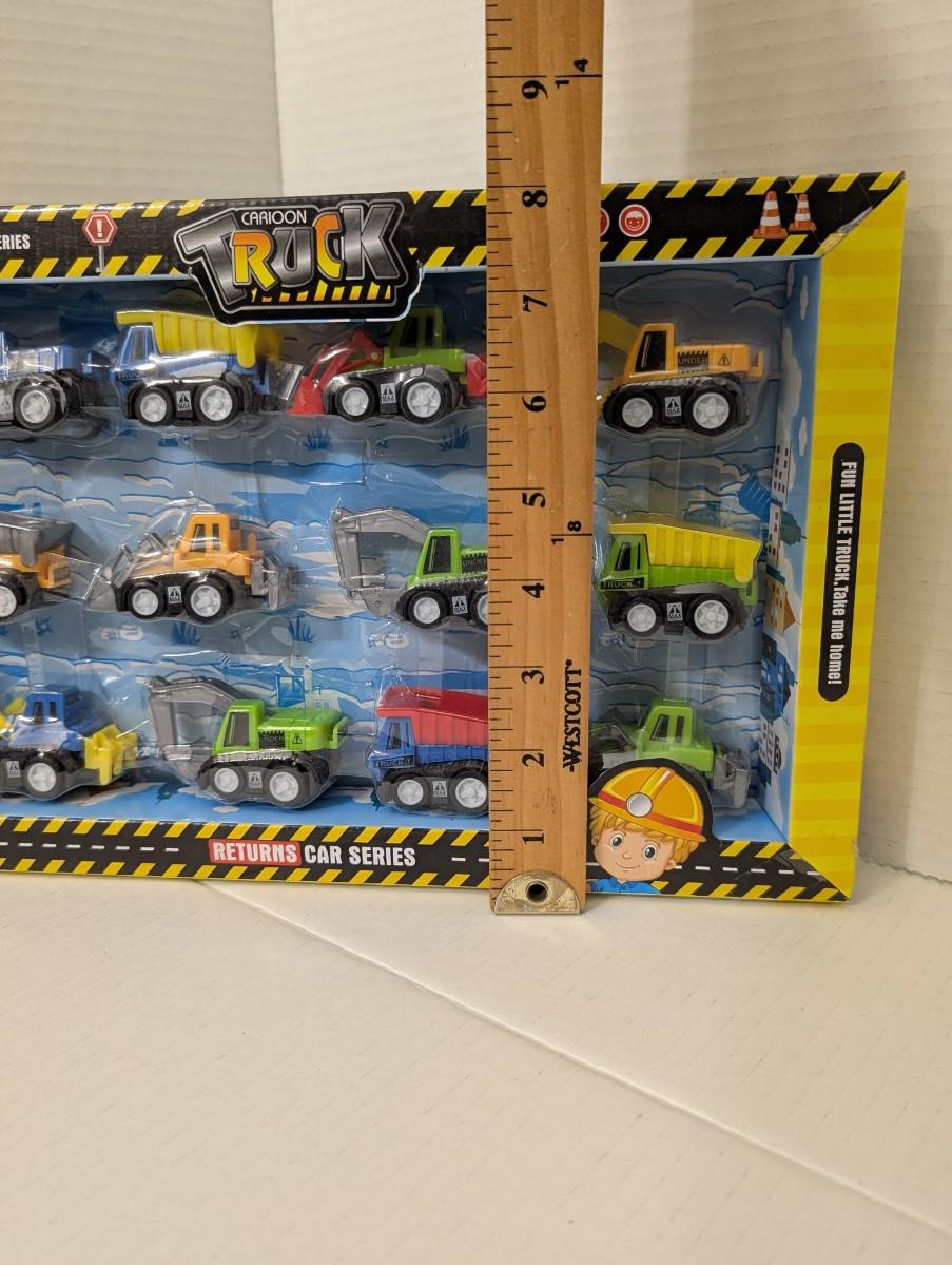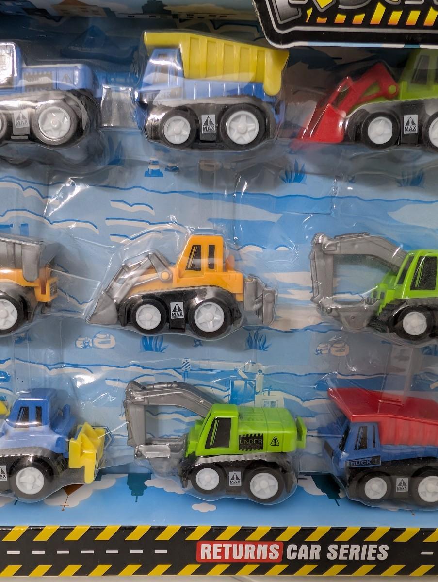 Set of 10 miniature construction vehicles from the Cartoon Truck Returns Car Series. Includes a variety of colorful toy trucks such as dump trucks, excavators, and loaders. Still sealed in original packaging, making it a fun gift or collectible toy set. Great for kids, playtime, or display.