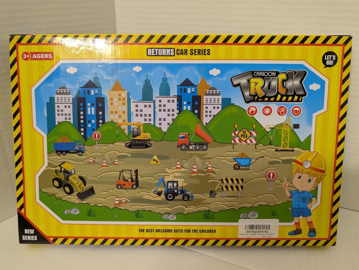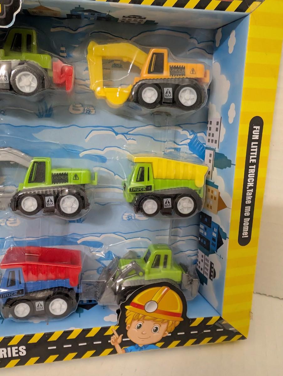 toy truck set, construction vehicle toys, cartoon truck series, sealed toy set, kids play trucks, miniature dump truck, toy excavator, toy loader, construction car set, estate find toy trucks