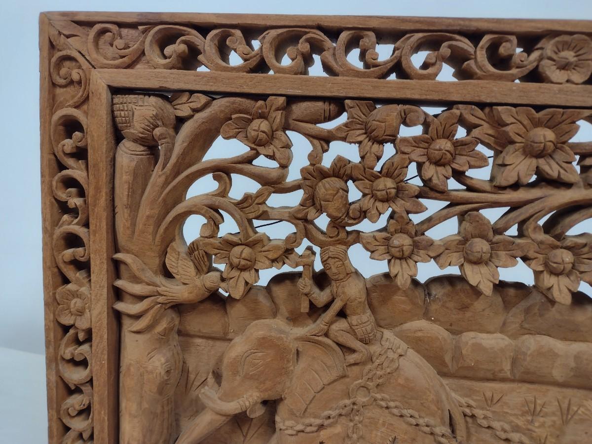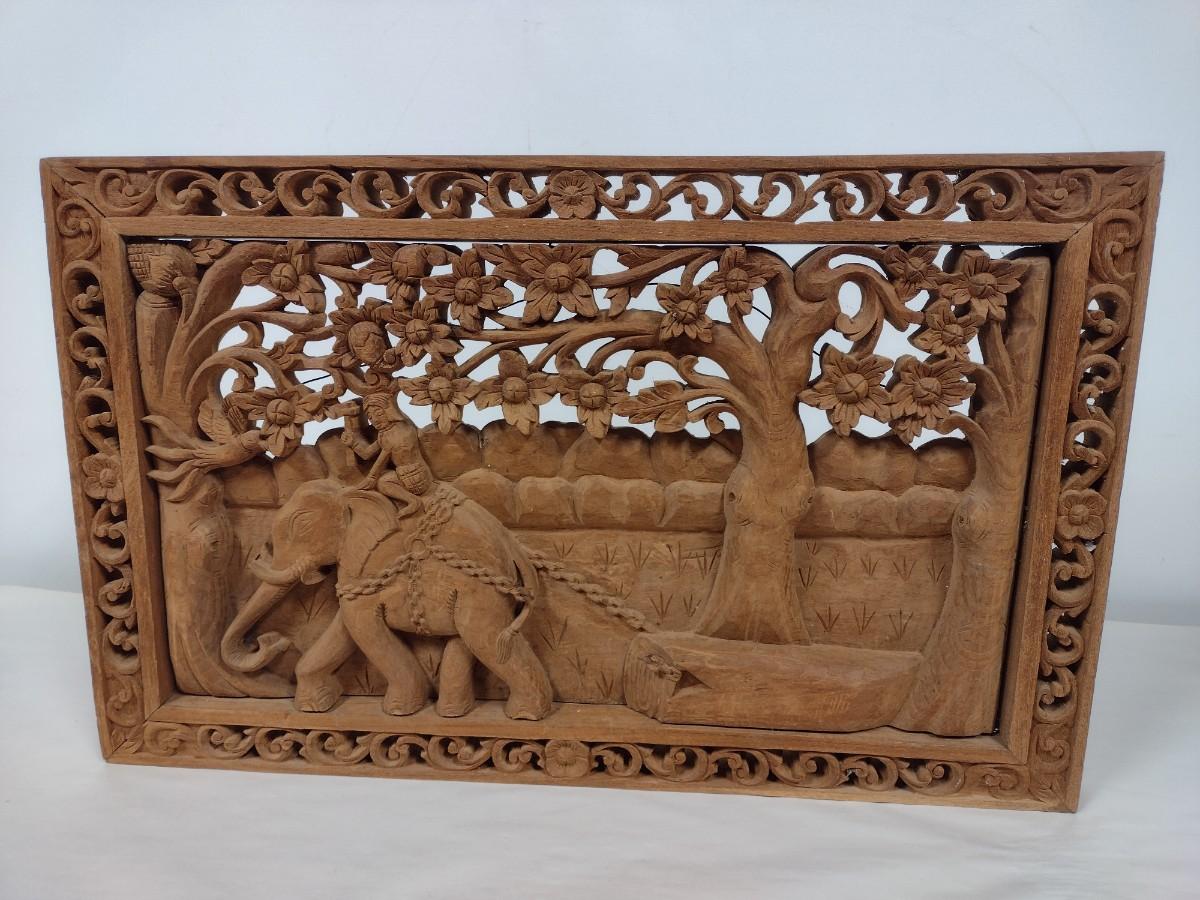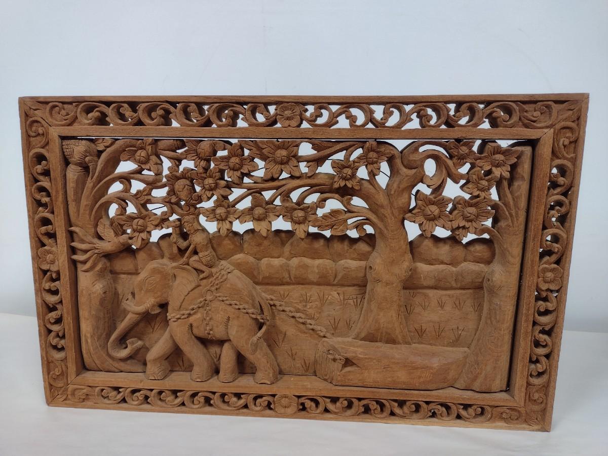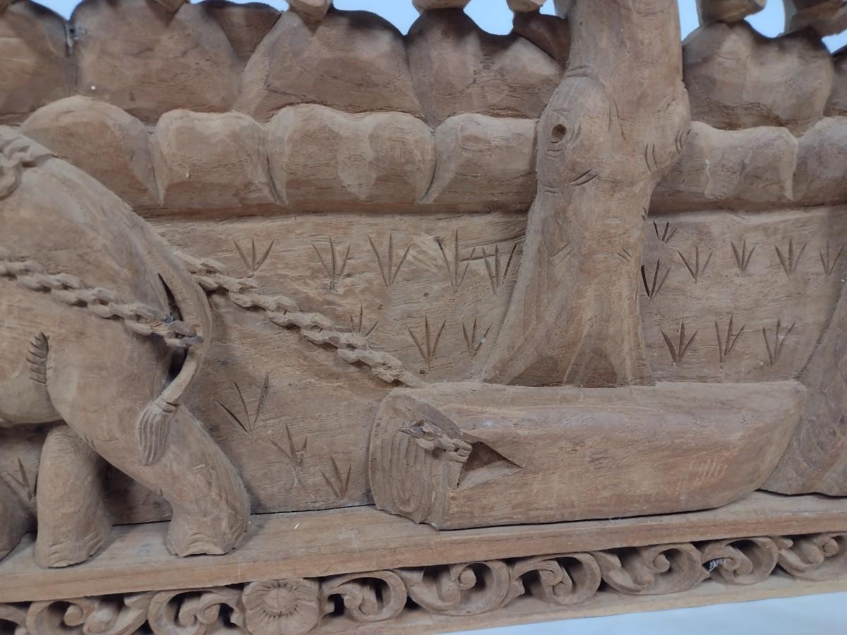 Vintage Large Hand Carved Wood Relief of Working Elephant