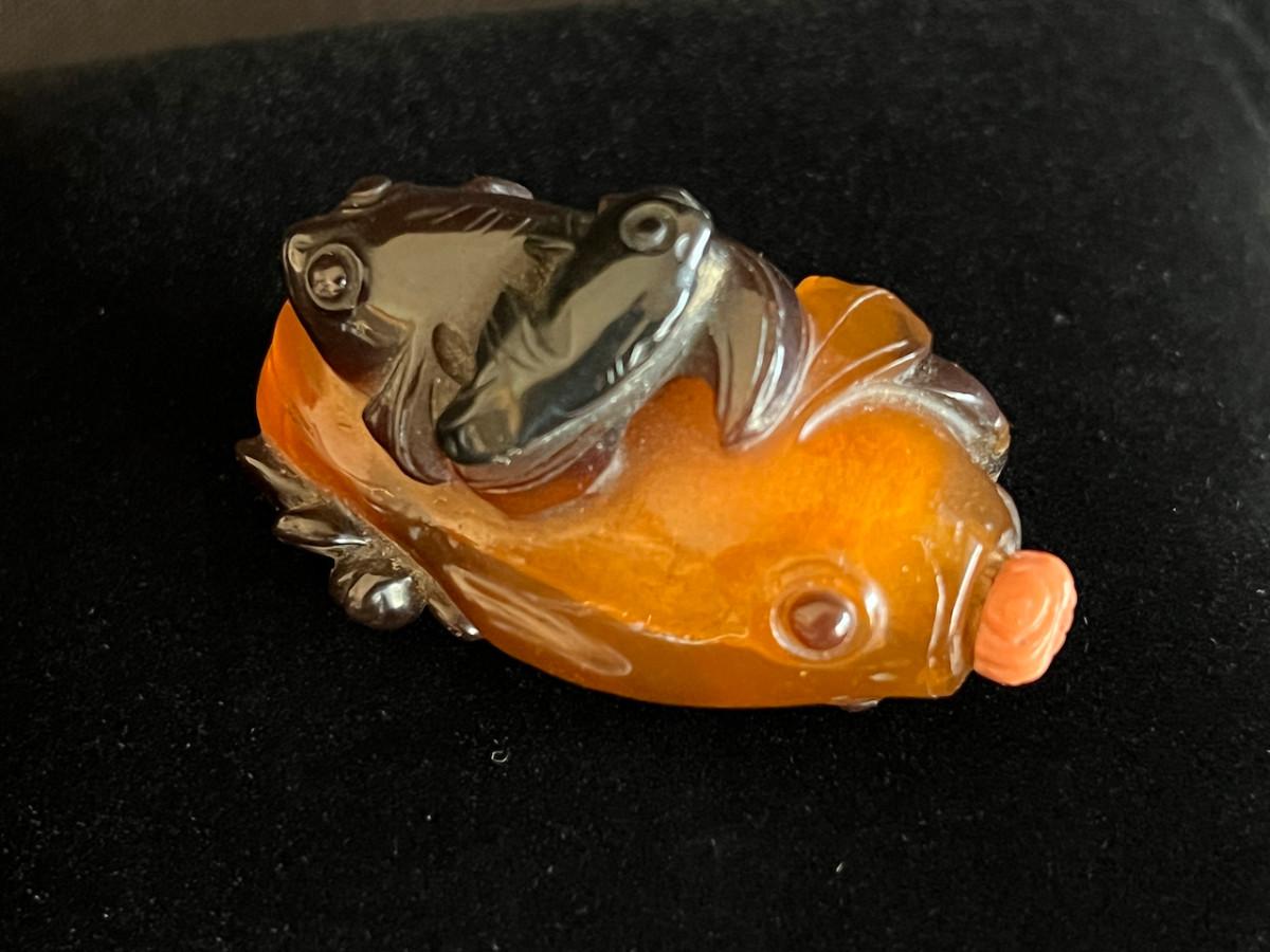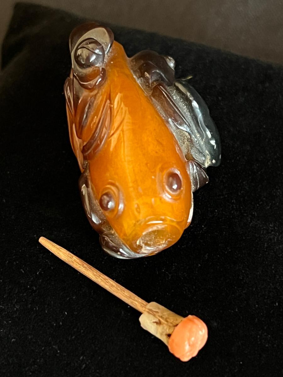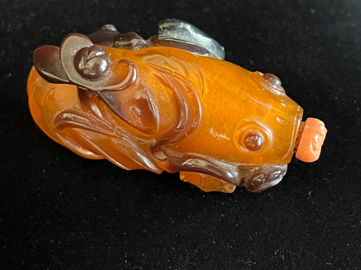 Carved Amber Koi Fish Snuff Bottle with Coral Squash Blossom Stopper
