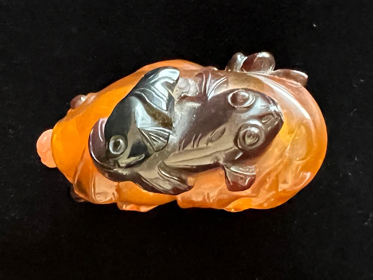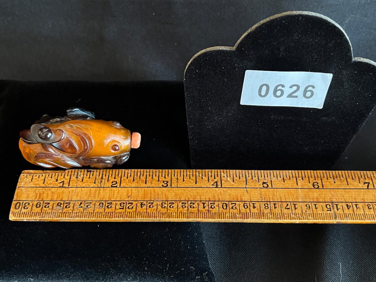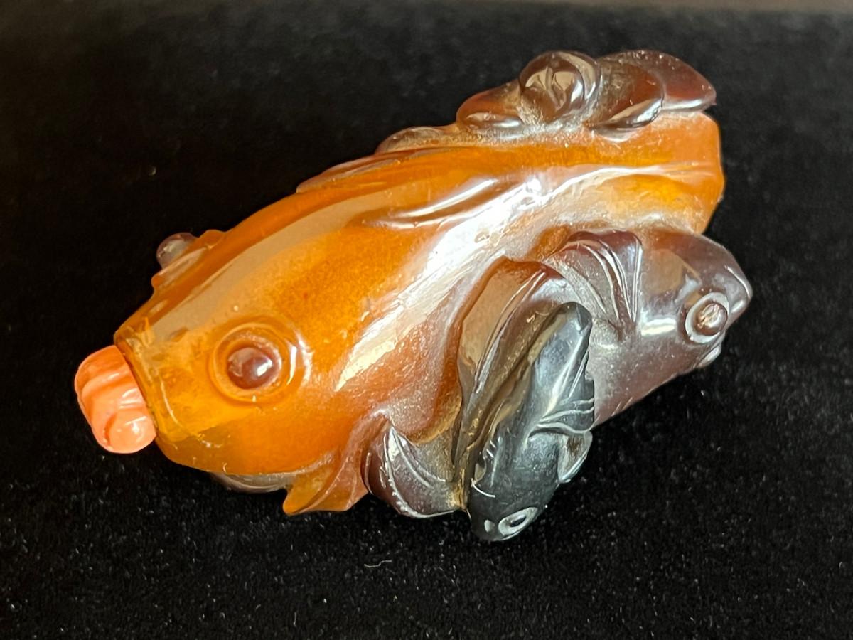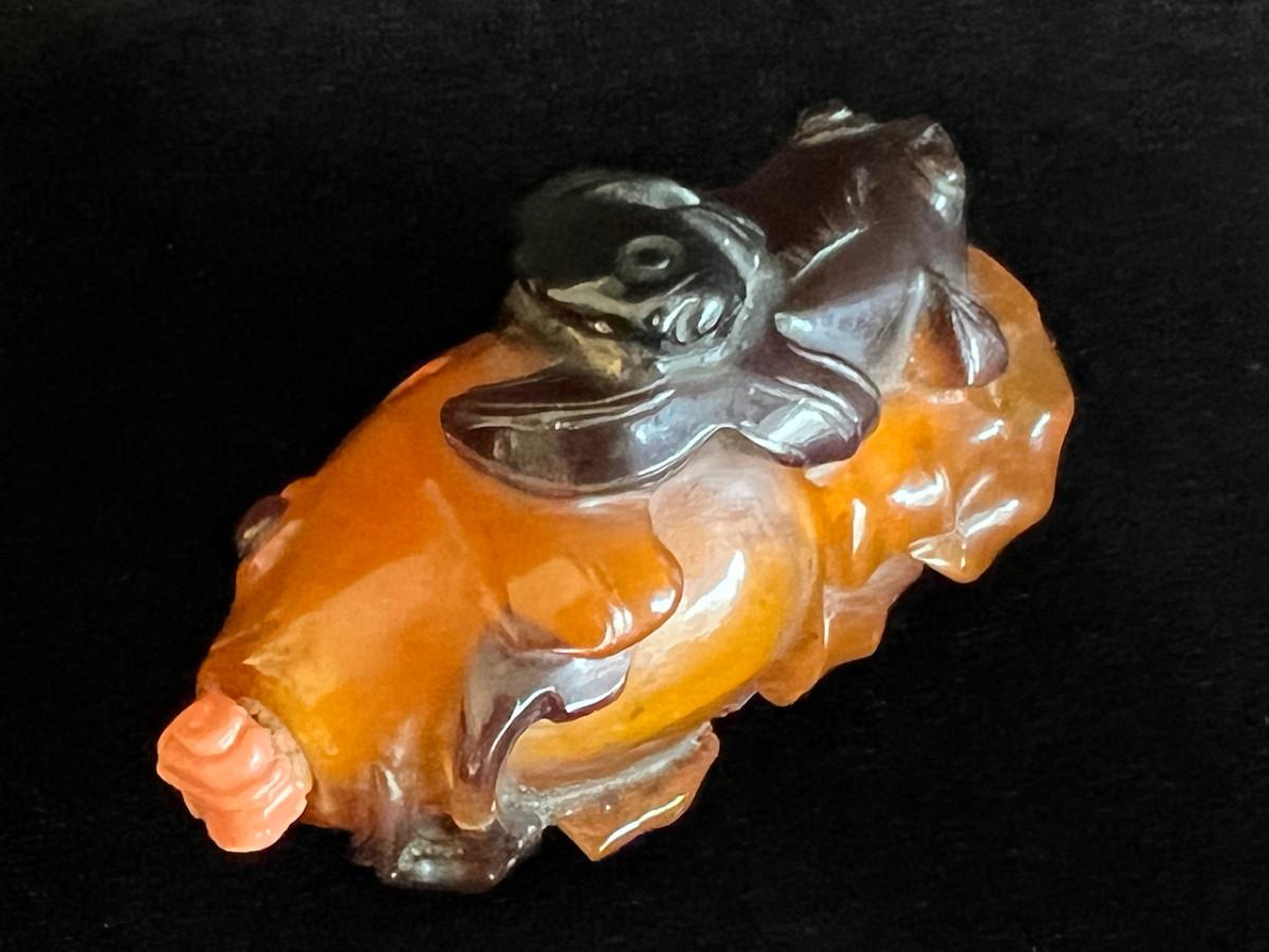 Carved Amber Koi Fish Snuff Bottle with Coral Squash Blossom Stopper