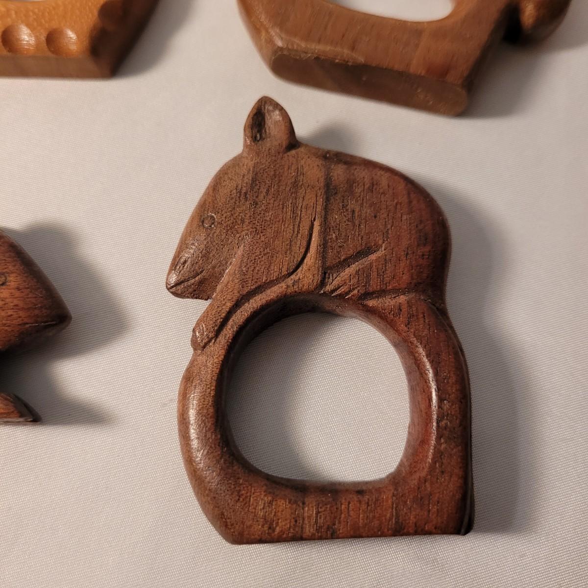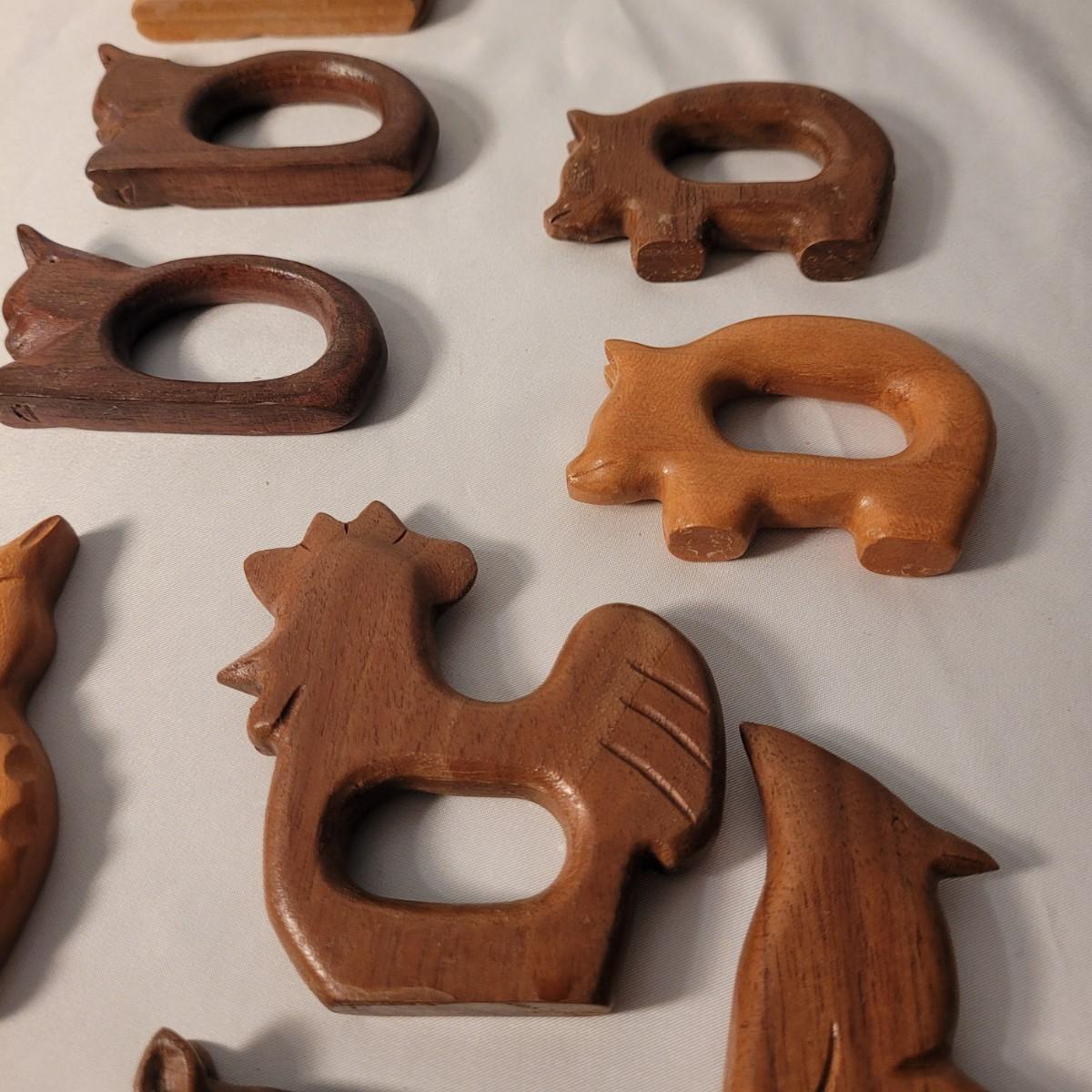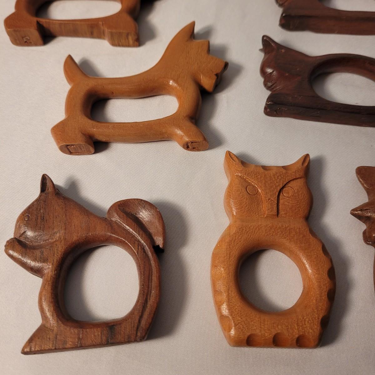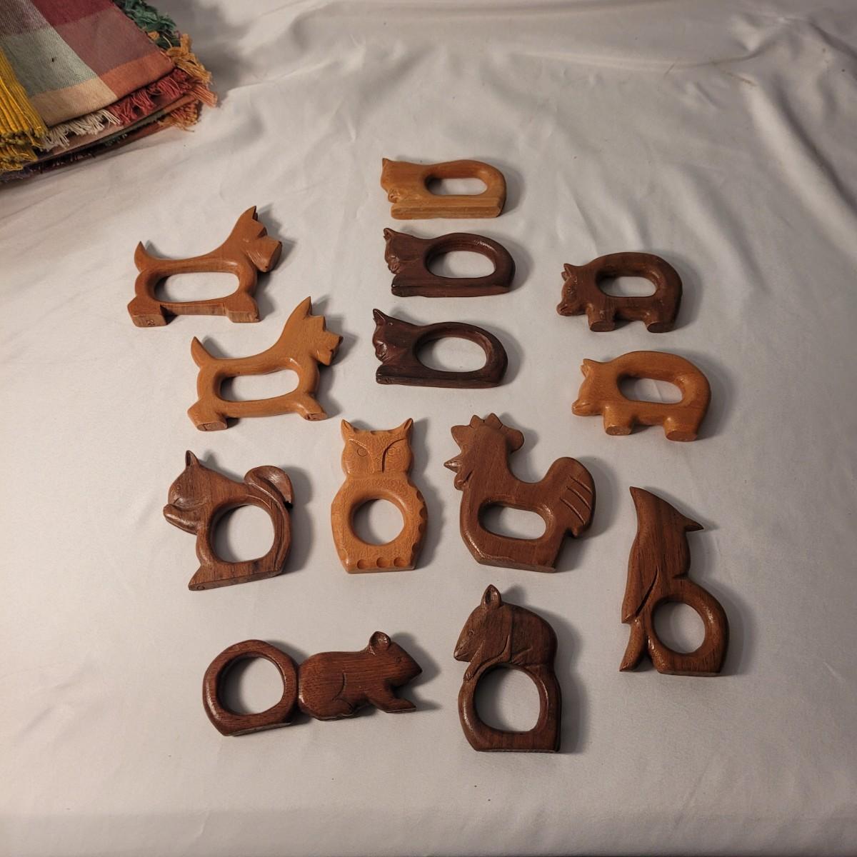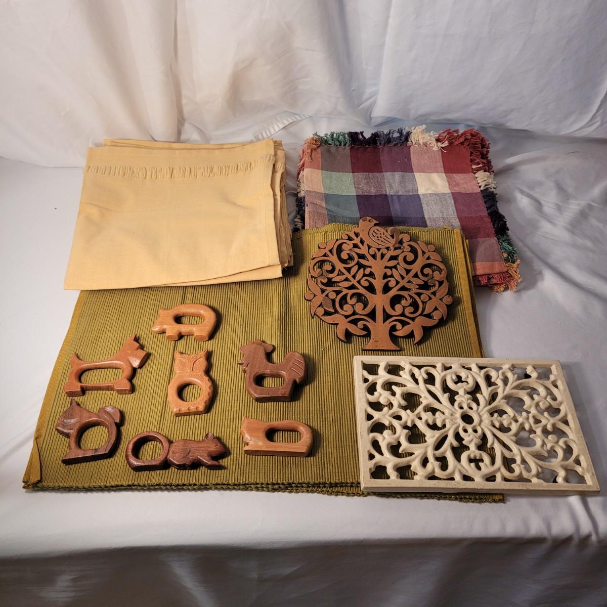 This lot includes a collection of thirteen handcarved wooden animal napkin rings, three sets of placemats (11 yellow, 10 plaid, 6 green) and a variety of trivets. Shipping available.