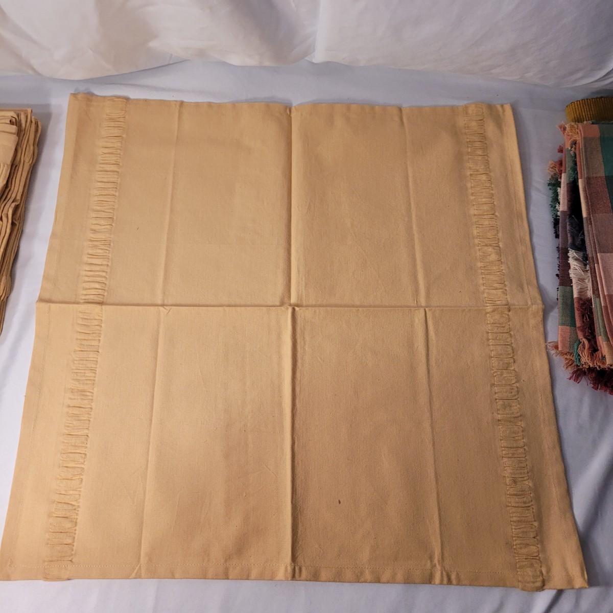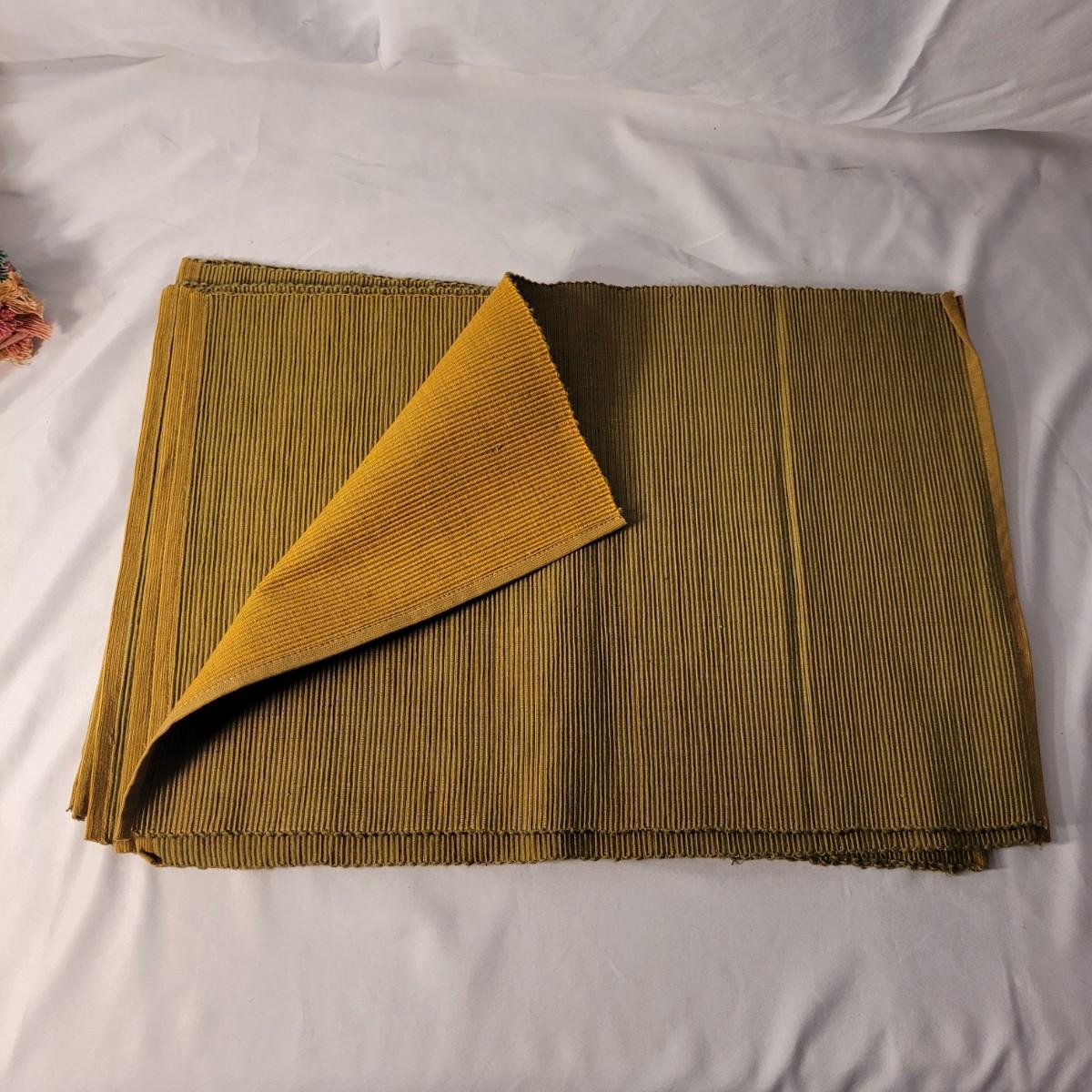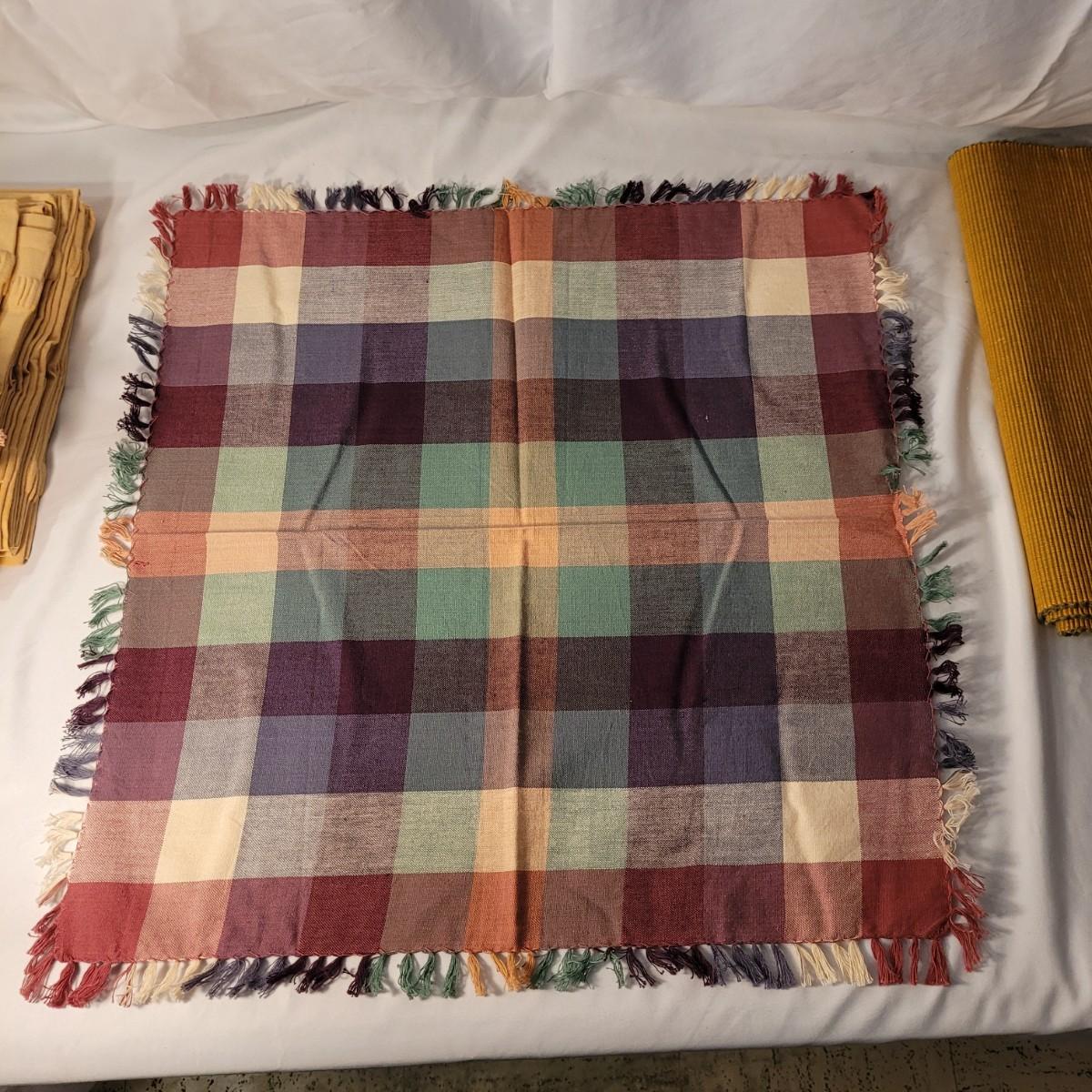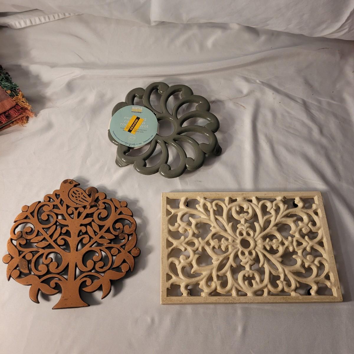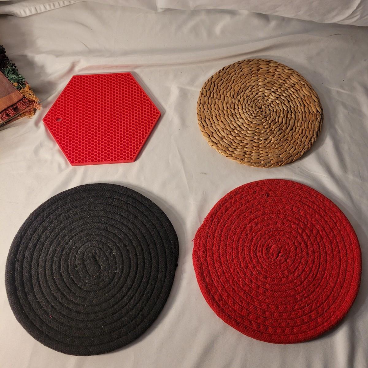 This lot includes a collection of thirteen handcarved wooden animal napkin rings, three sets of placemats (11 yellow, 10 plaid, 6 green) and a variety of trivets. Shipping available.