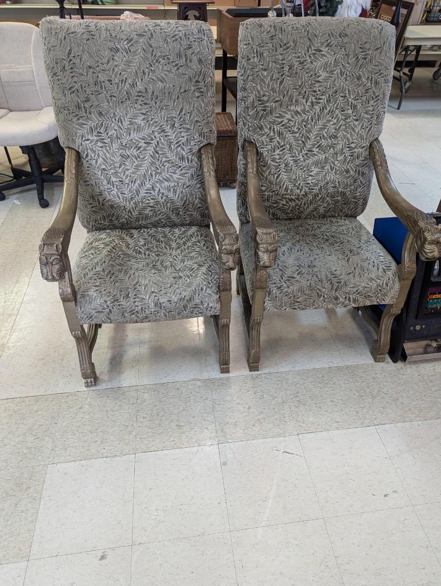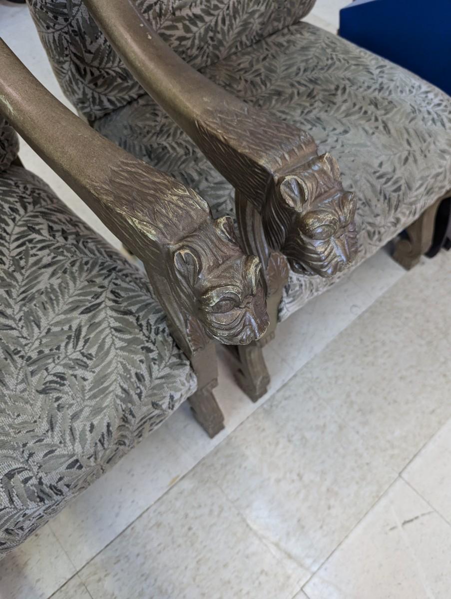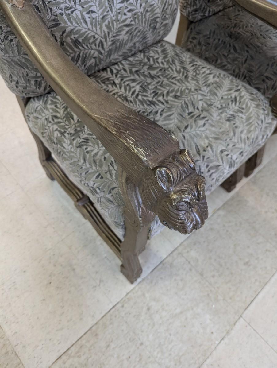 Carved Antique Lion's Head Arm Chairs With Pillows