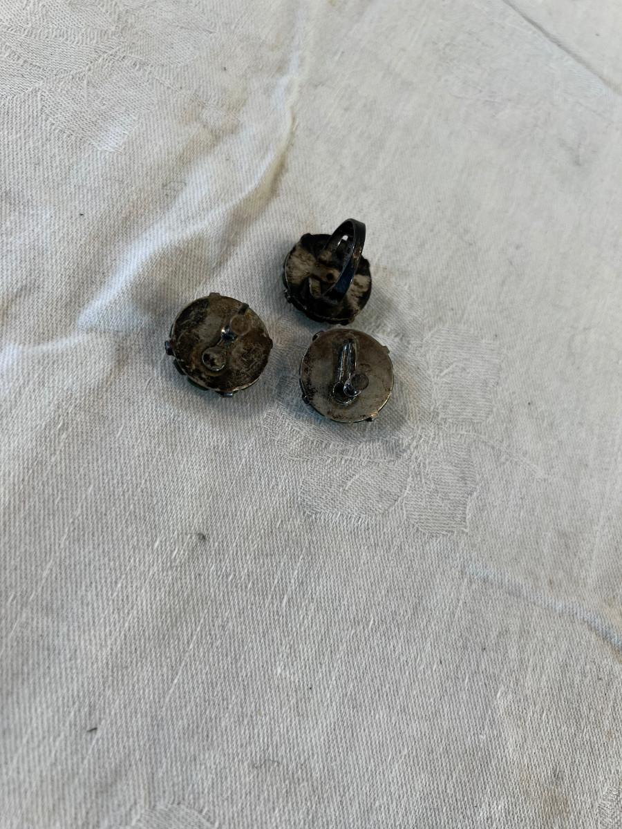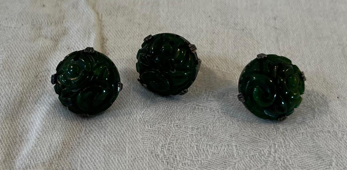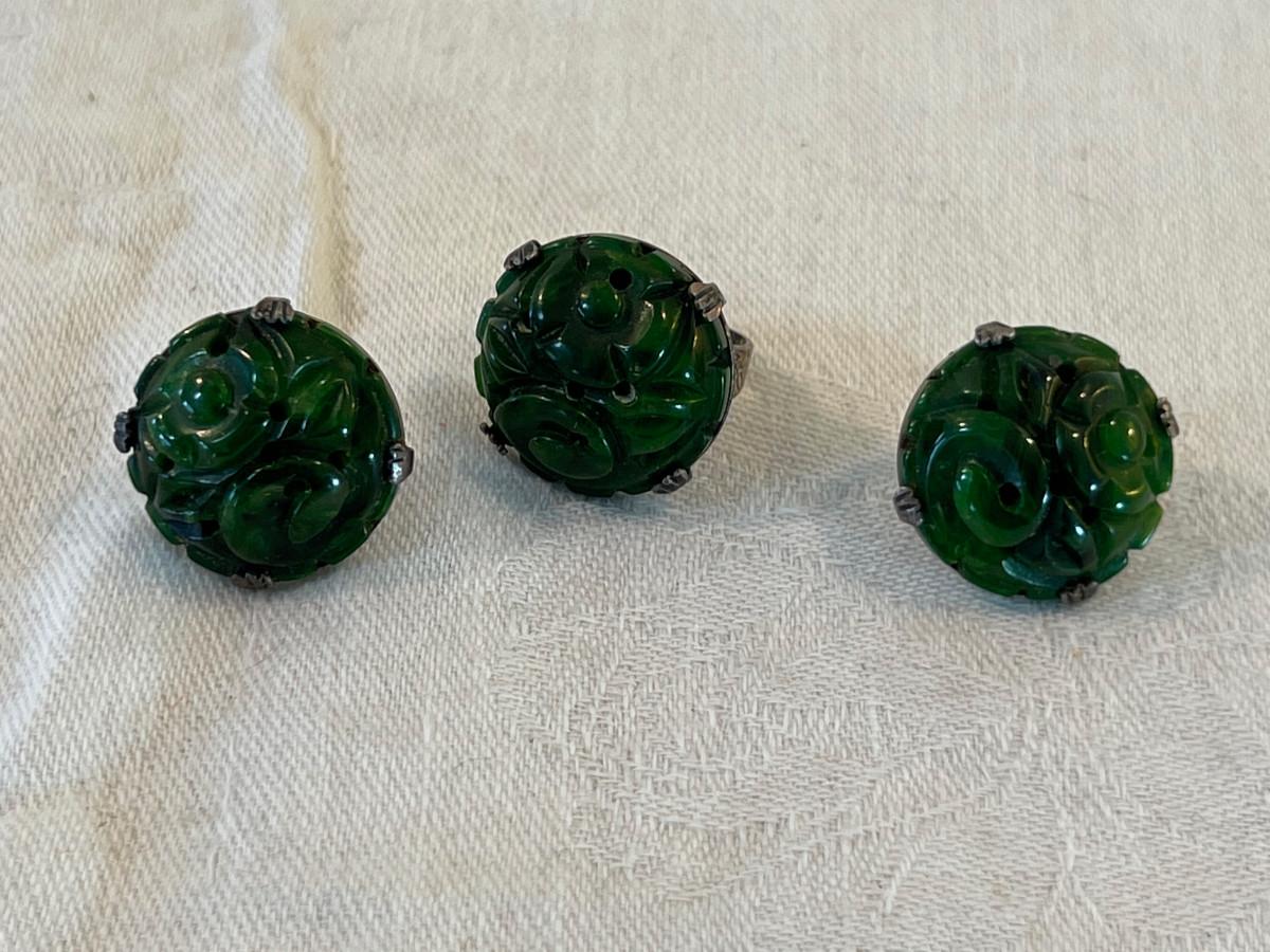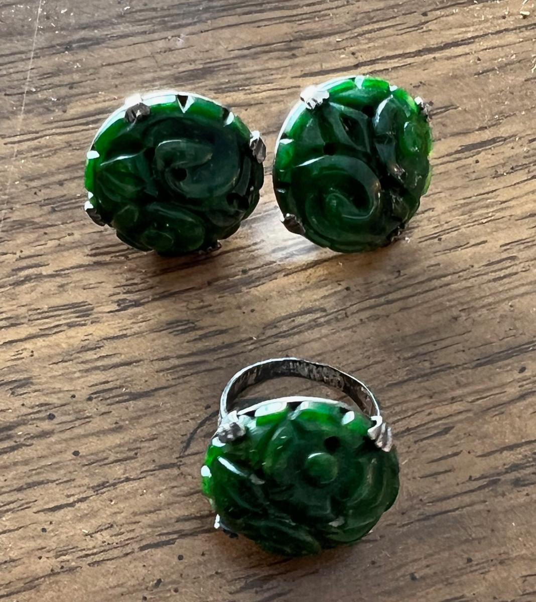 Carved Bakelite Sterling Silver Screwback Earrings and Ring GREEN