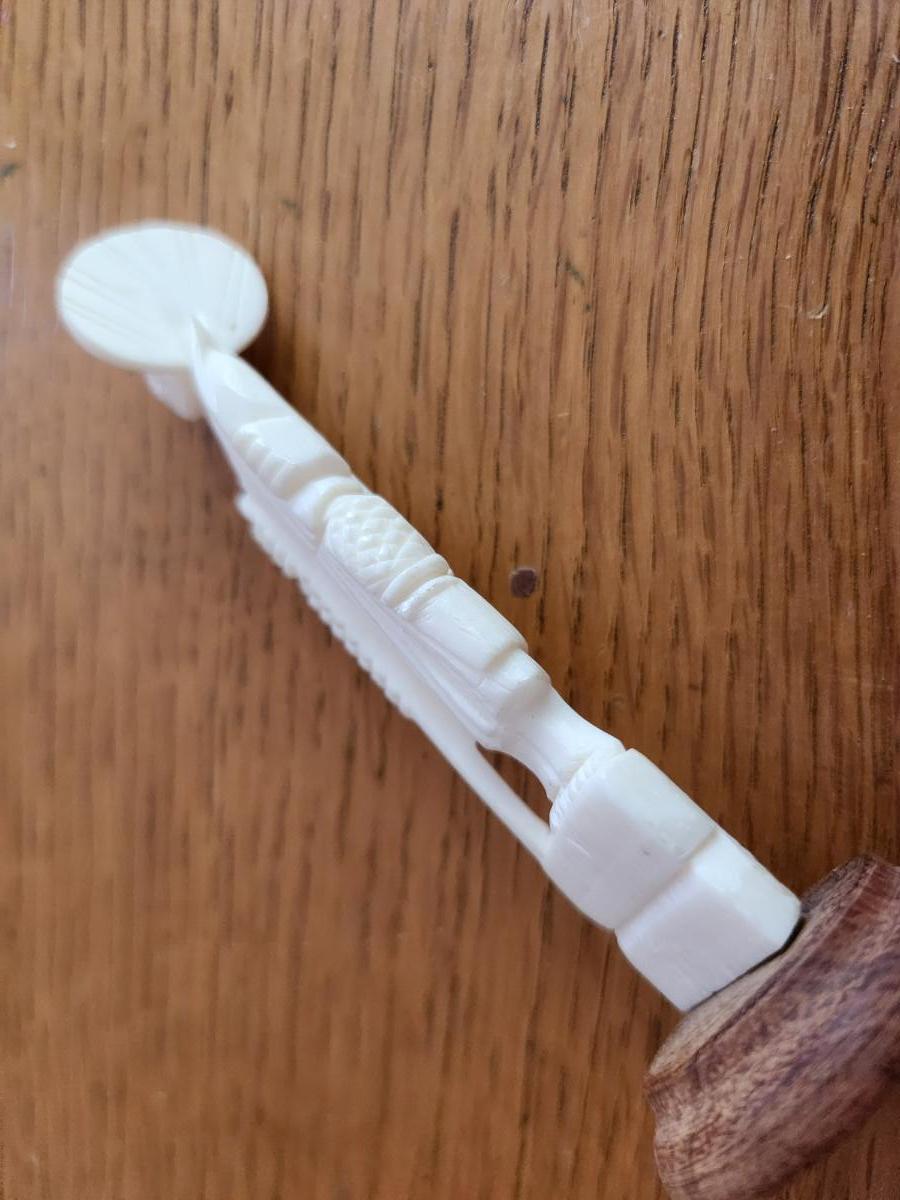 This auction lot is for a Carved Bone Buddha Statuette. This delicate miniature statue is a nice example of tourist art. This handsome item measure about 4.5-inches and sits on a wood stand. A nice collectible item. Most probably carved from a large bone of some type.