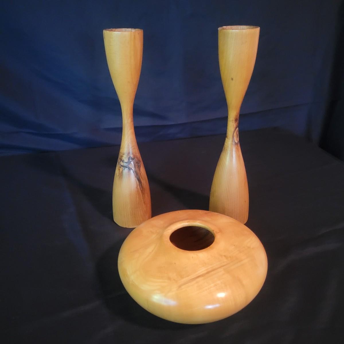 Carved Birdseye Maple Bowl and Candlesticks (GR-DW)