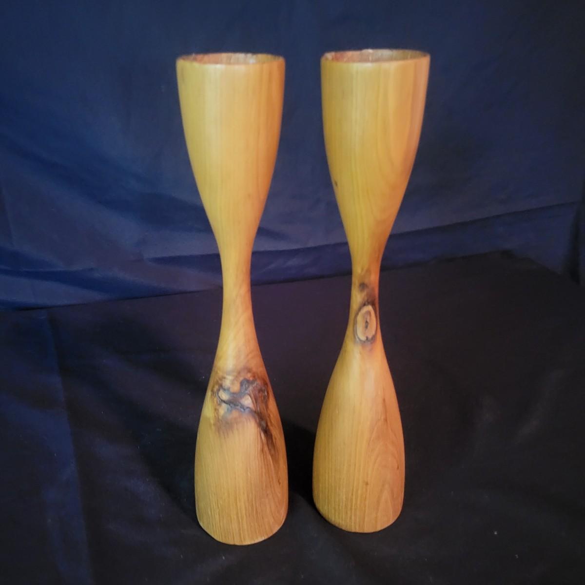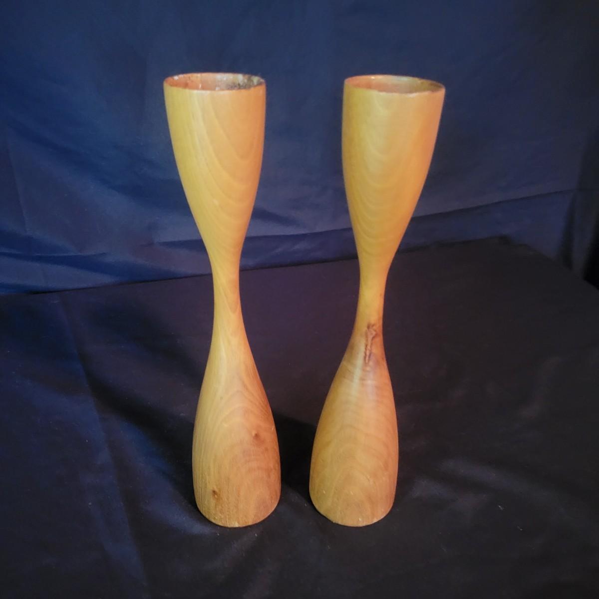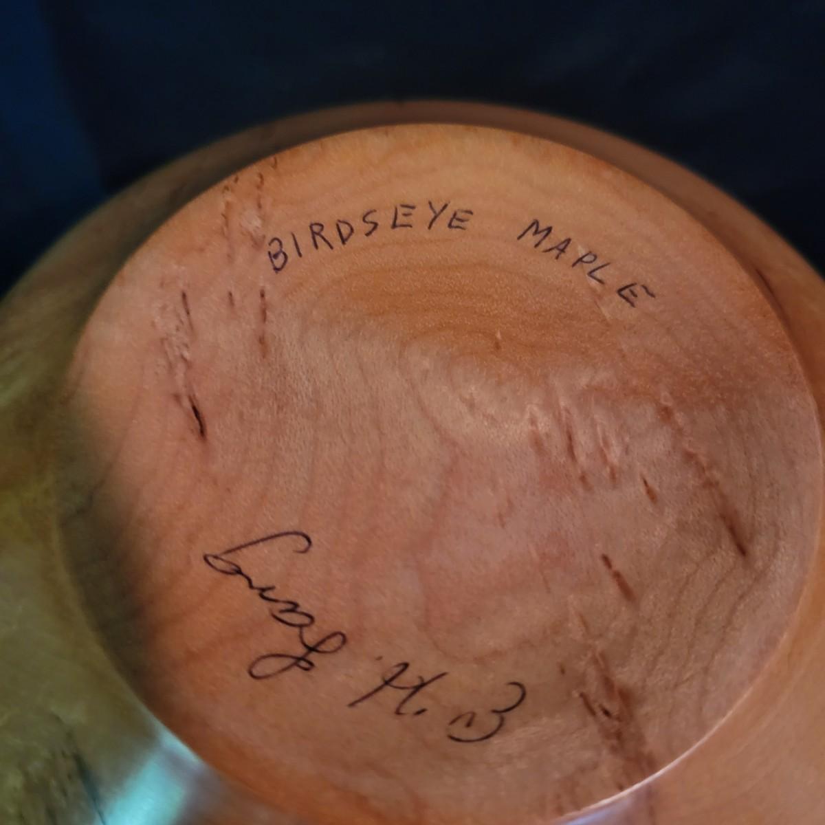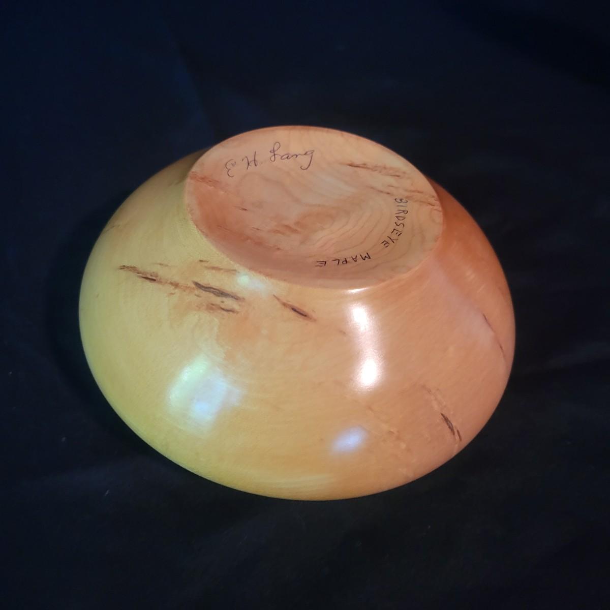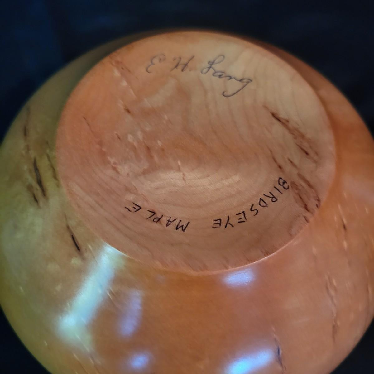 A carved birdseye maple bowl by E.H. Lang. This bowl has a natural finish to show the beauty of the birdseye maple. This lot also includes two carved wooden candlesticks that measure approximately 2" x 10". They have wax residue from past use. Shipping available.