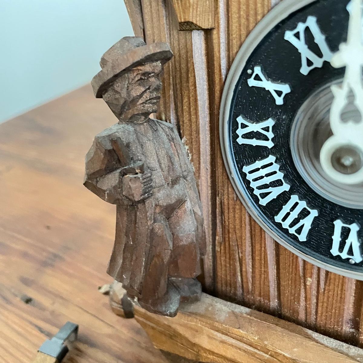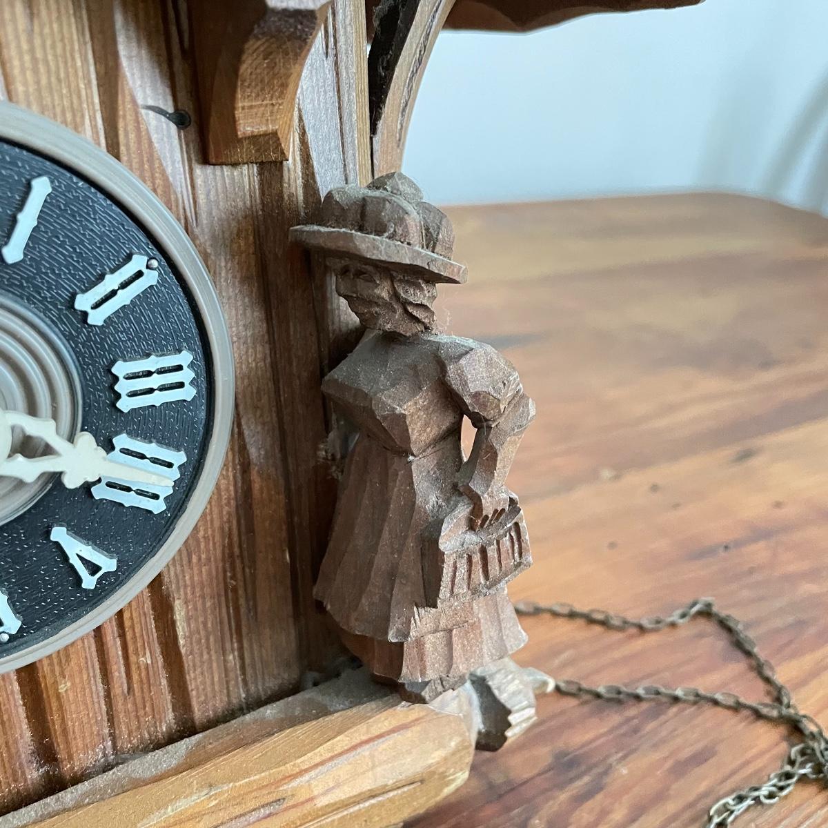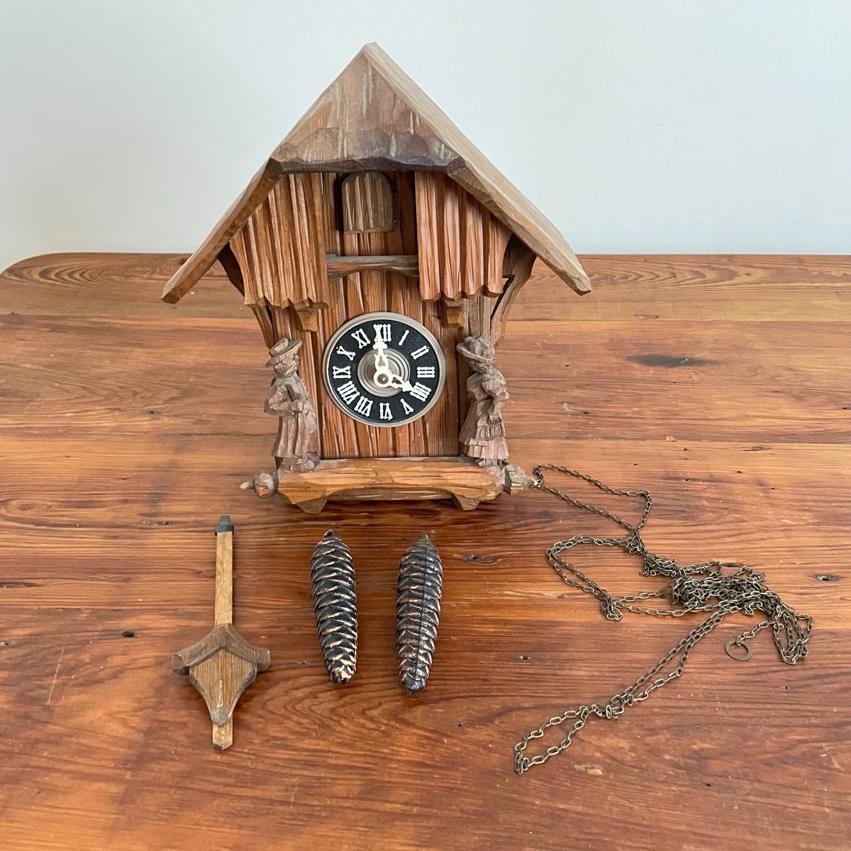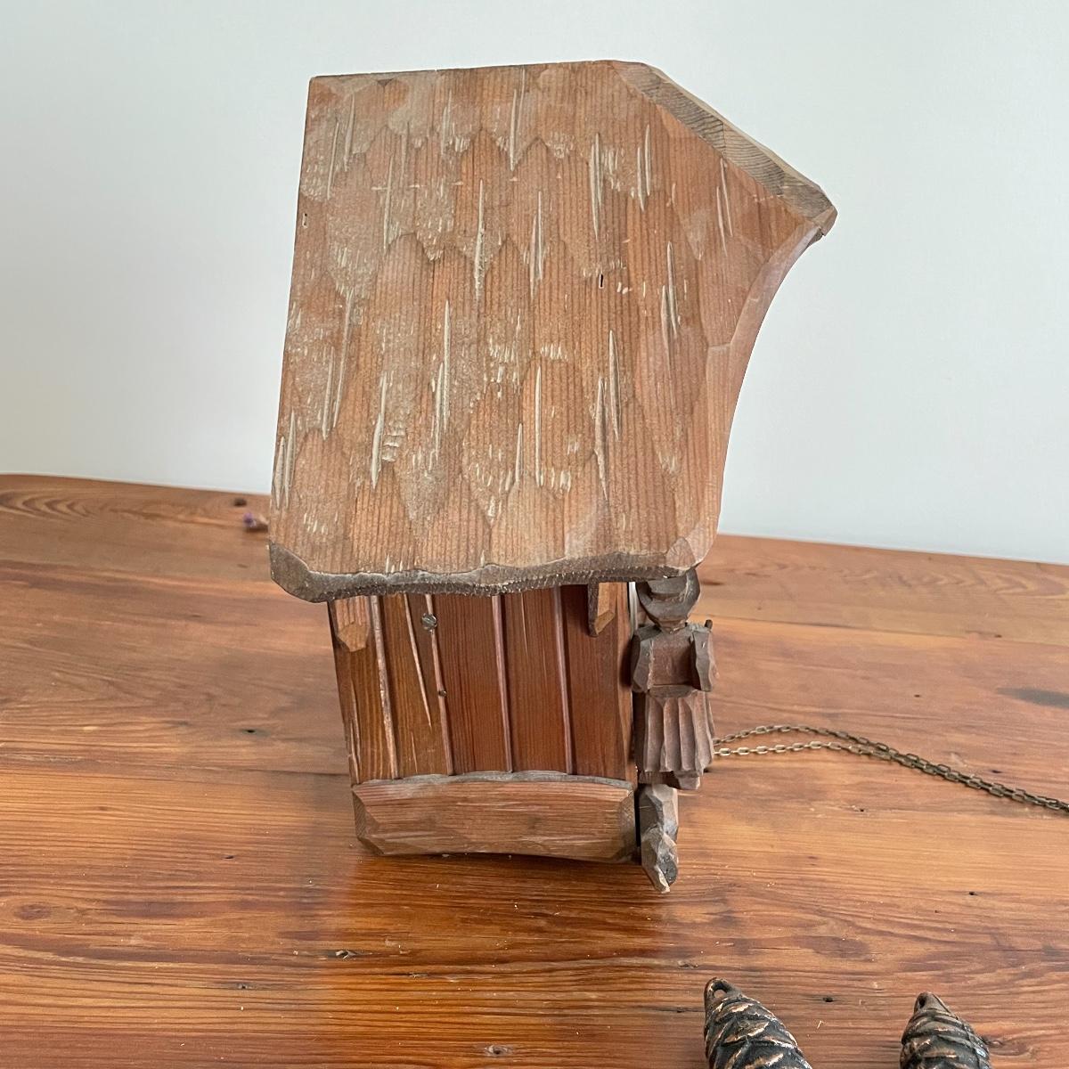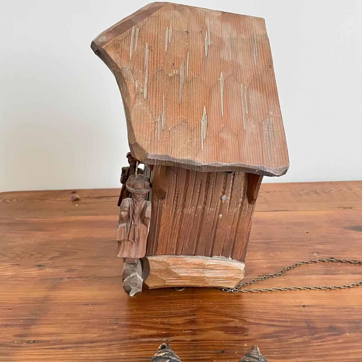All wood house Cuckoo Clock with carved figures and a painted bird. Two weights and a wooden pendulum leaf. The chains have a small tangle. House measures approximately 10” x 5” x 10”. Note clock is stamped, "Made in West Germany." Shipping available.