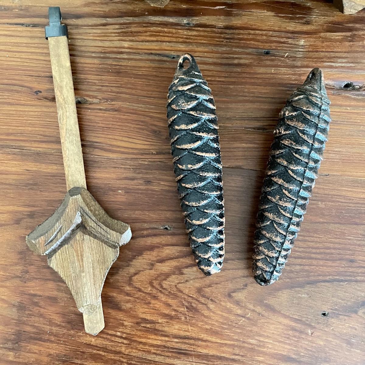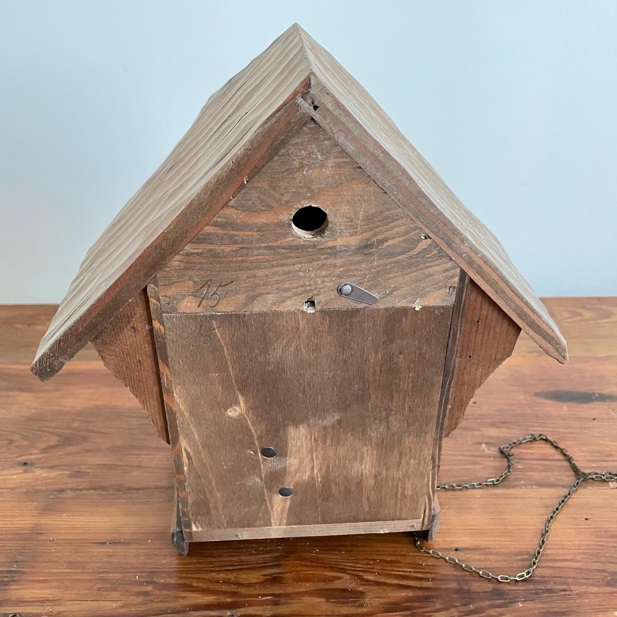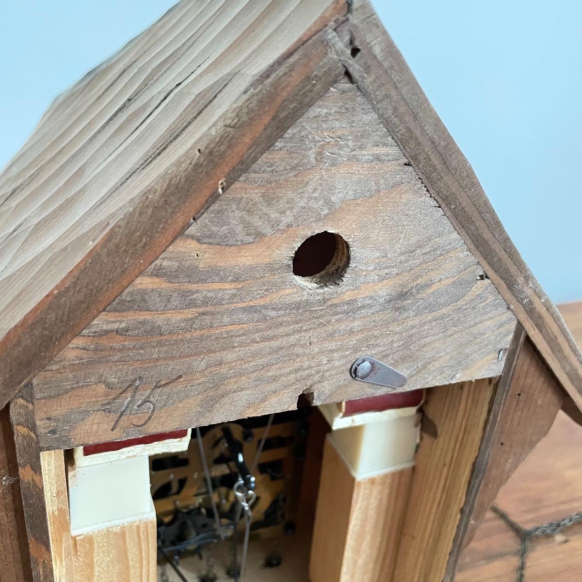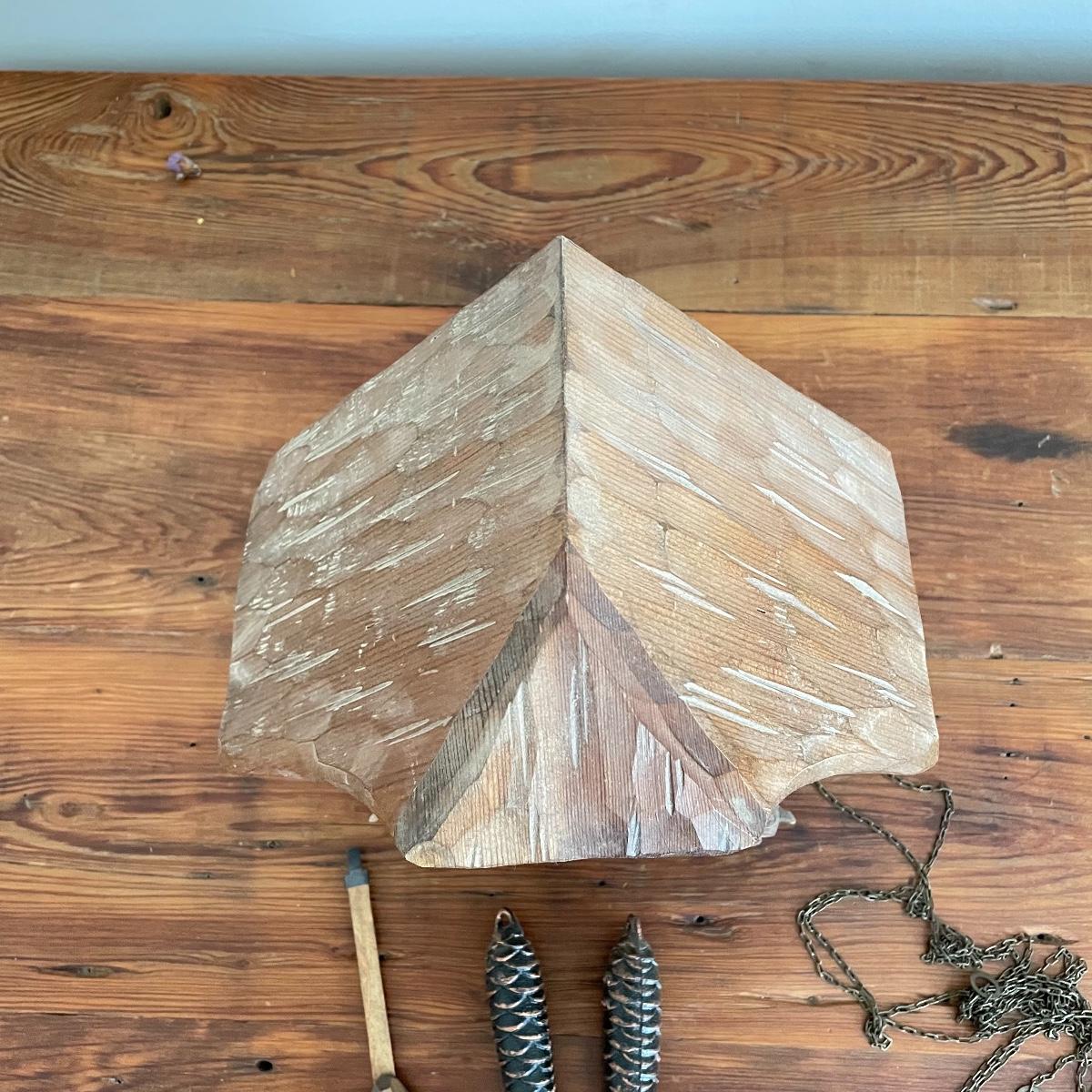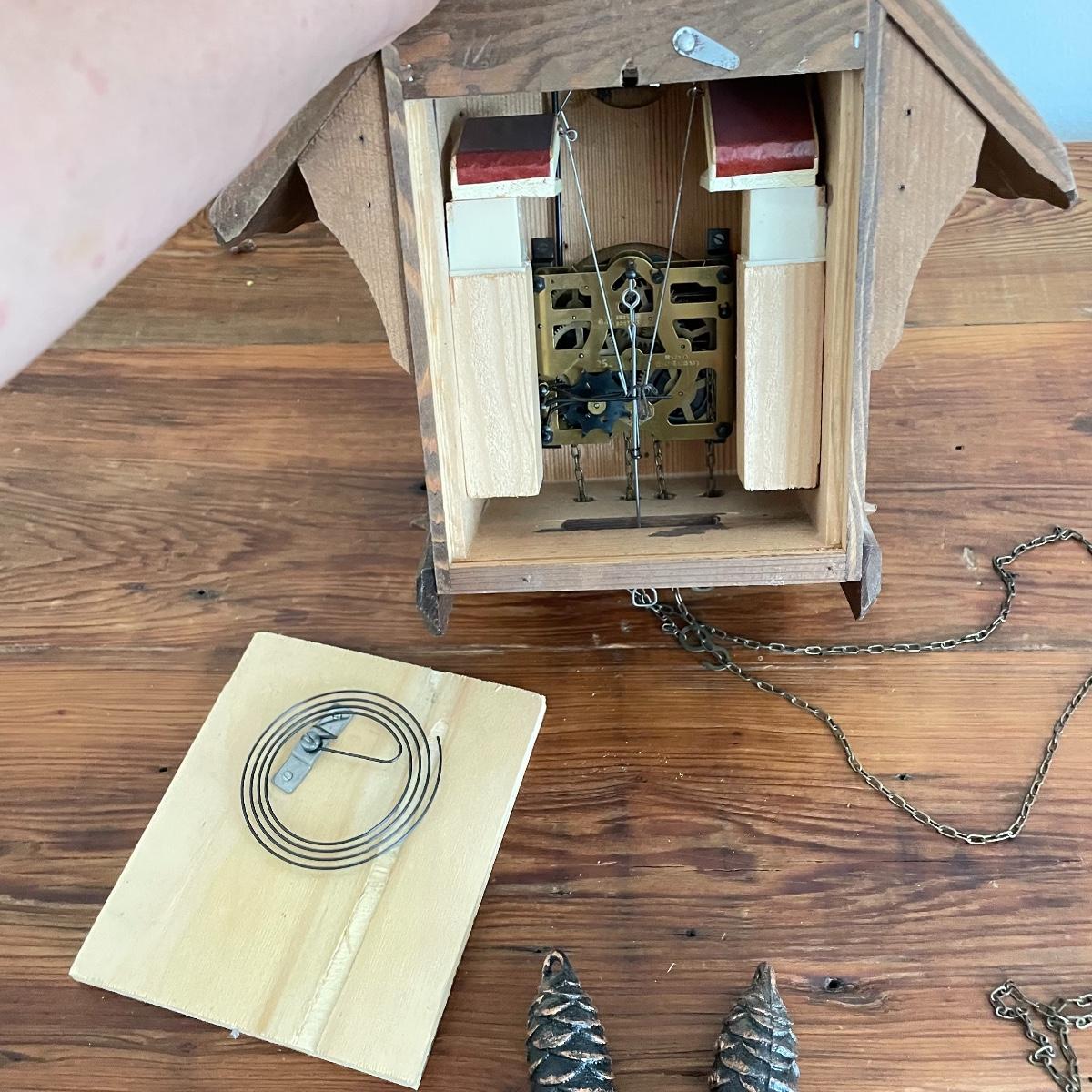 All wood house Cuckoo Clock with carved figures and a painted bird. Two weights and a wooden pendulum leaf. The chains have a small tangle. House measures approximately 10” x 5” x 10”. Note clock is stamped, "Made in West Germany." Shipping available.