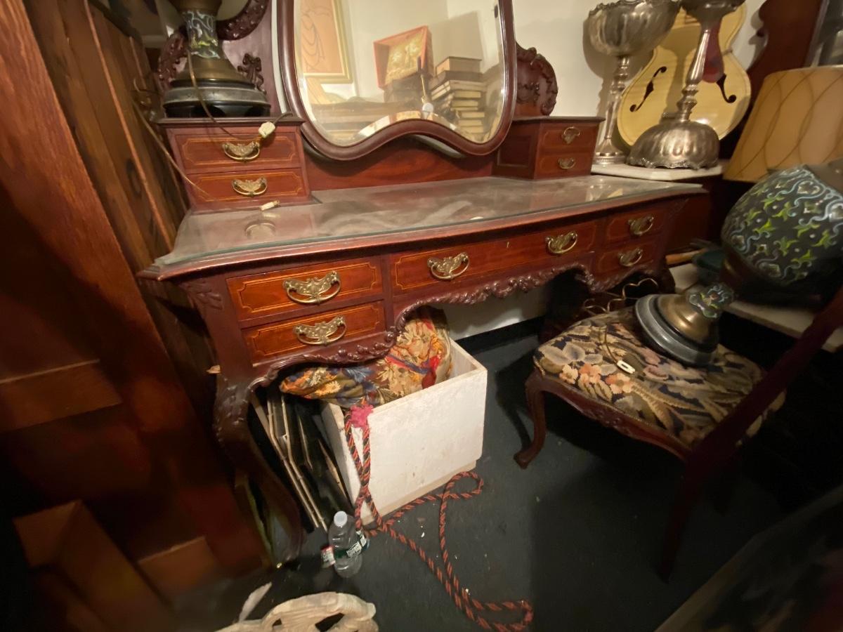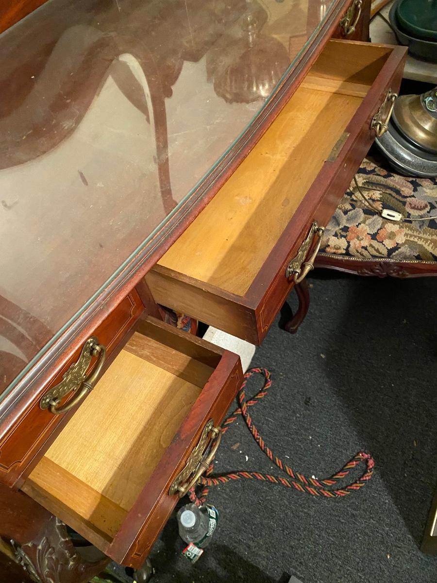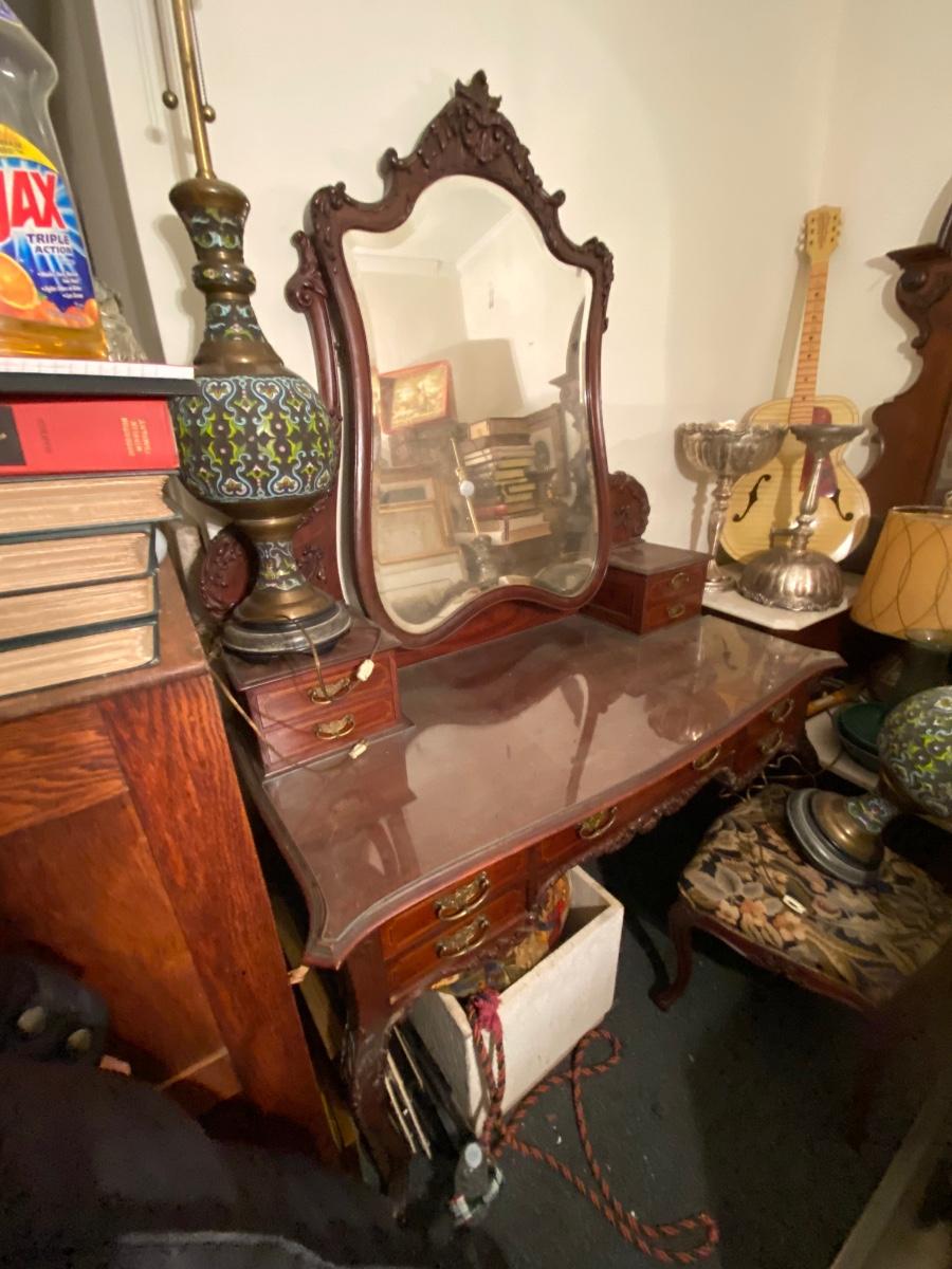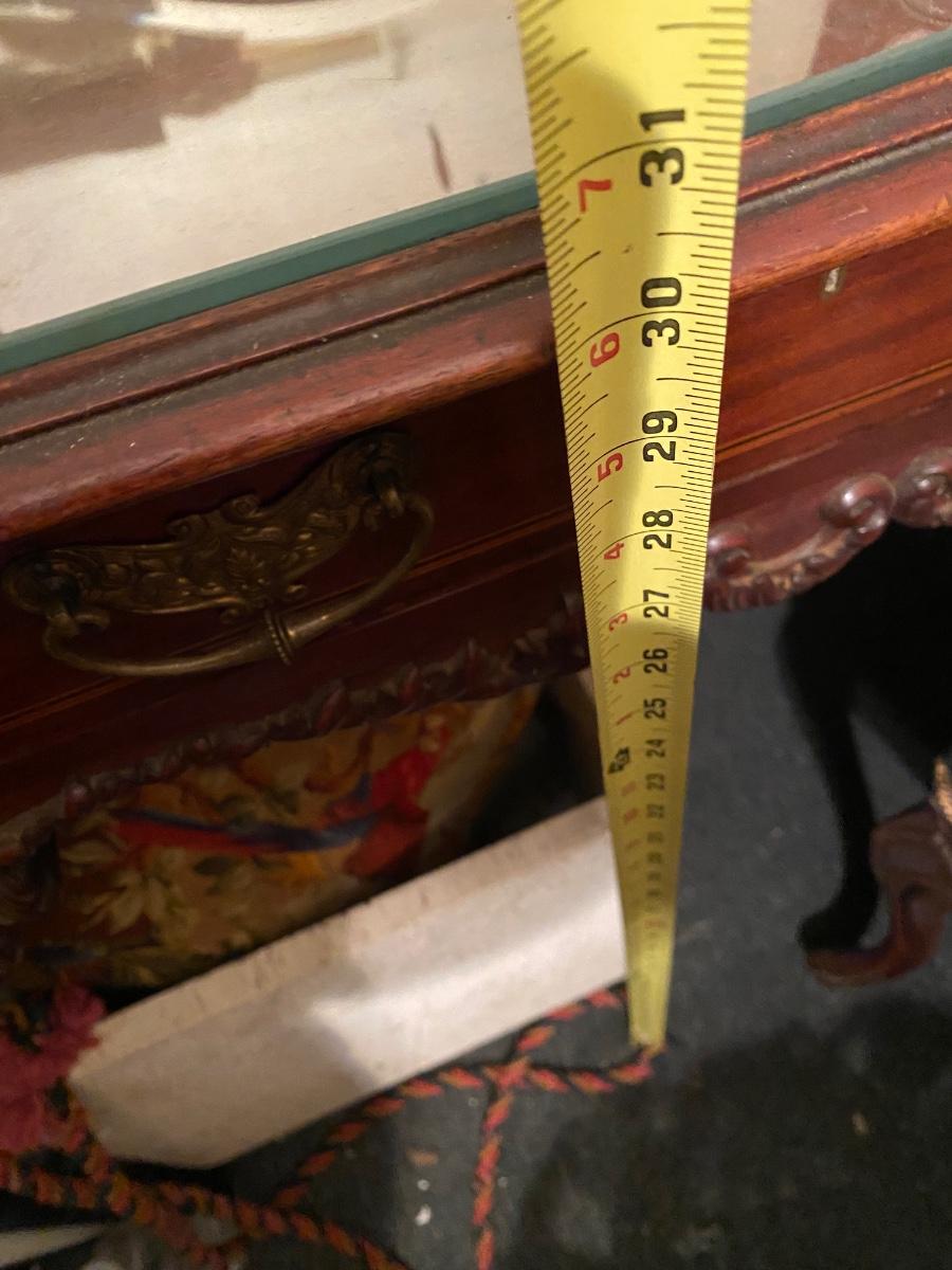 Antique vanity with Mirror. Has custom cut glass cut for the top. Lovely brass pull on drawers. Claw foot details. 47" w 23" d. 30" from floor to top of vanity, 72" to top of mirror. Stunning piece. Bob's furniture will never last this long.