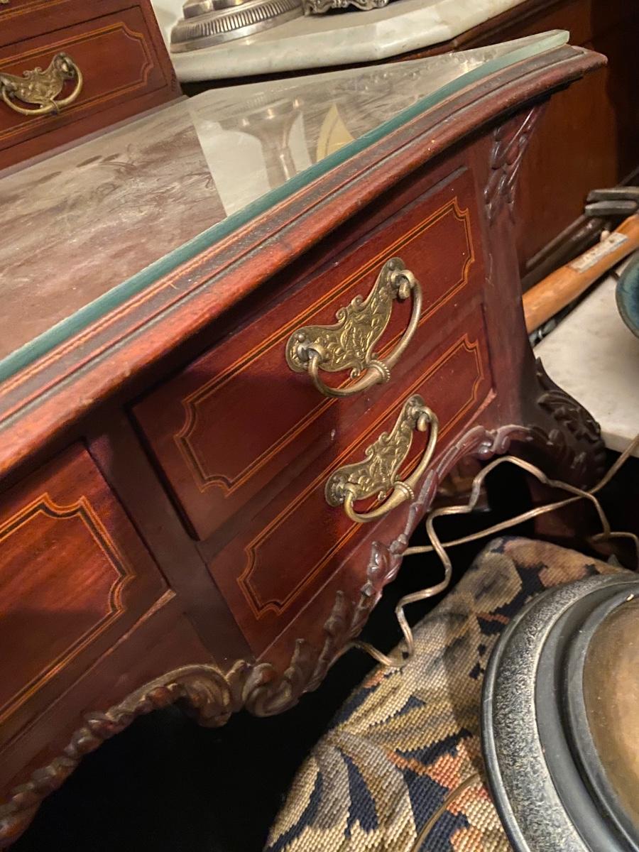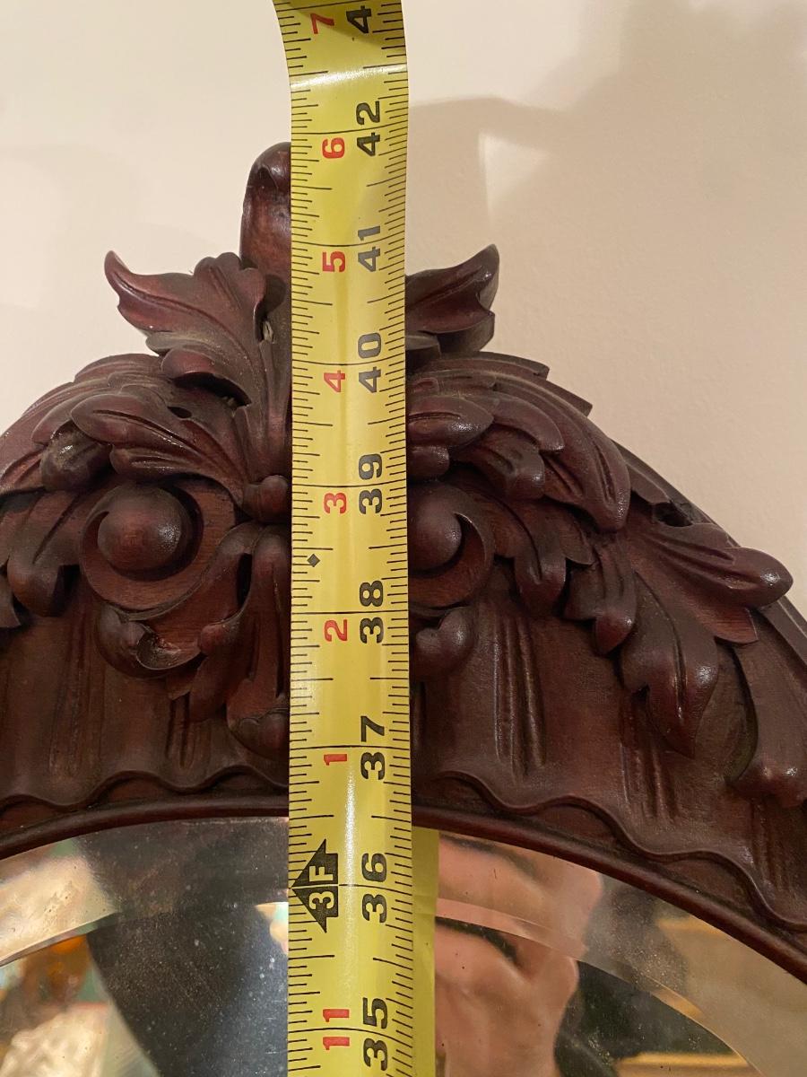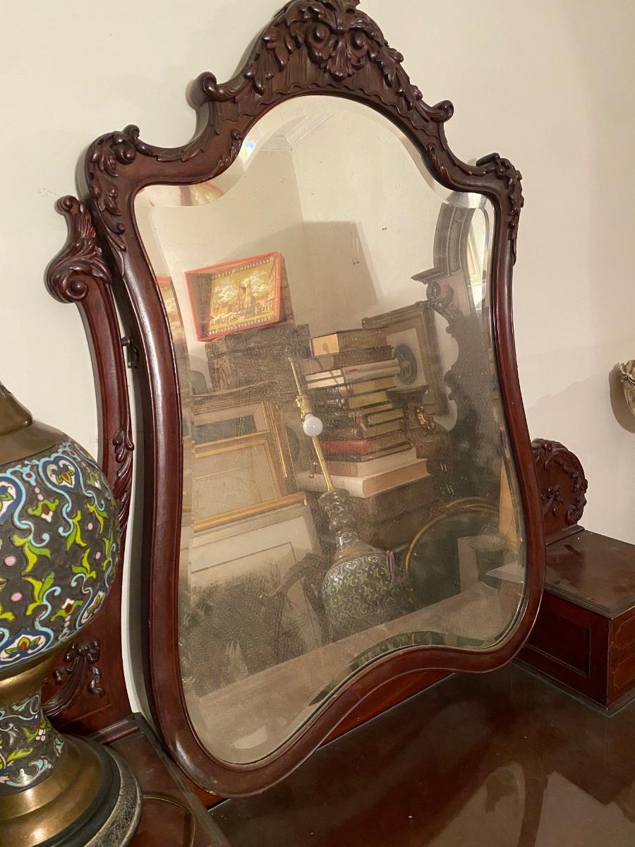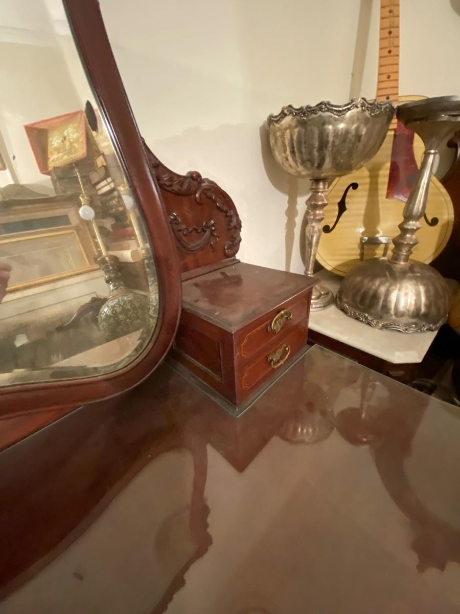 Antique vanity with Mirror. Has custom cut glass cut for the top. Lovely brass pull on drawers. Claw foot details. 47" w 23" d. 30" from floor to top of vanity, 72" to top of mirror. Stunning piece. Bob's furniture will never last this long.