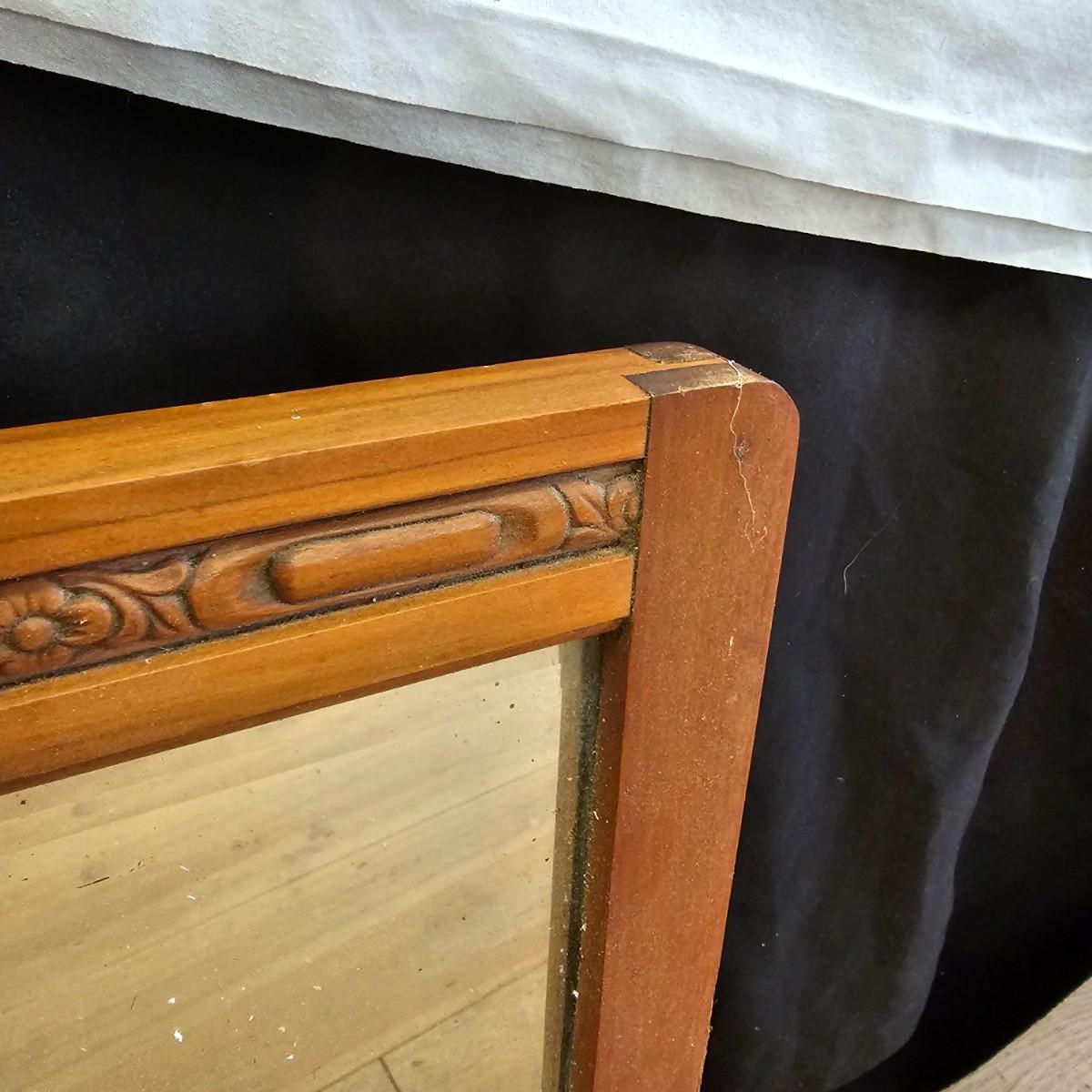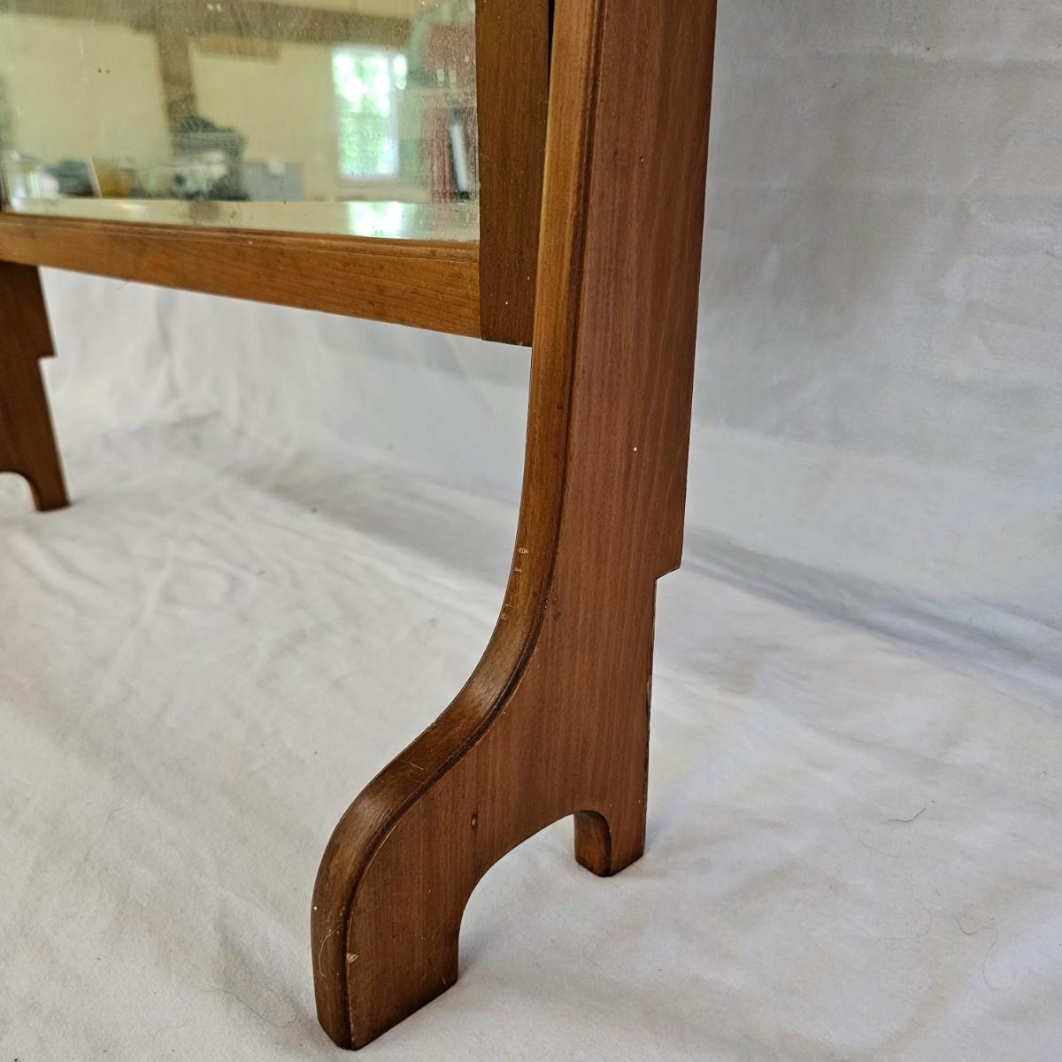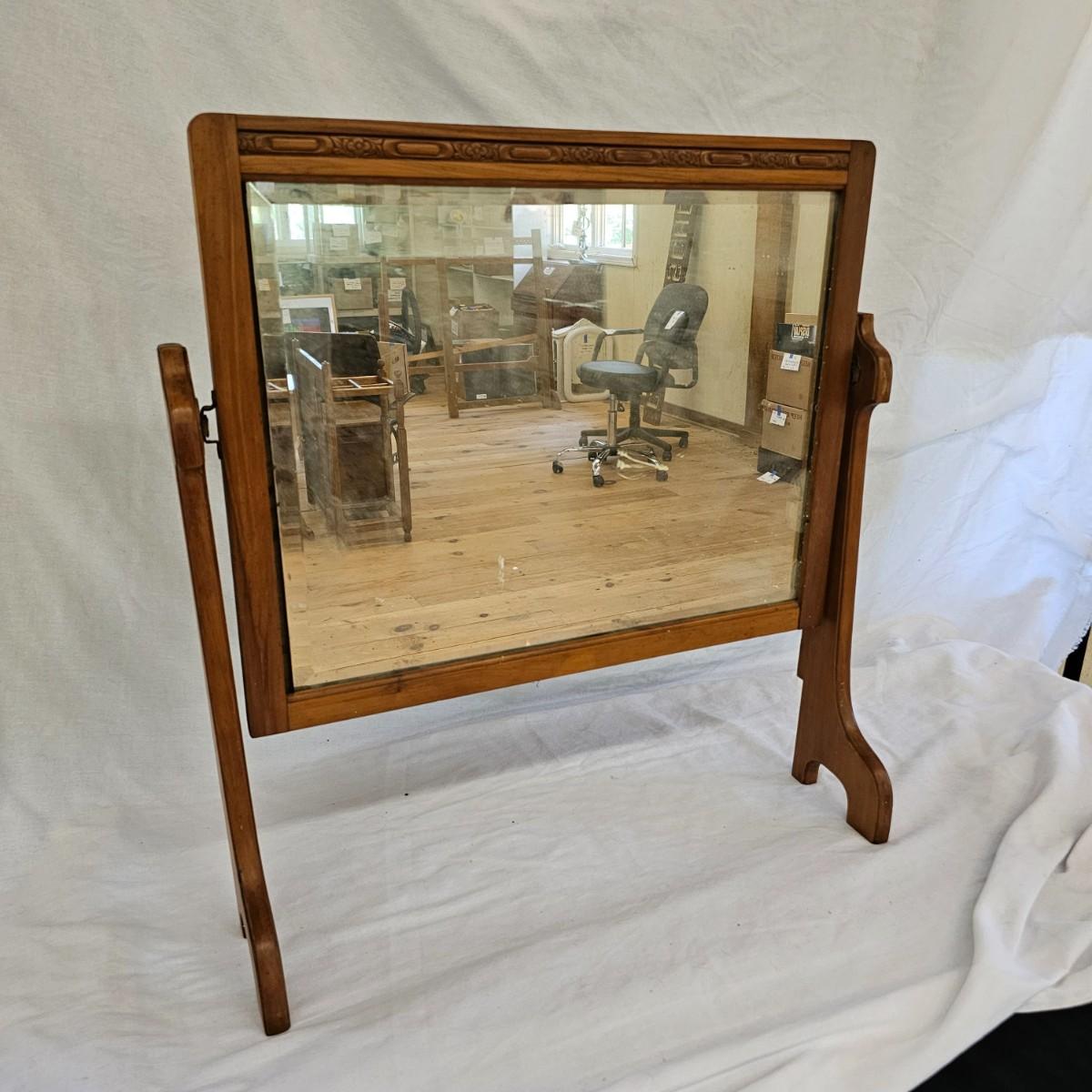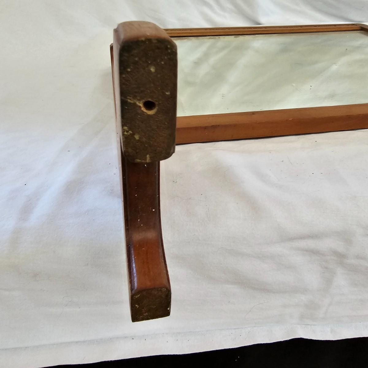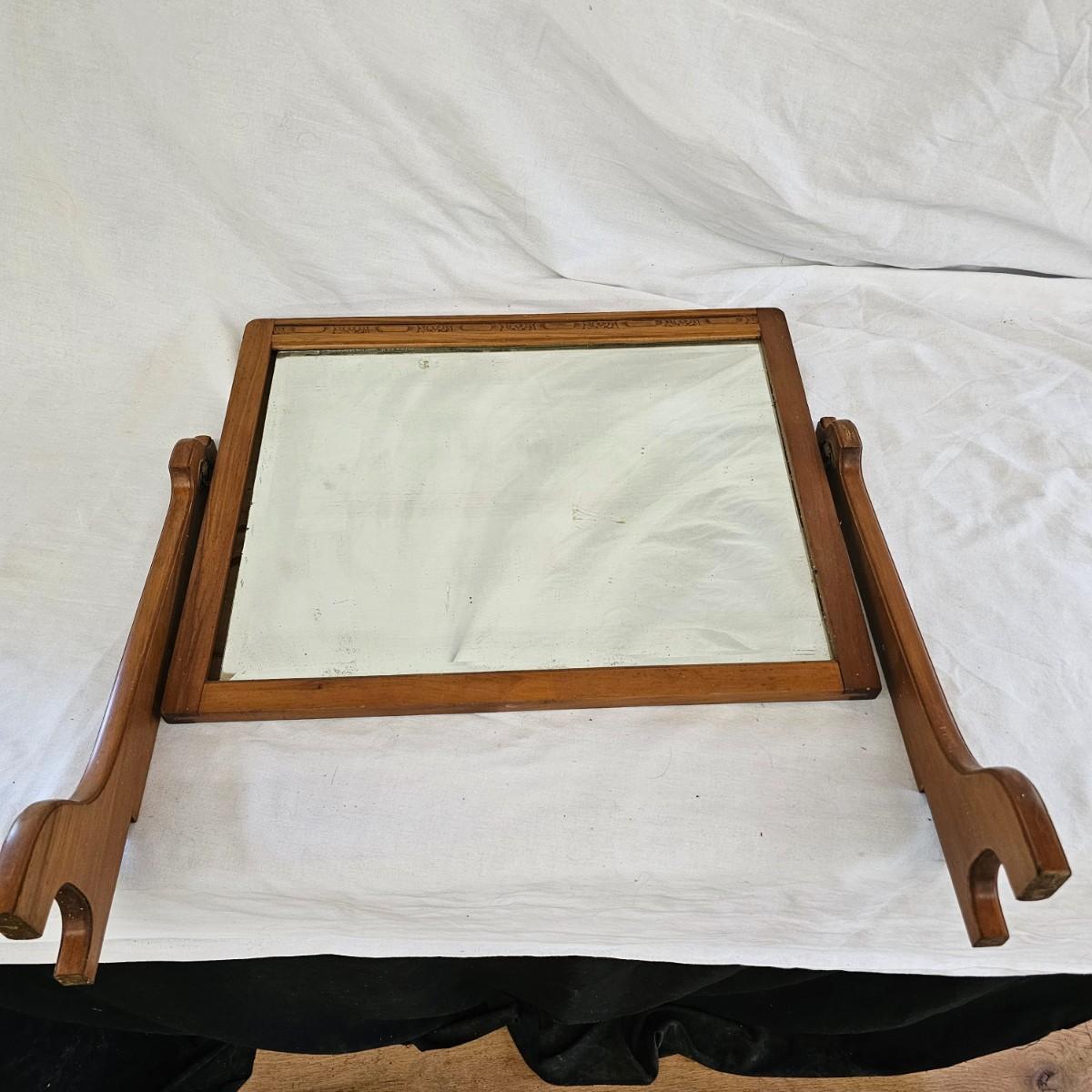 Small mirror with side supports for top of dresser or other. Supports are notched at bottom to accommodate mounting, also have holes in bottom. Supports measure 6" x 20.5"H. Mirror has carved flower pattern across top, measures 23" x 18.5" H. With supports it is 25.5" x 26.5" H. Mirror hangs in brackets on supports, see photos for details. Local pickup only.