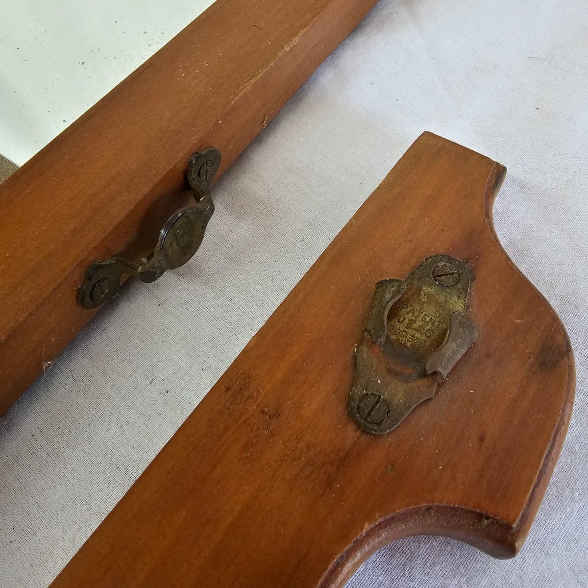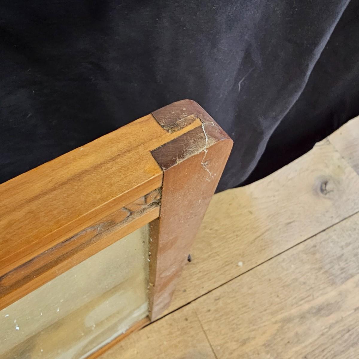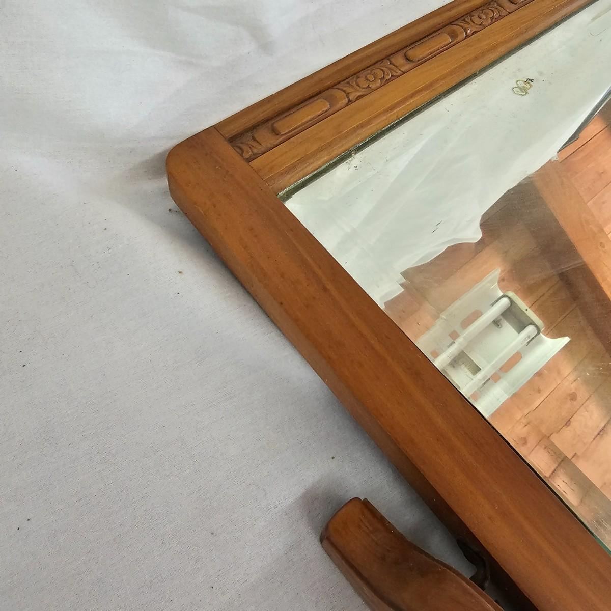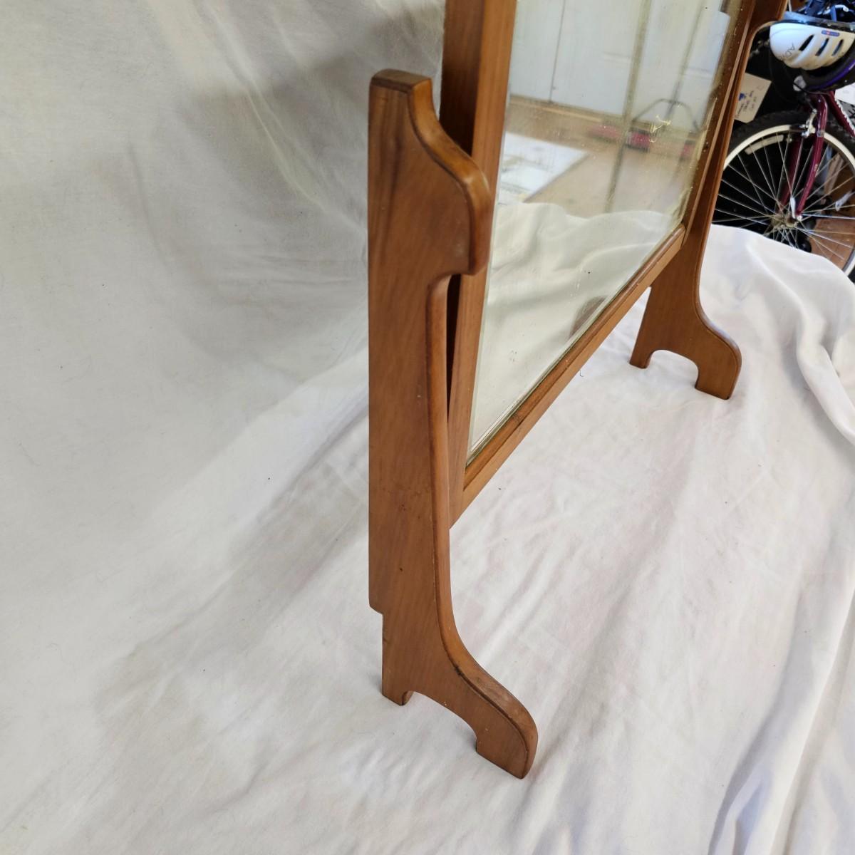 Small mirror with side supports for top of dresser or other. Supports are notched at bottom to accommodate mounting, also have holes in bottom. Supports measure 6" x 20.5"H. Mirror has carved flower pattern across top, measures 23" x 18.5" H. With supports it is 25.5" x 26.5" H. Mirror hangs in brackets on supports, see photos for details. Local pickup only.