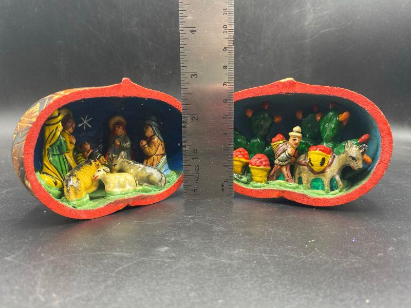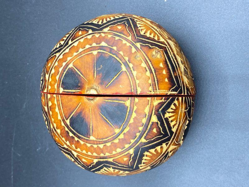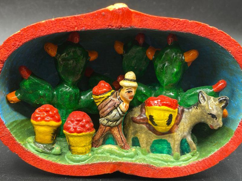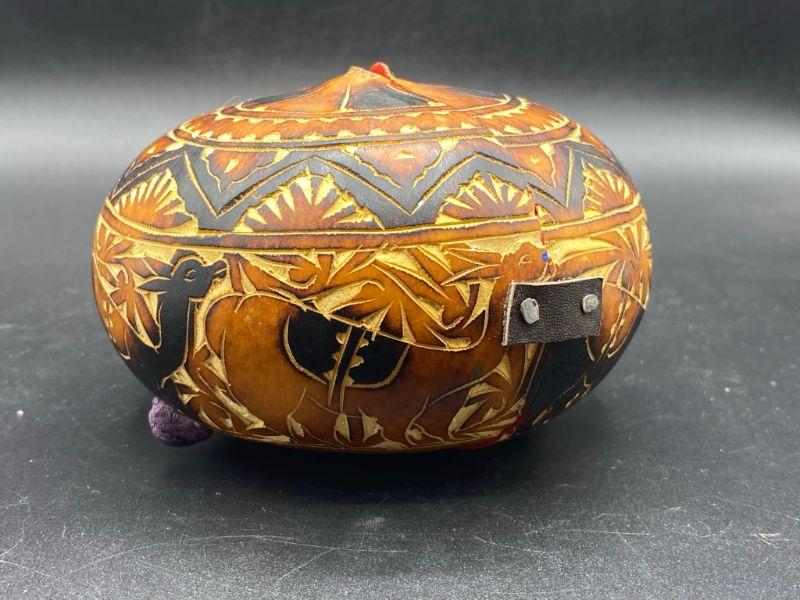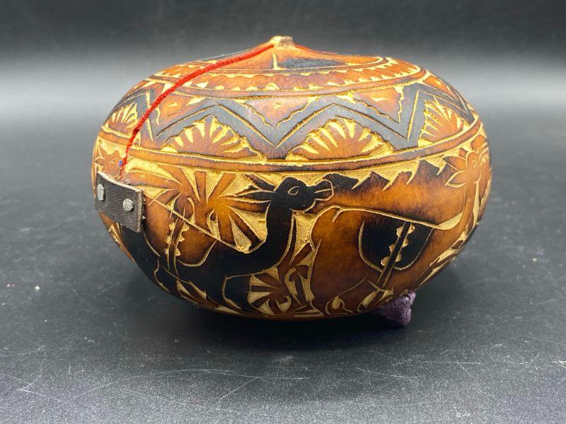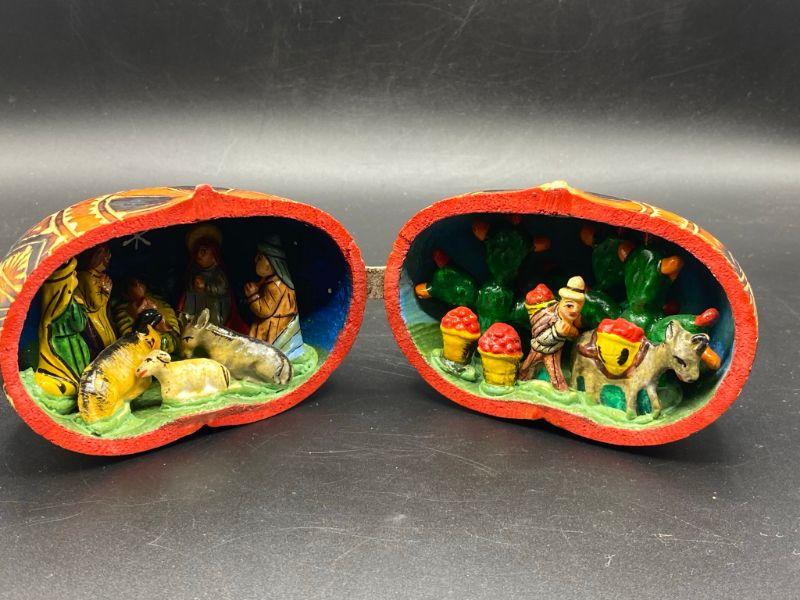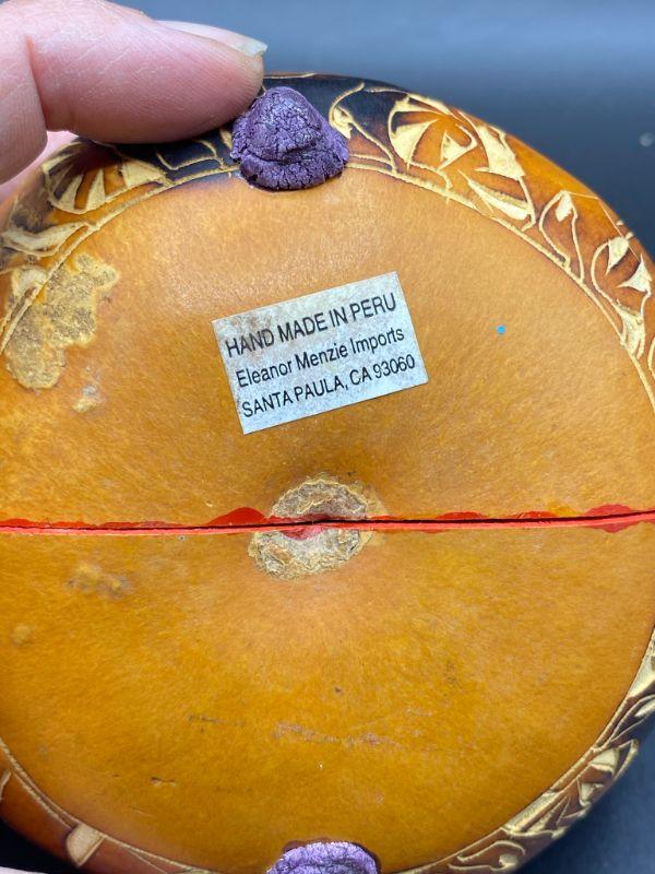 Hand made in Peru, a highly detailed carved gourd. Outside has man with llamas and designs. Inside is a nativity on one side and a man & donkey with a bounty of crops. Well done work. Leather hinge. Colorful inside. Imported by a California Company.