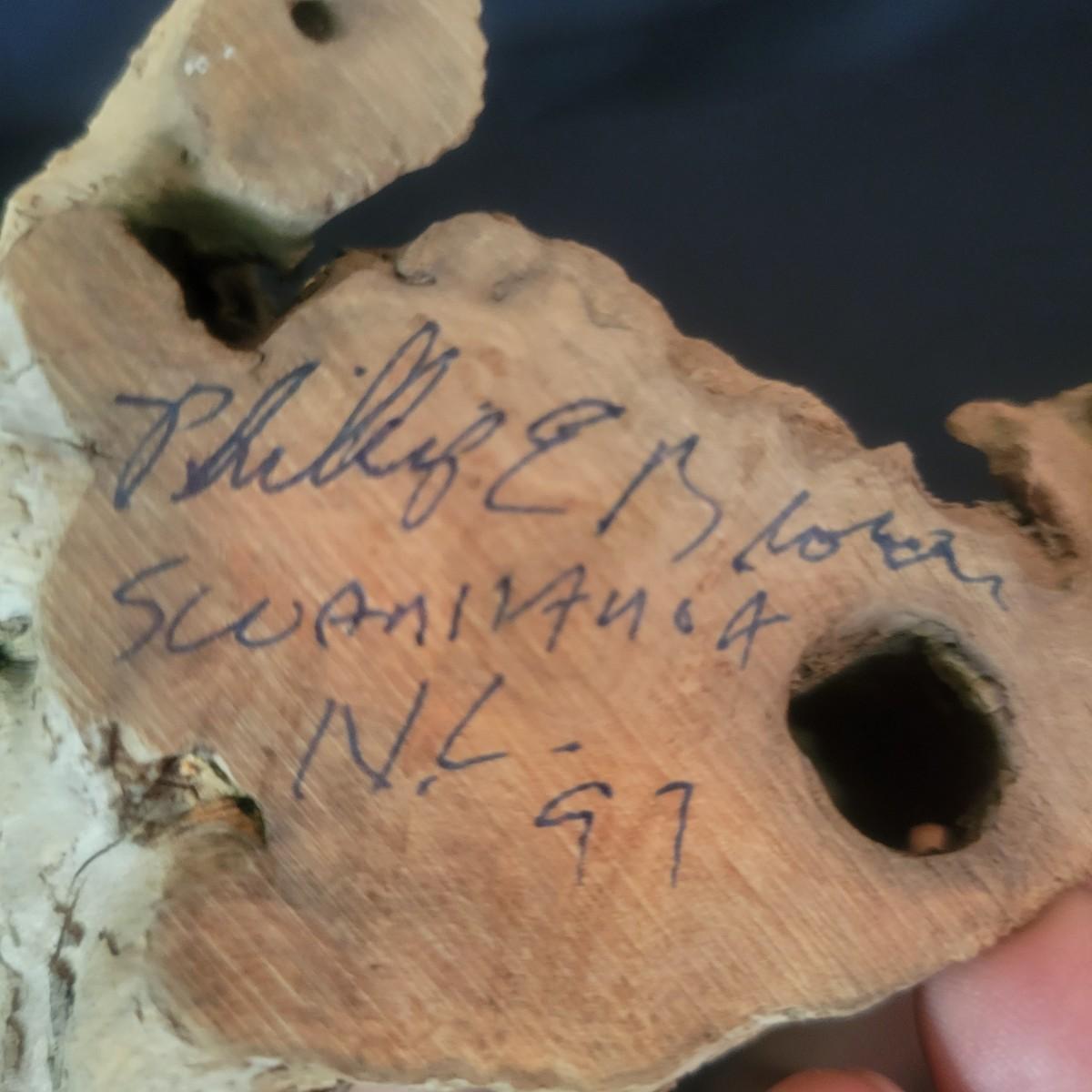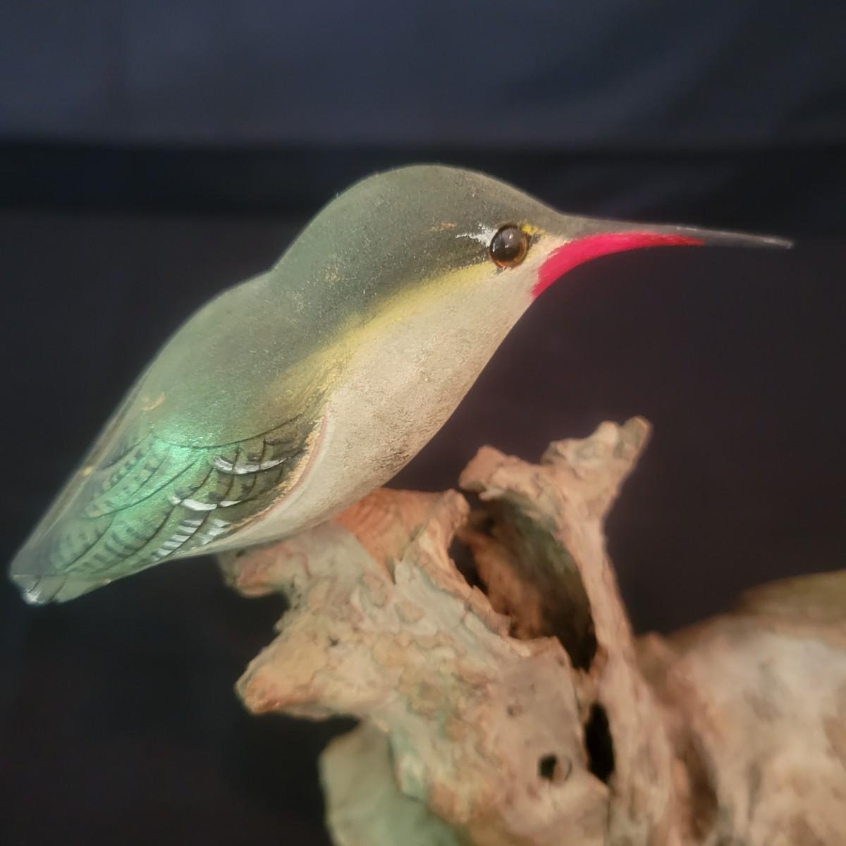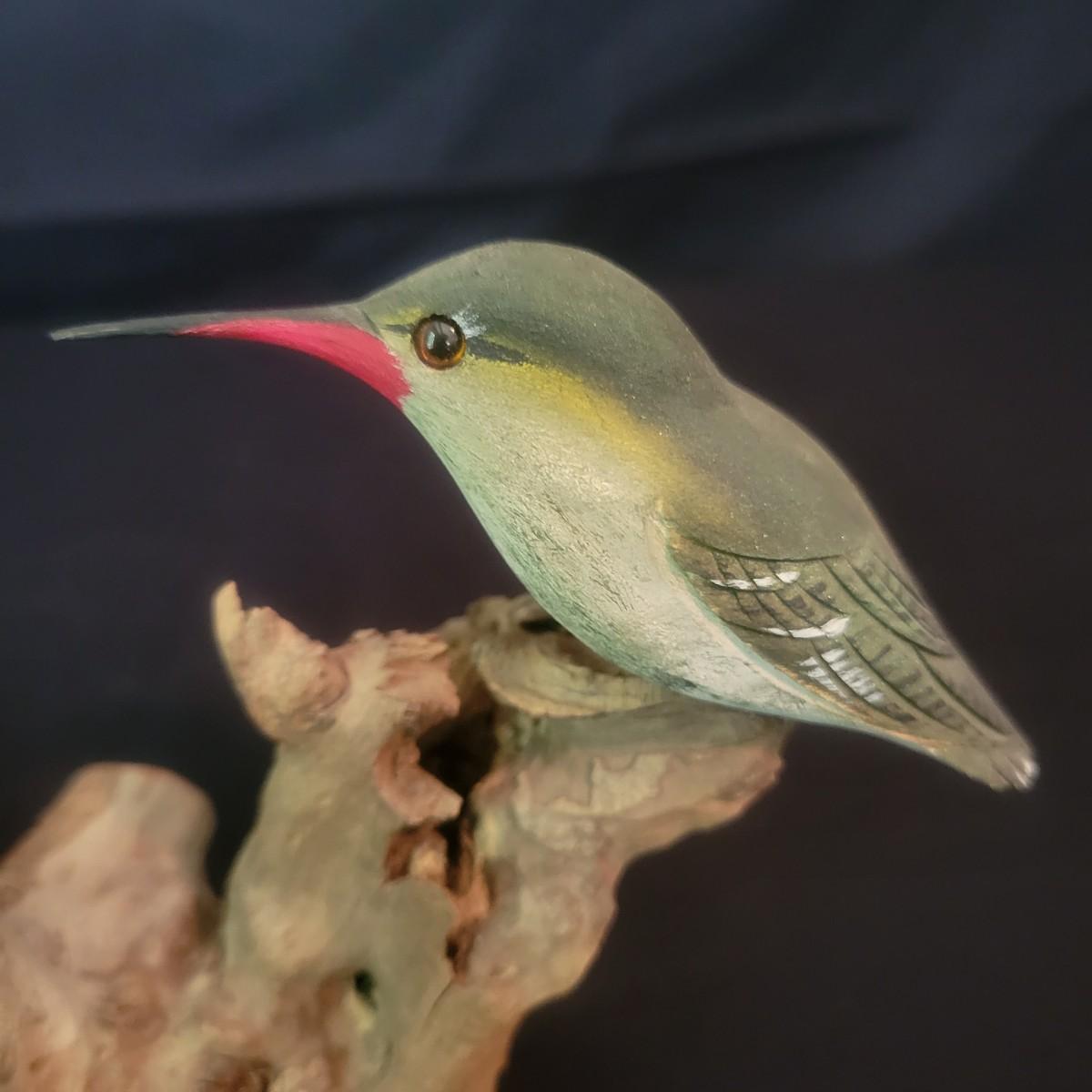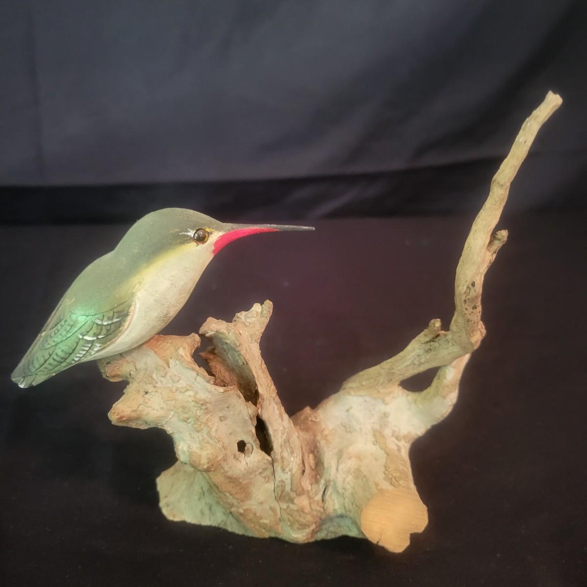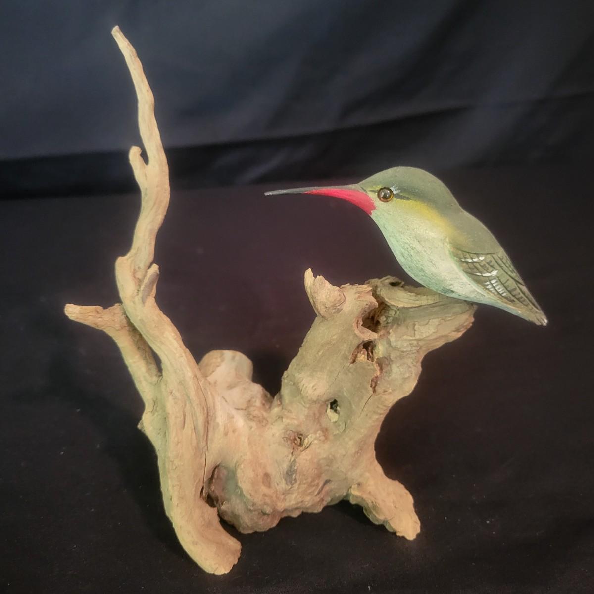 A carved hummingbird on driftwood by renowned local carver Phillip E. Brown. This piece measures approximately 4" x 3.5" x 6"H. Shipping available