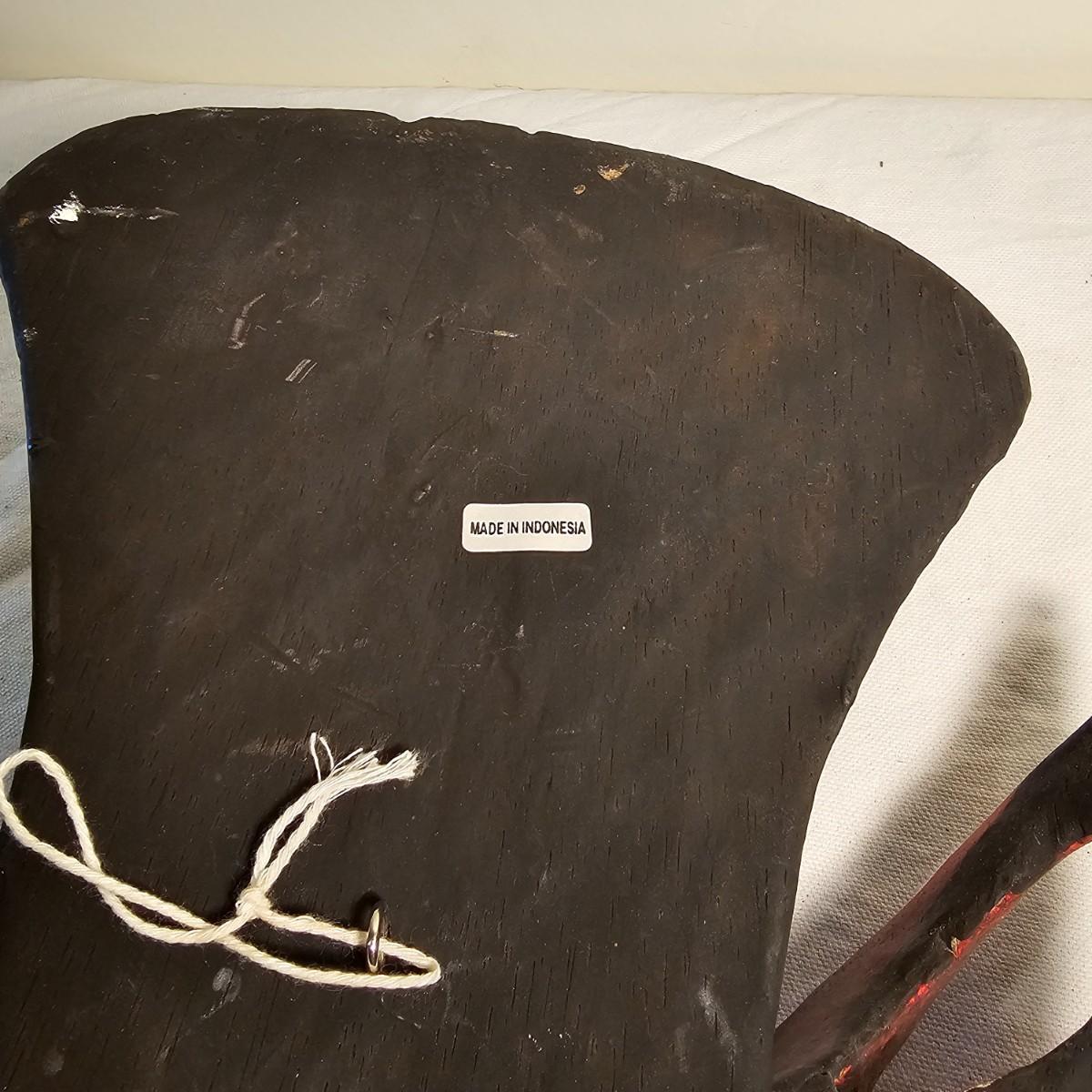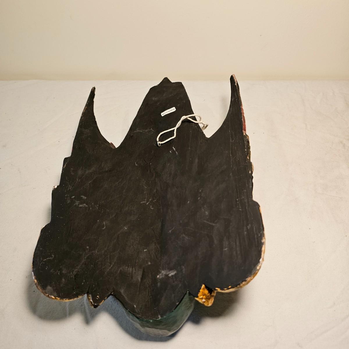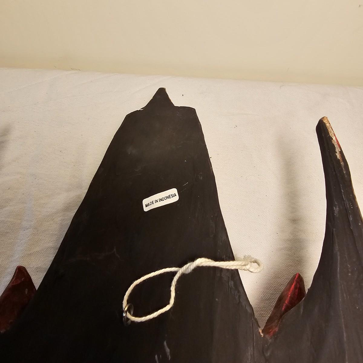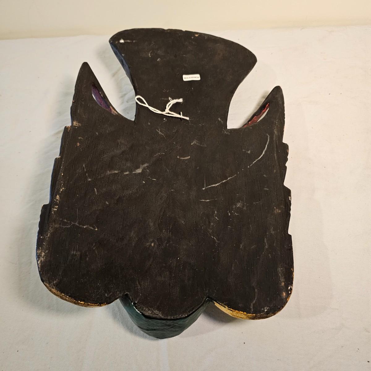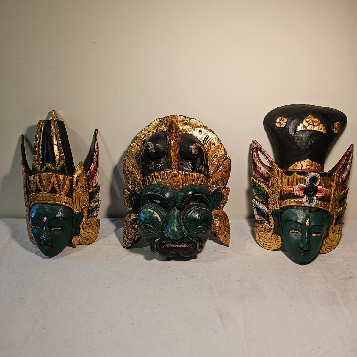 Three carved wooden decorative masks. Items are brightly painted Indonesian style relics. Largest mask is 10" x 5" x 13"H. The mid size is 9" x 4" x 14"H. The smallest is 8" x 4" x 13"H. See photos for details. Shipping available.