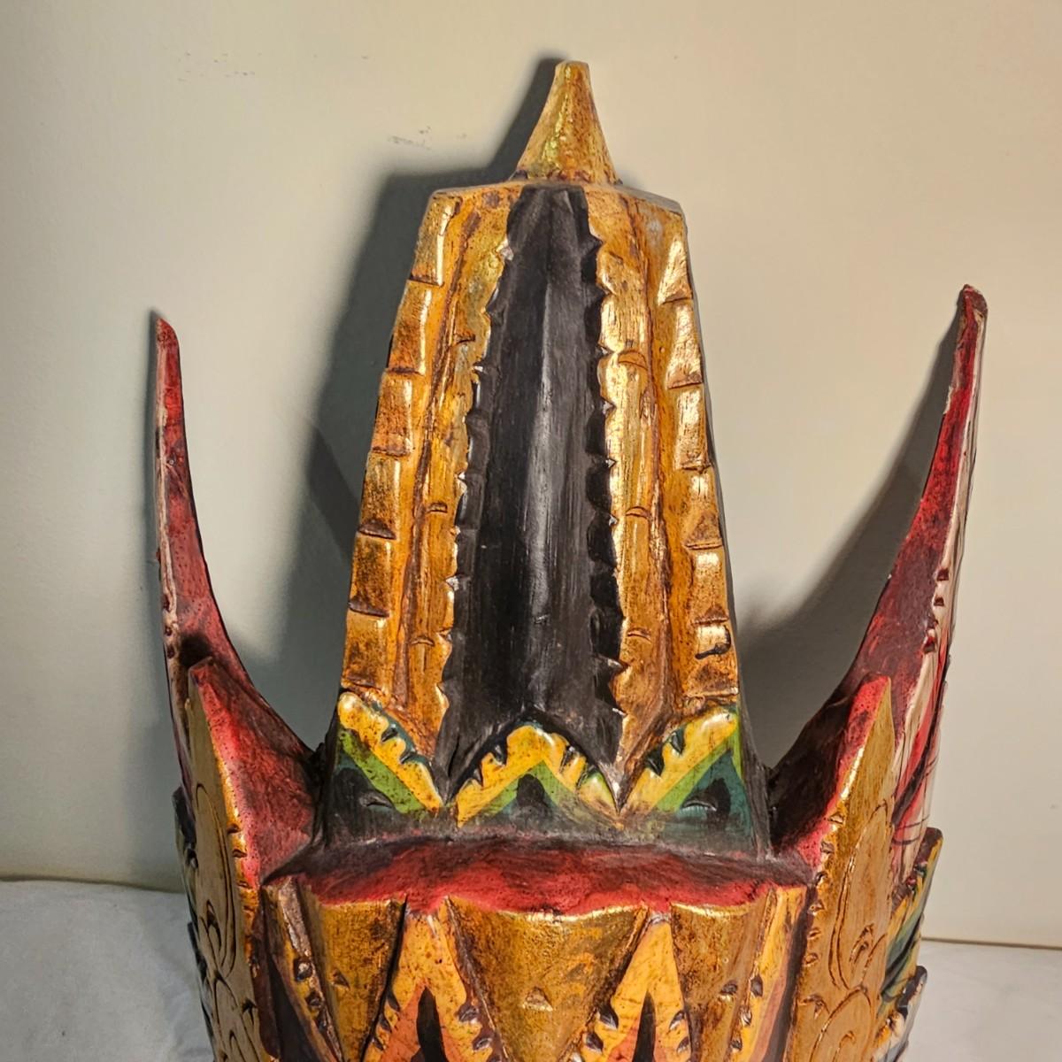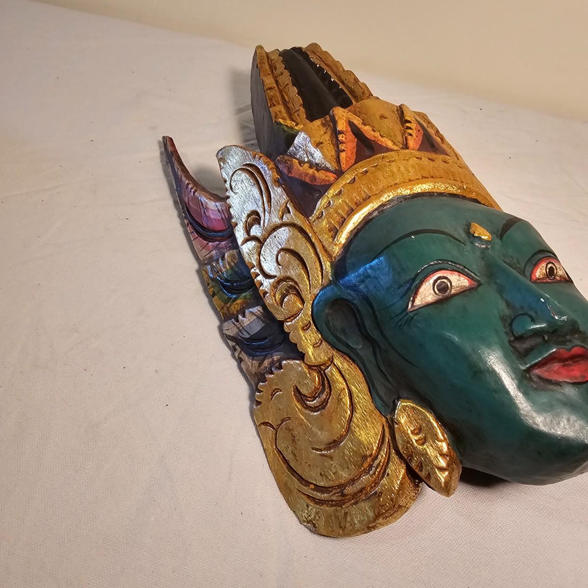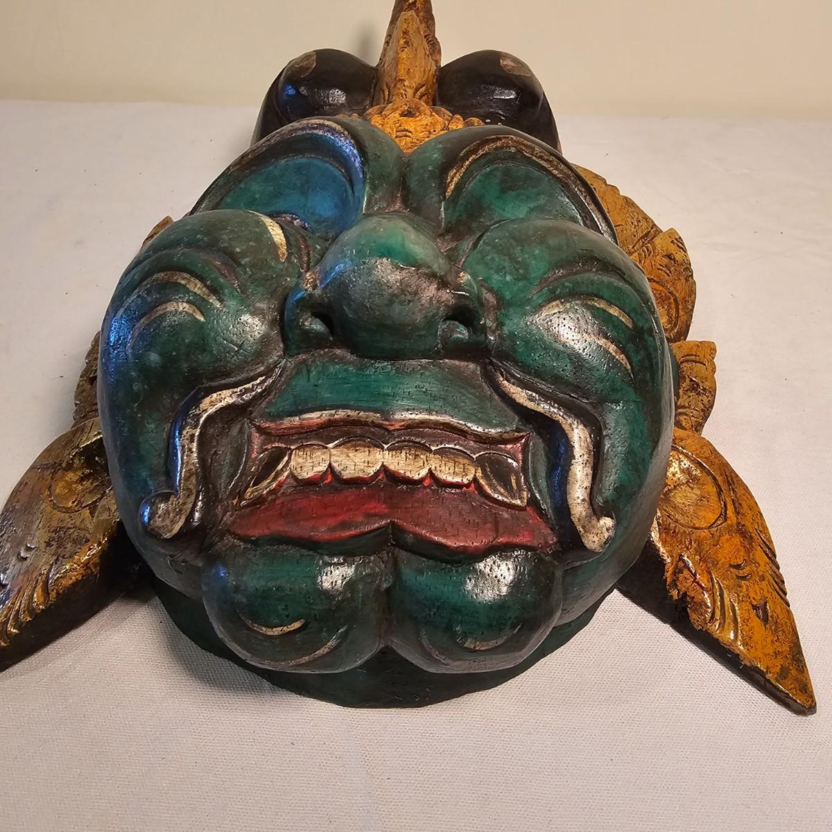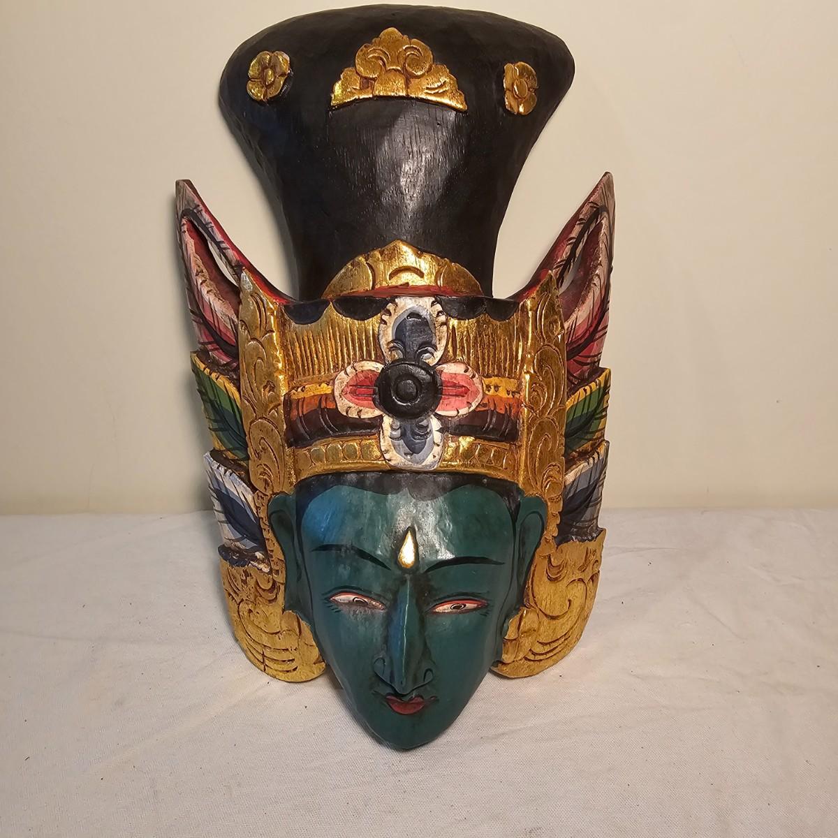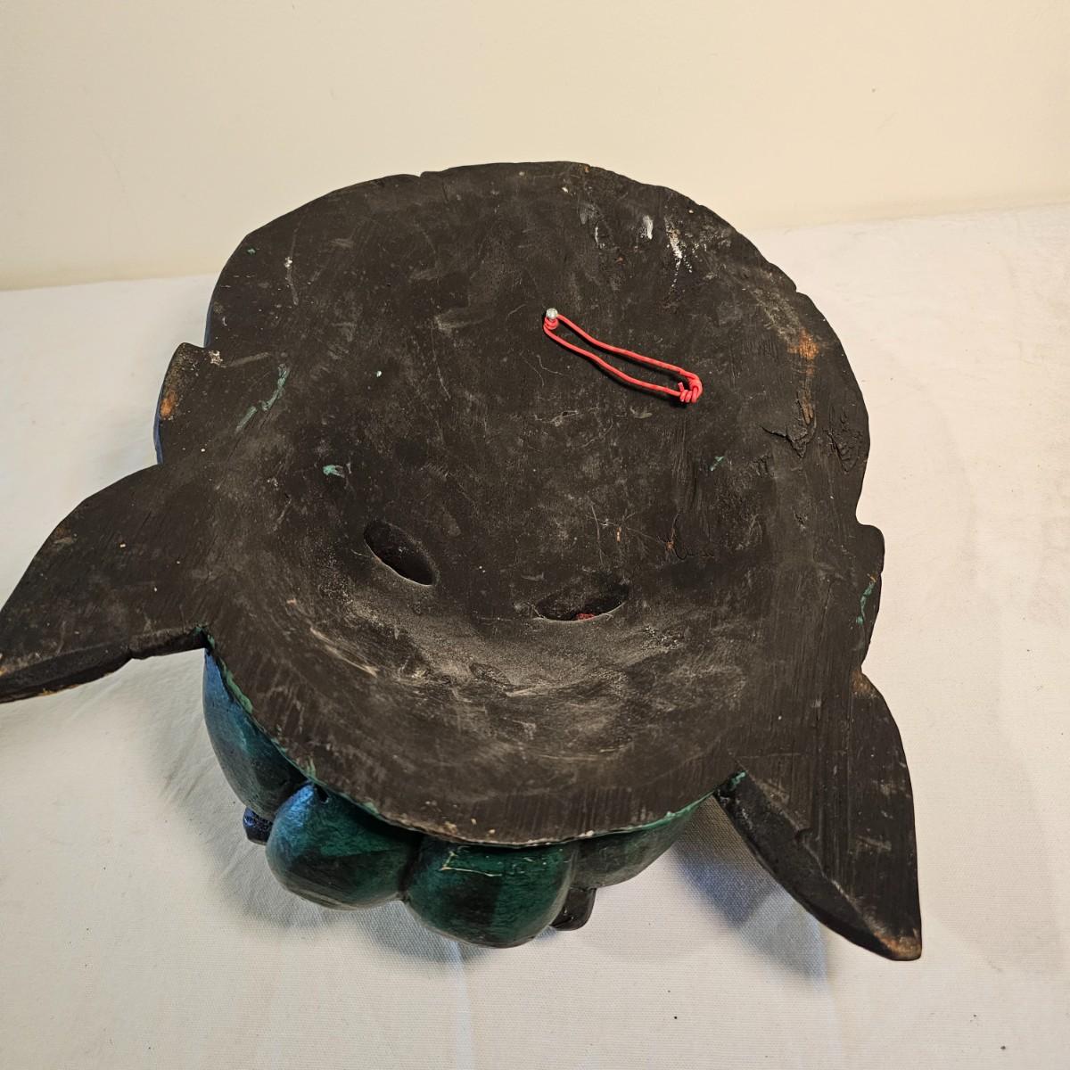 Three carved wooden decorative masks. Items are brightly painted Indonesian style relics. Largest mask is 10" x 5" x 13"H. The mid size is 9" x 4" x 14"H. The smallest is 8" x 4" x 13"H. See photos for details. Shipping available.