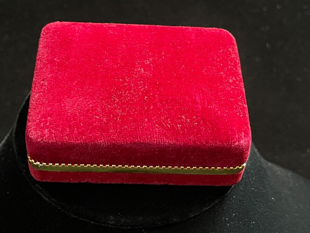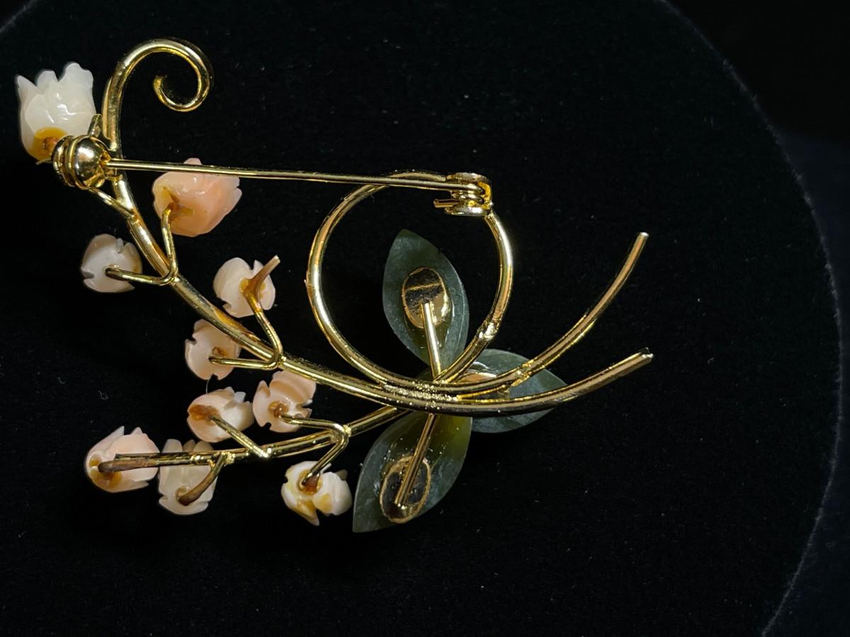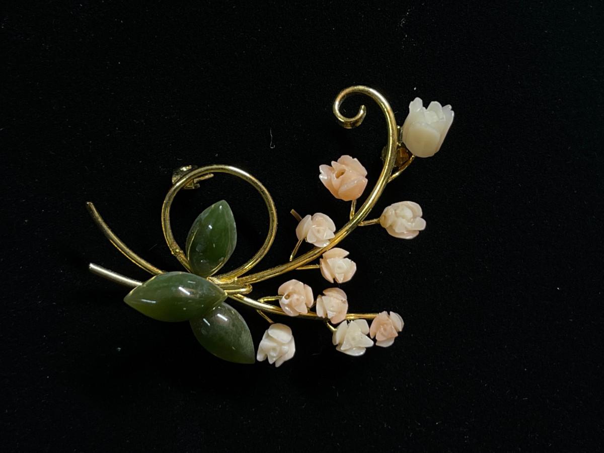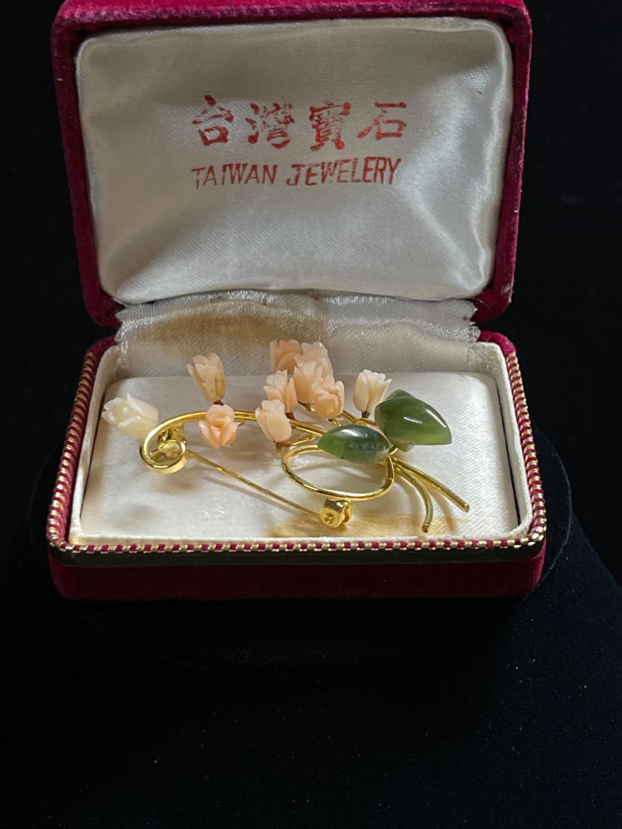DESCRIPTION: This delicate brooch pin “Made in Taiwan” is constructed of gold plated wire stemming set with tiny carved coral blossoms and green jade leaves. The pin retains the original red velvet box and appears to have never been worn.