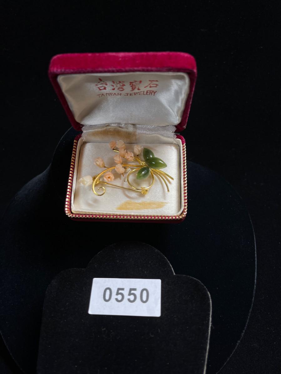 ITEM: A Jade & Coral Brooch Pin & Original Box