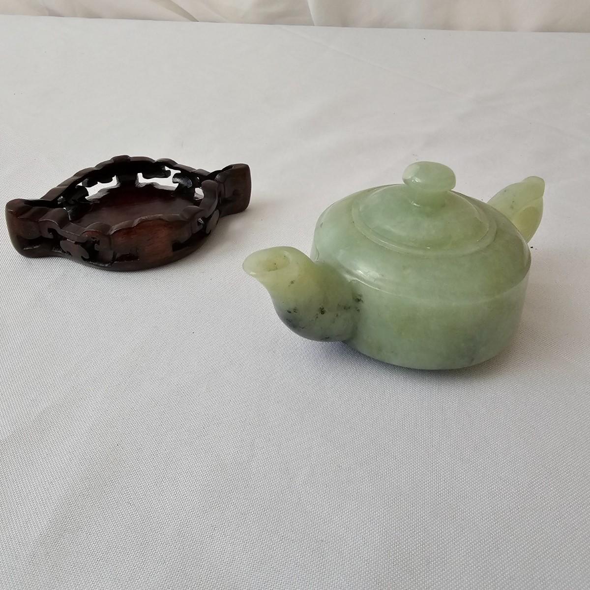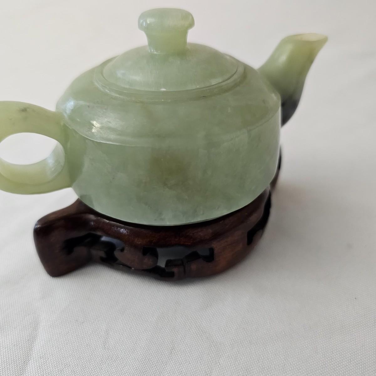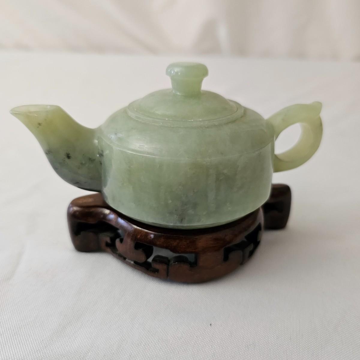 Carved Jade Teapot & Small Wooden Stand (GR-JS)