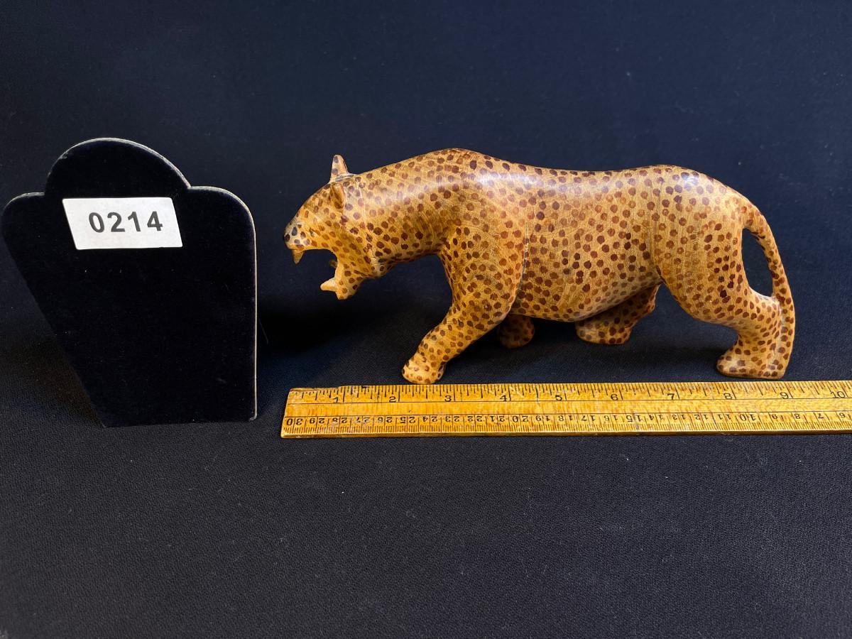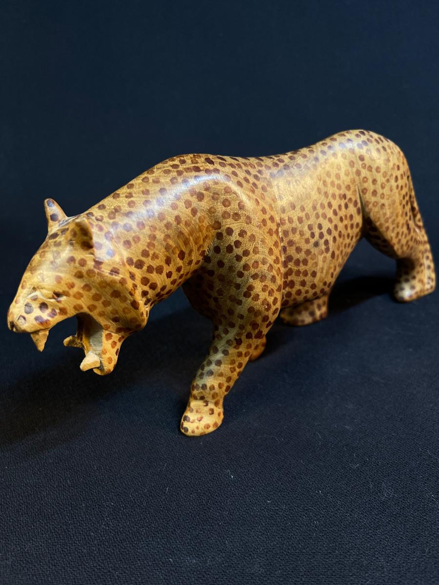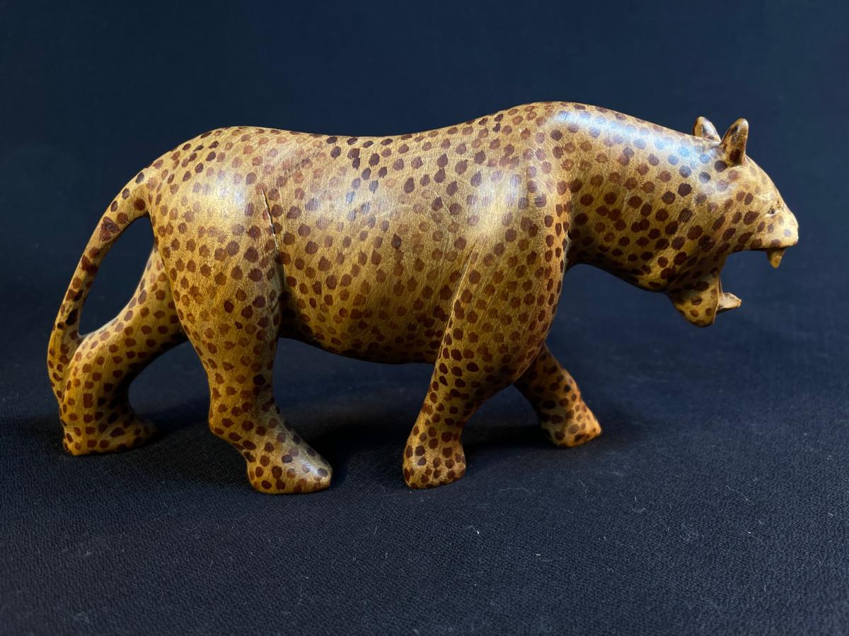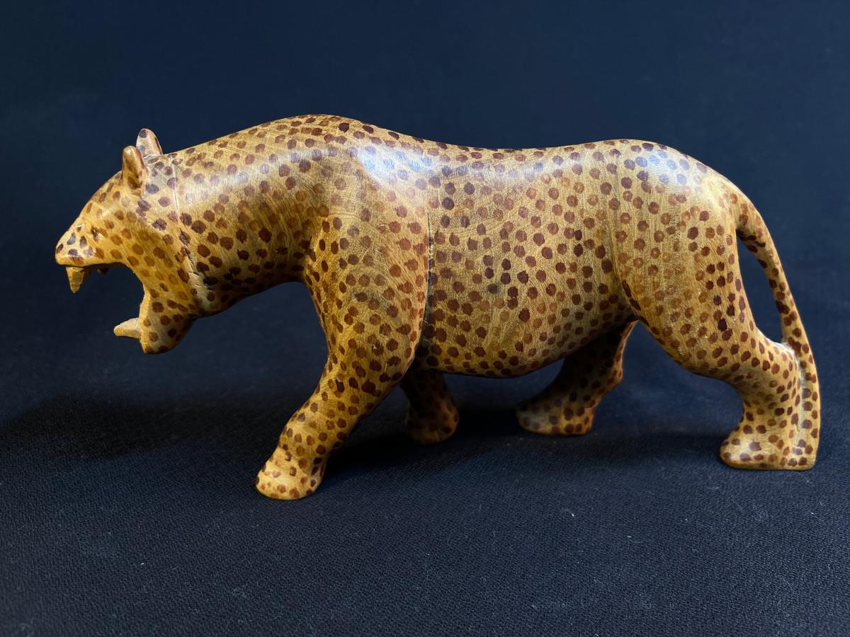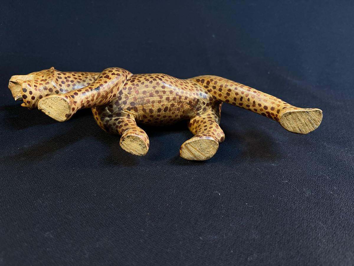 This lanky leopard is hand carved hardwood with painted dots for the coat.