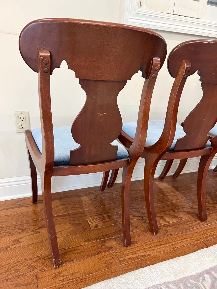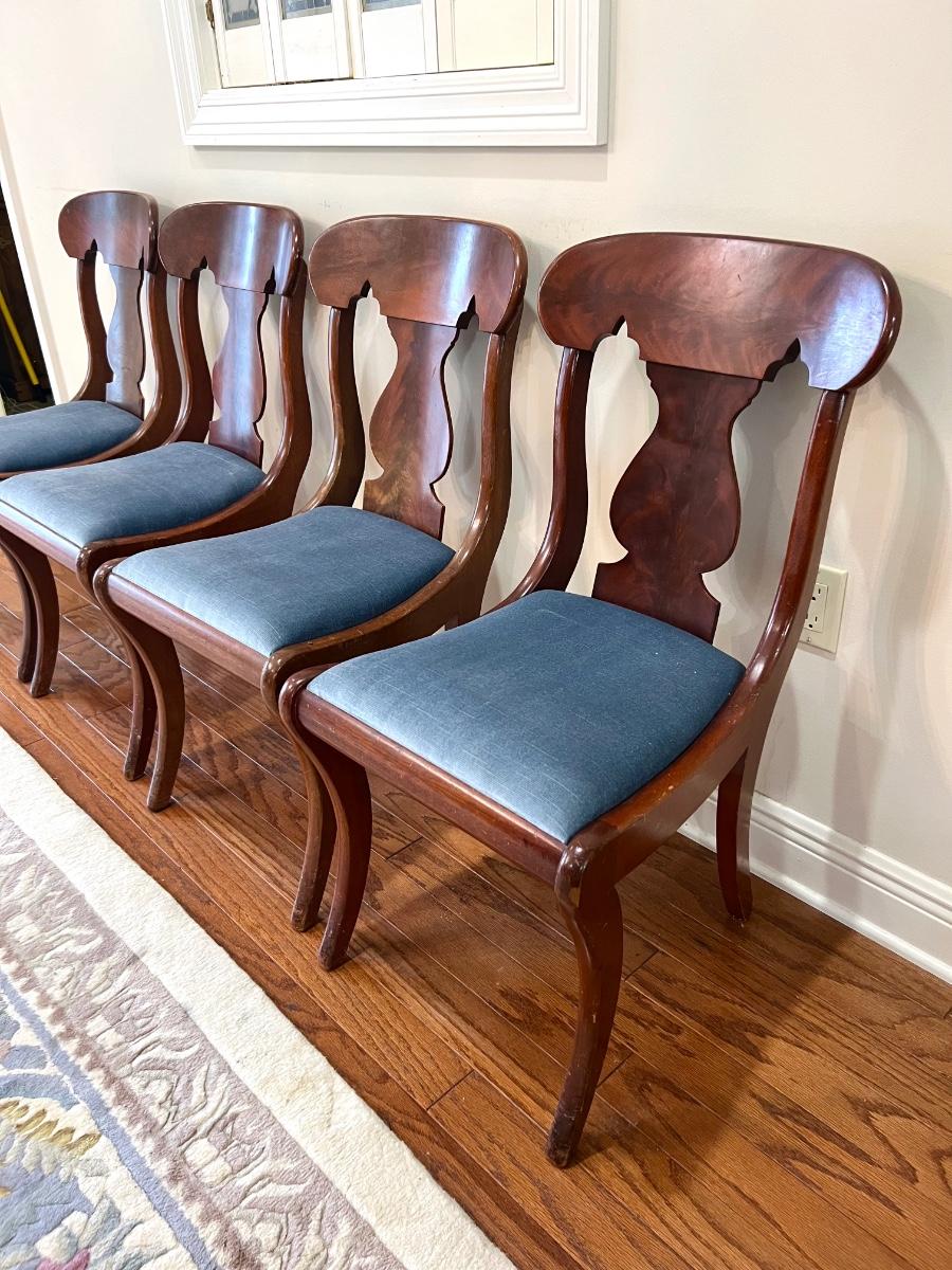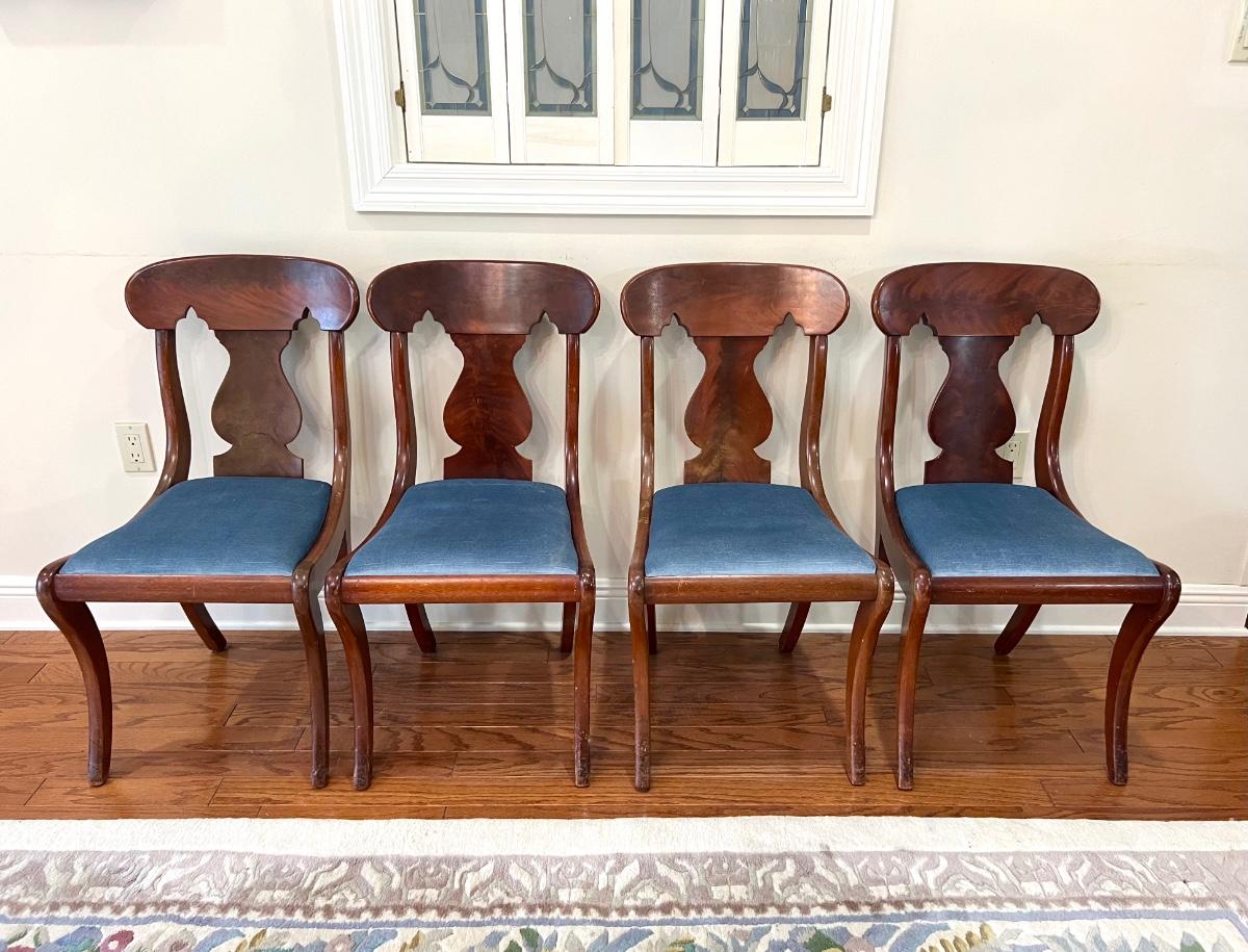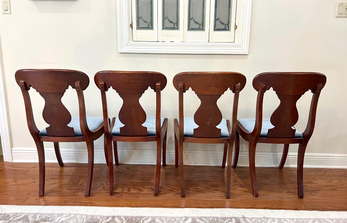 Four Carved Mahogany (?) Dining Chairs Measures 34 inches tall, 18 inches wide and 19 inches deep. Floor to seat measures at 18 inches.