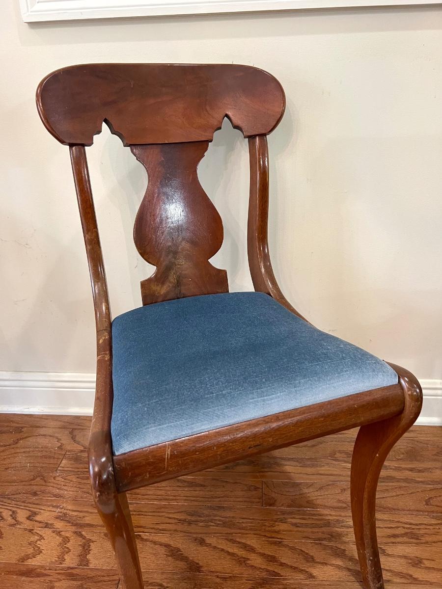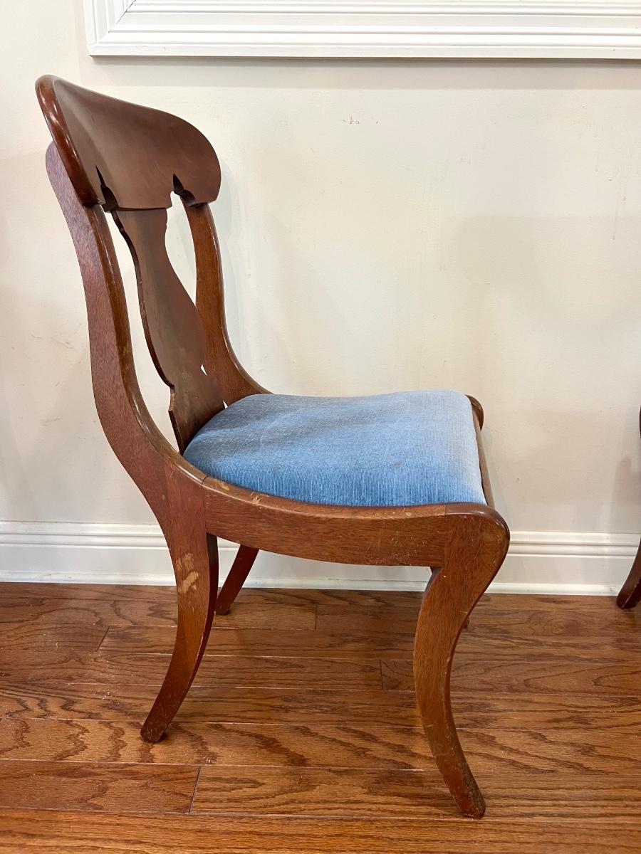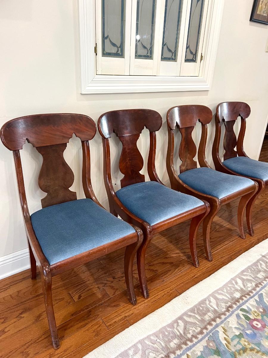 Four Carved Mahogany (?) Dining Chairs Measures 34 inches tall, 18 inches wide and 19 inches deep. Floor to seat measures at 18 inches.