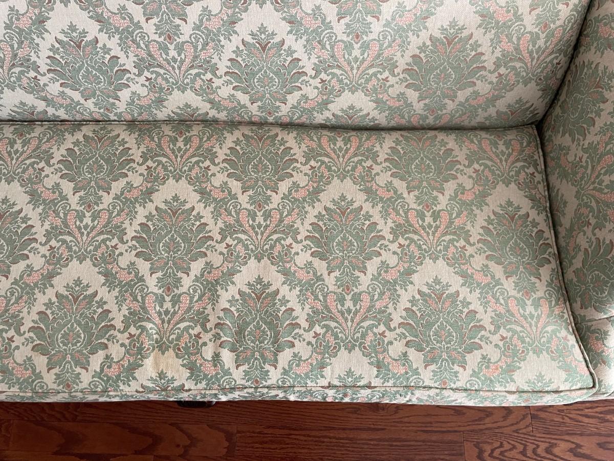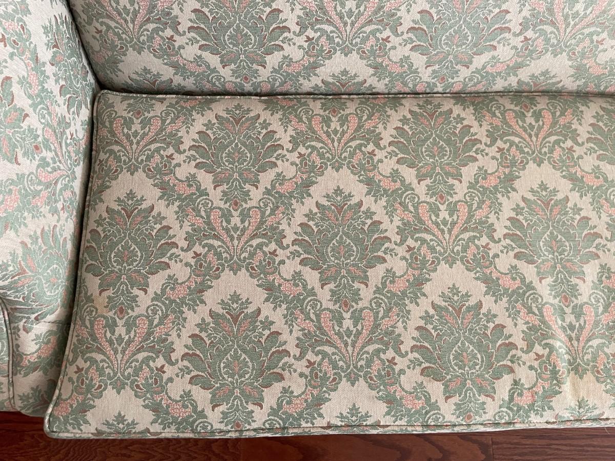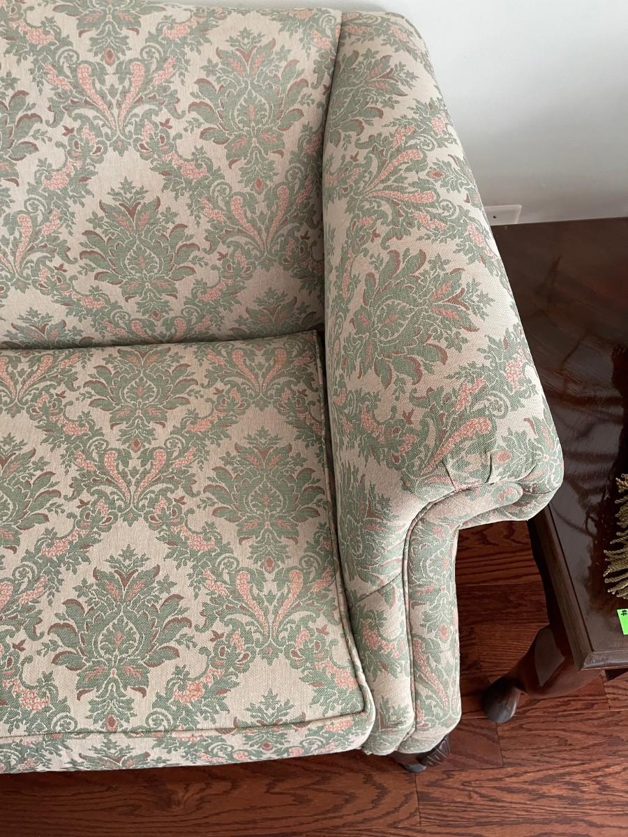 Sofa is upholstered in Sage and blush print colored fabric. Measures - 69"L x 34"H x 32"D. This lot is a matching piece to lot # 8 .