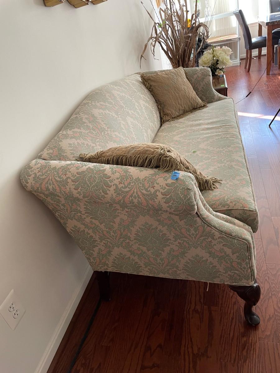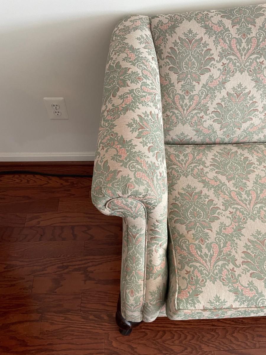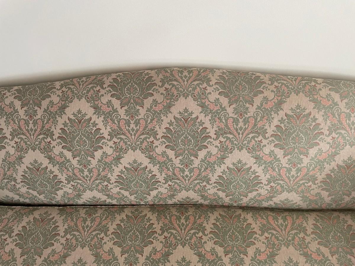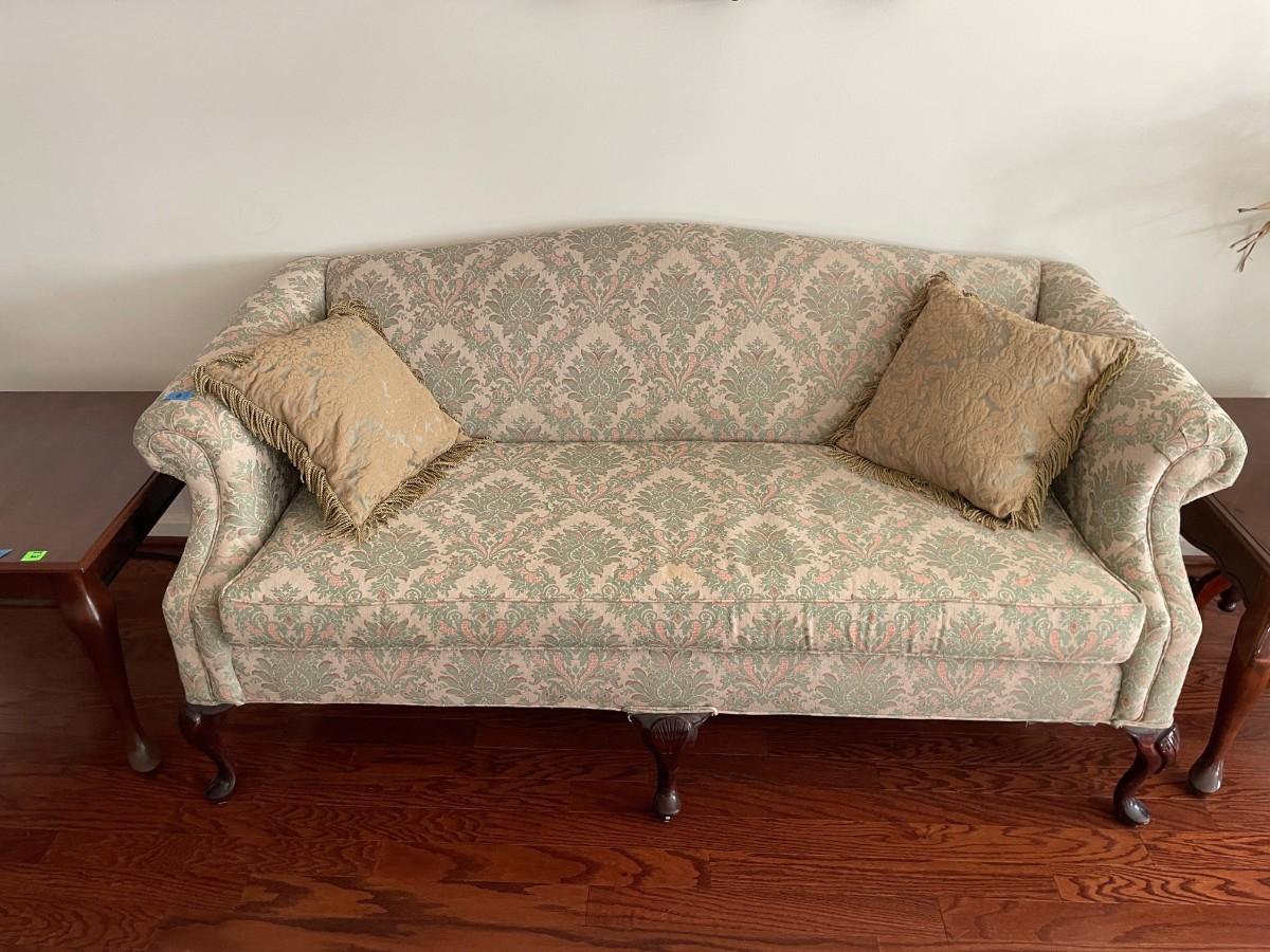Sofa is upholstered in Sage and blush print colored fabric. Measures - 69"L x 34"H x 32"D. This lot is a matching piece to lot # 8 .