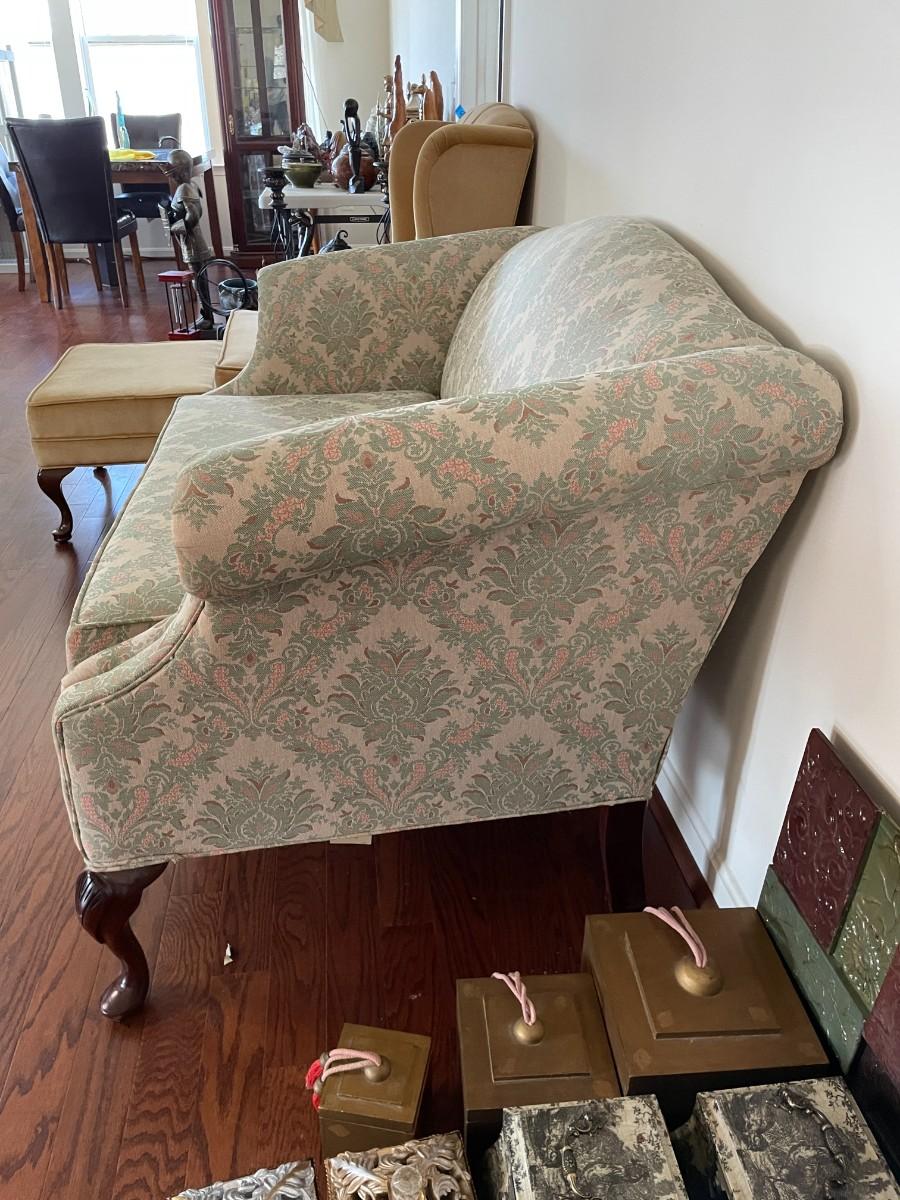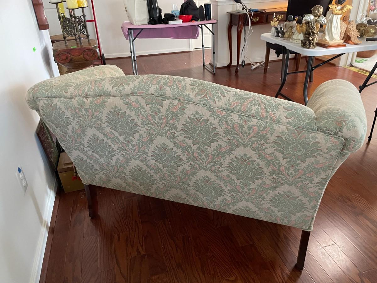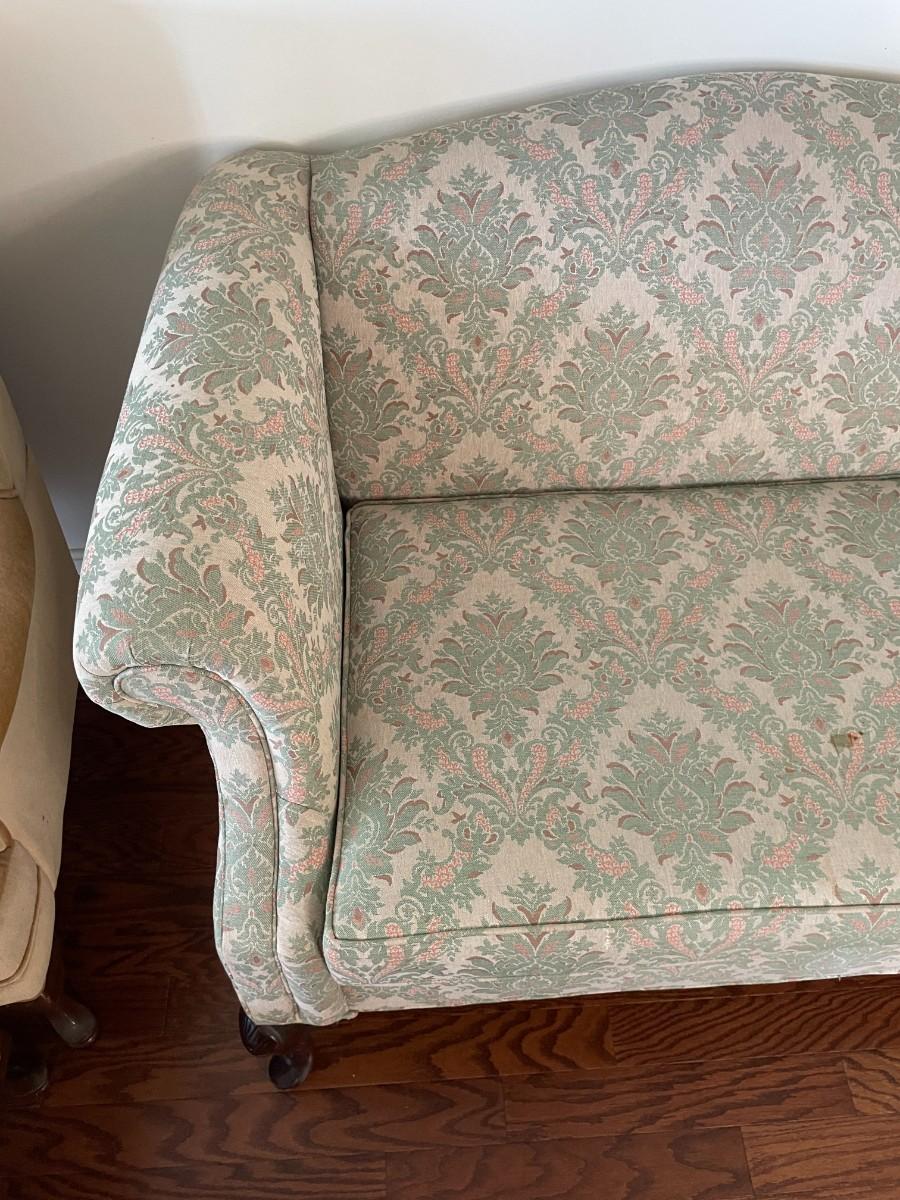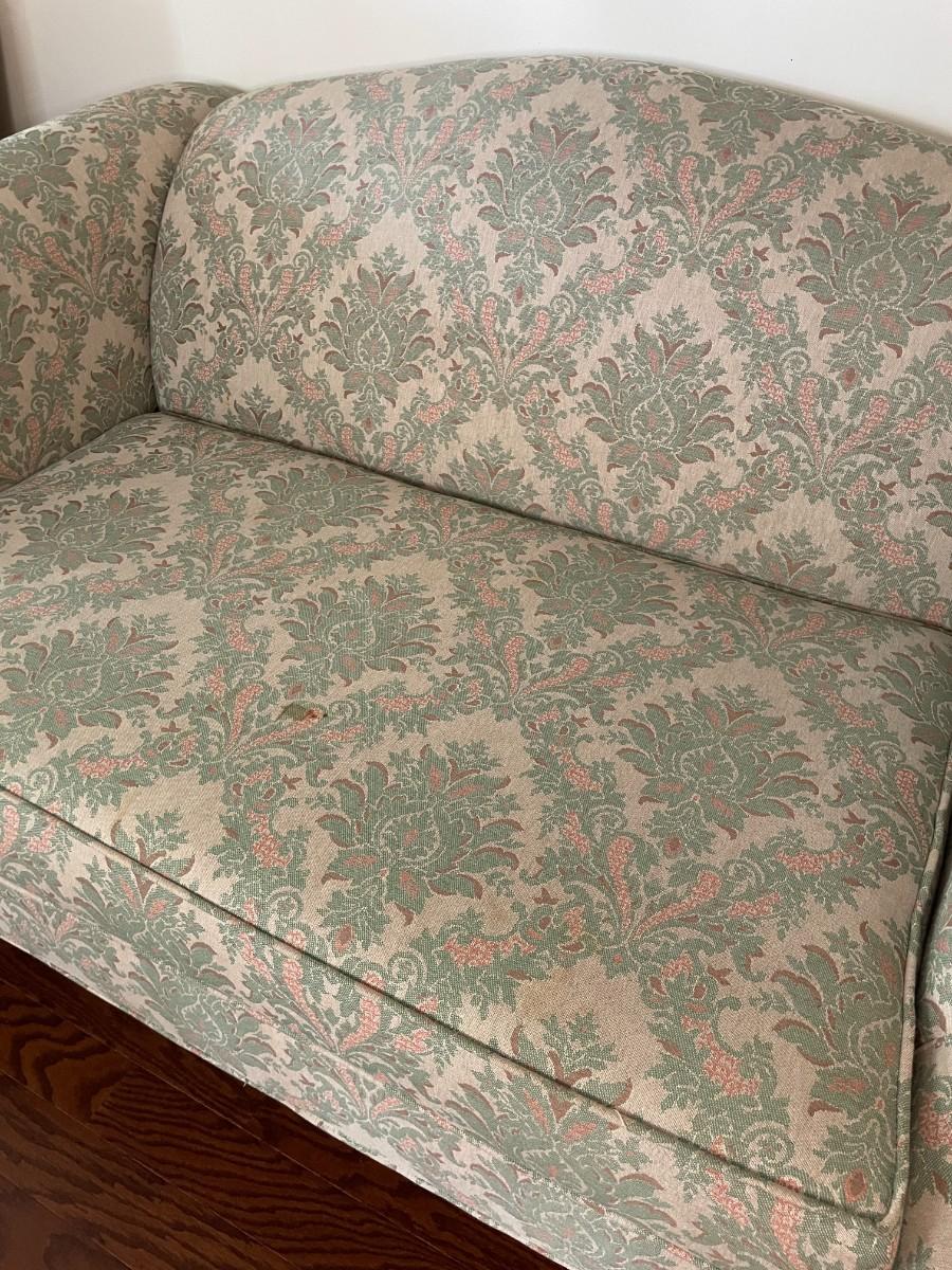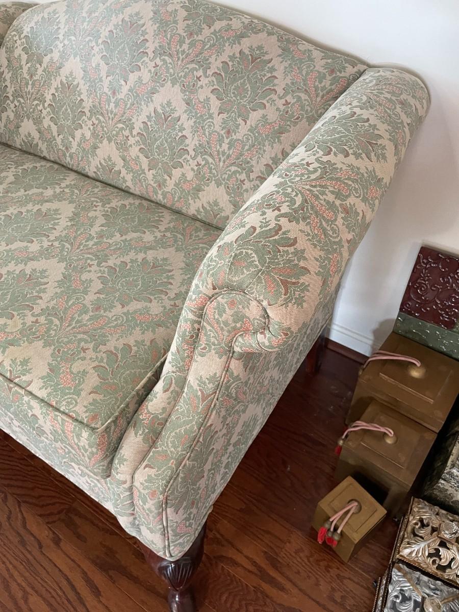 Sofa is upholstered in Sage and blush pint colored fabric. Measures 49"L x 34"H x 32"D. This piece matches lot #7.