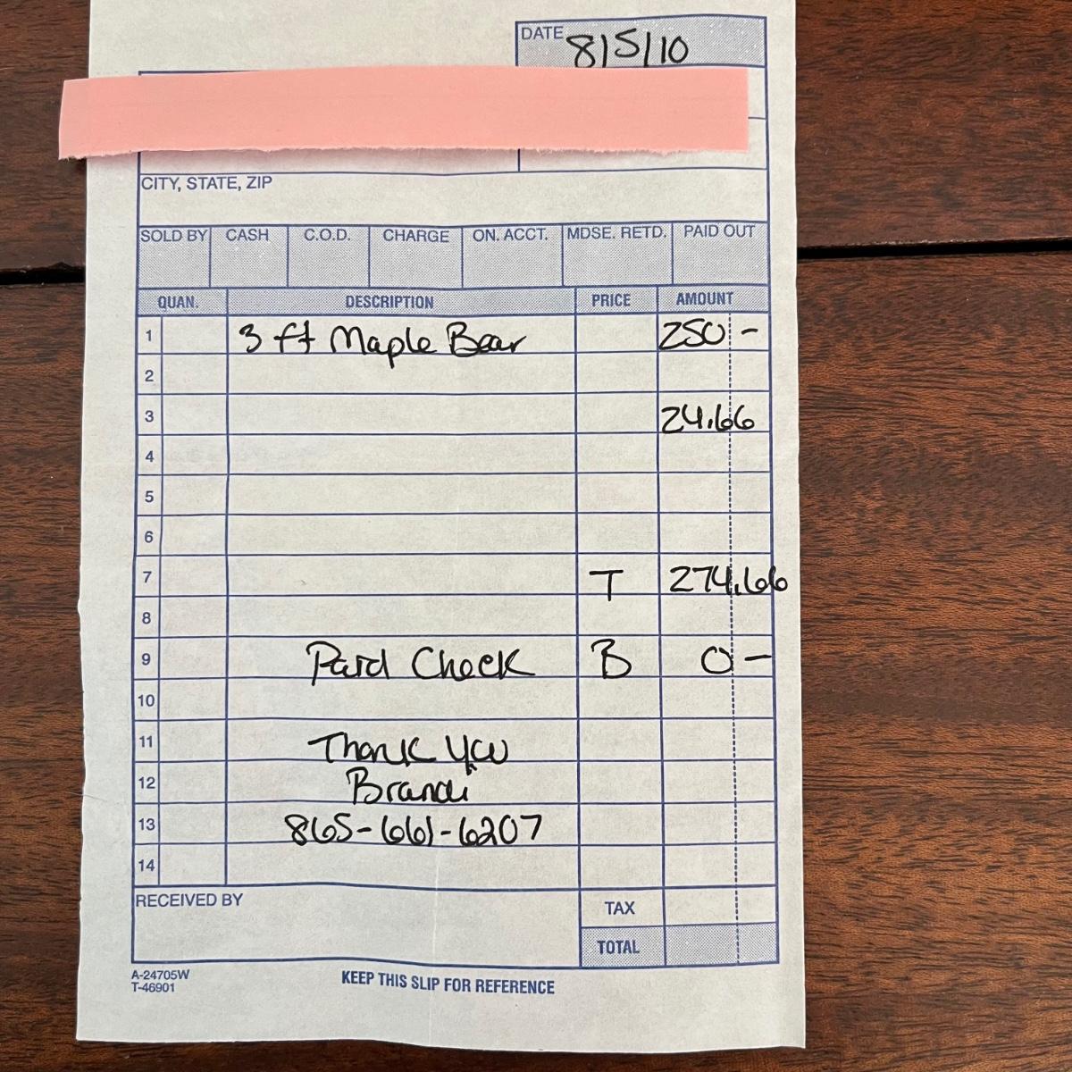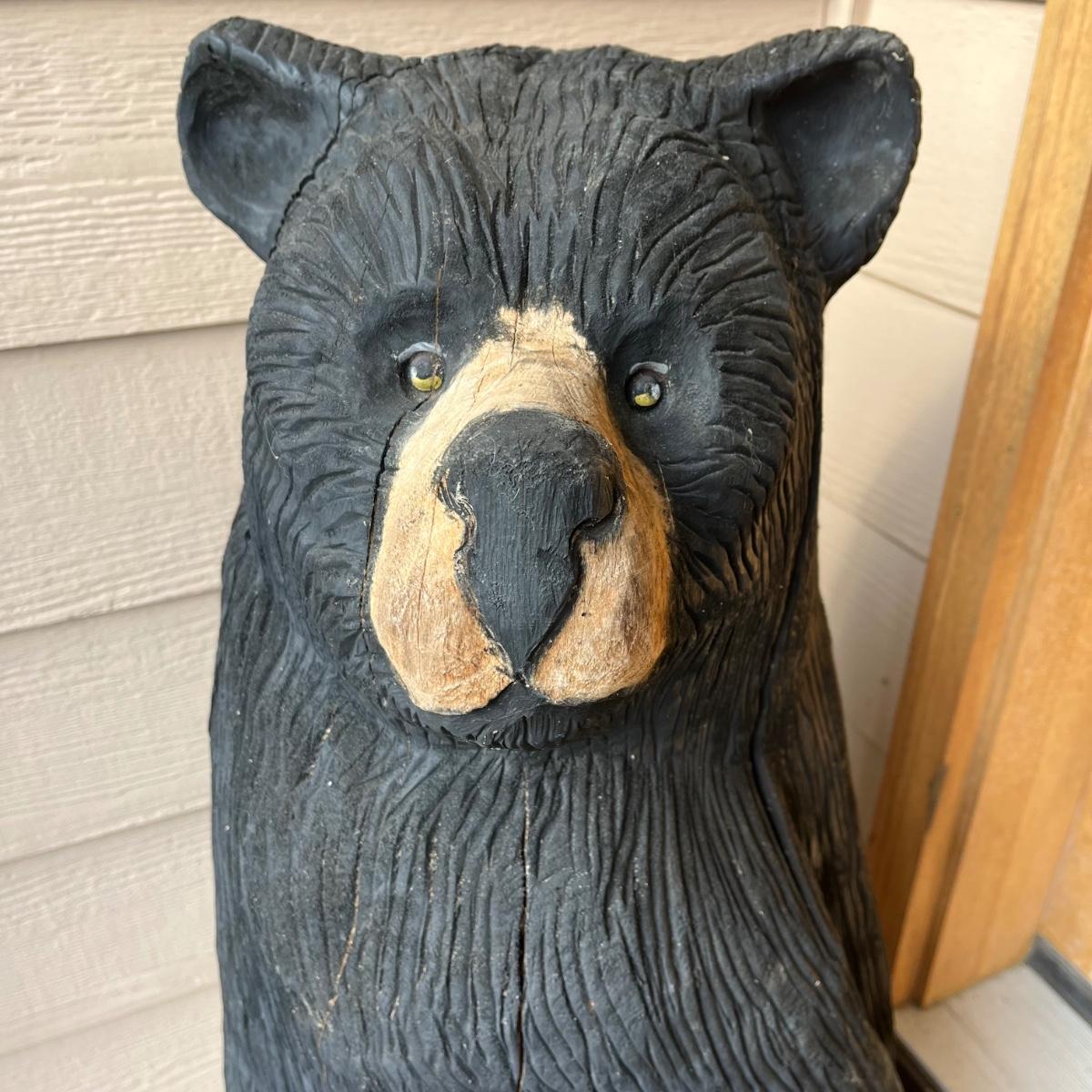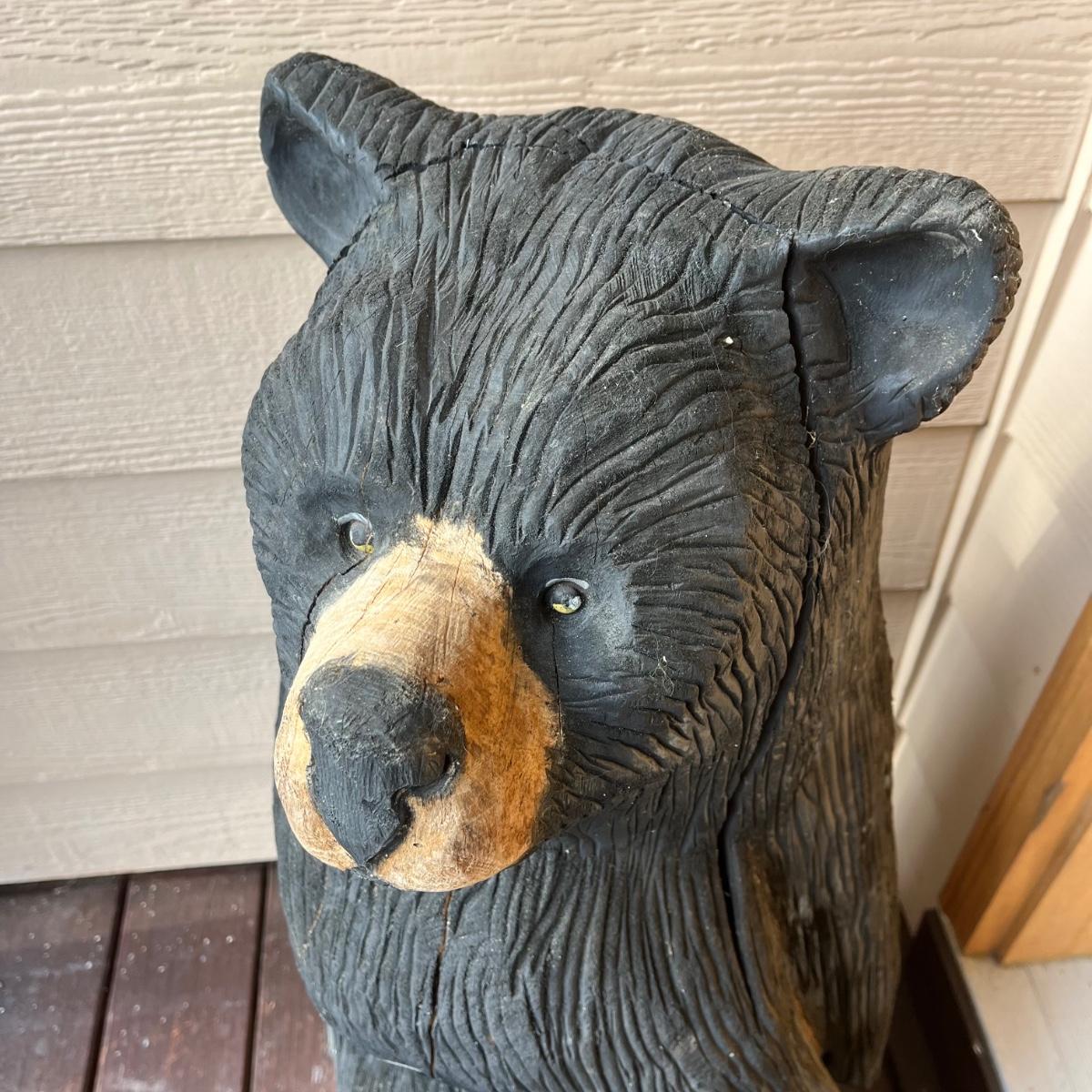 Very cute 3’ tall folk art wooden carved bear. Is currently outside but would be a nice addition in or out. The overall measurement is 20” x 17” x 36”H including the base. The light wood section of the base is 8”H. The bear itself is 17” x 15” x 28”H. There is a serious crack on both sides of the bear but it is still intact. Receipt shown is not included.