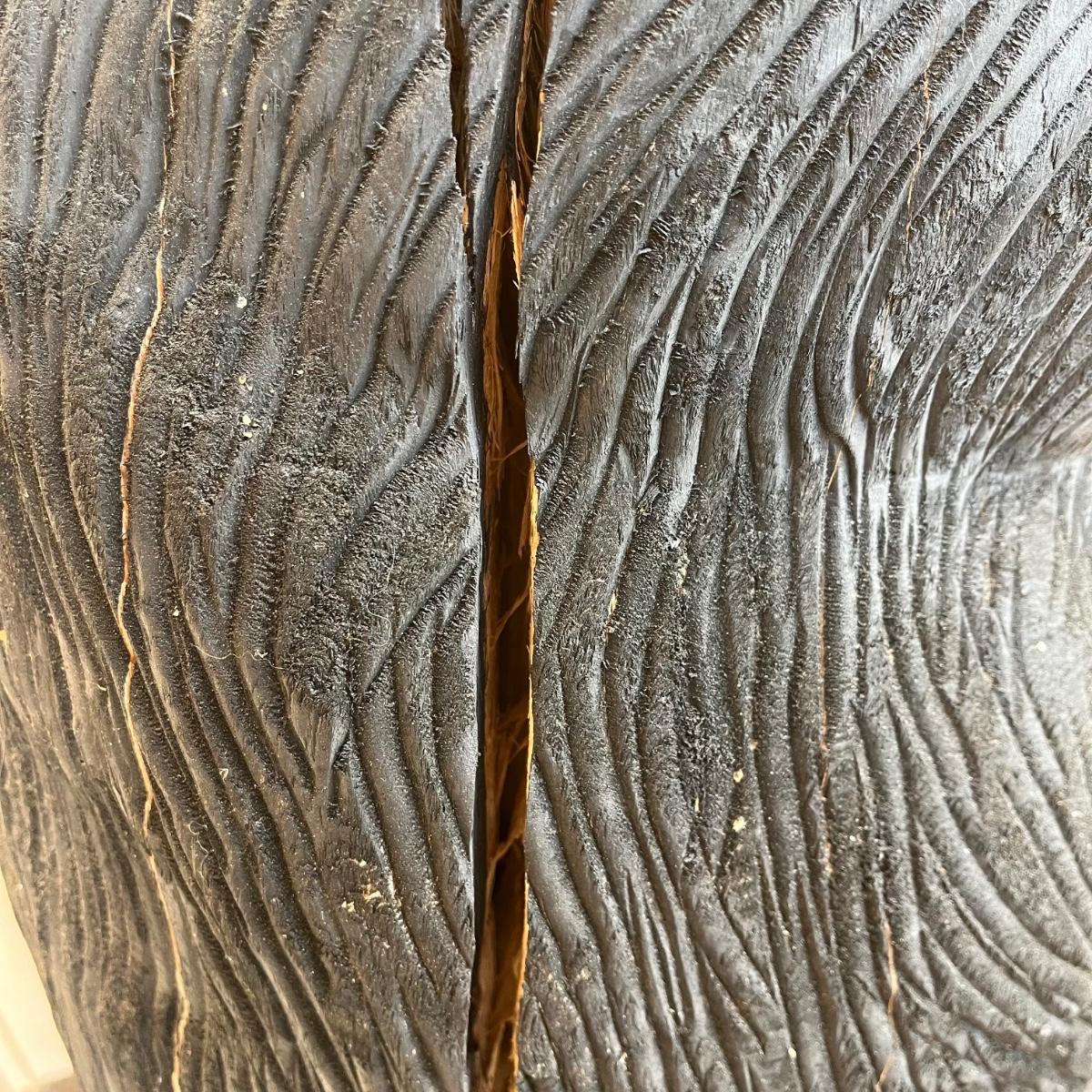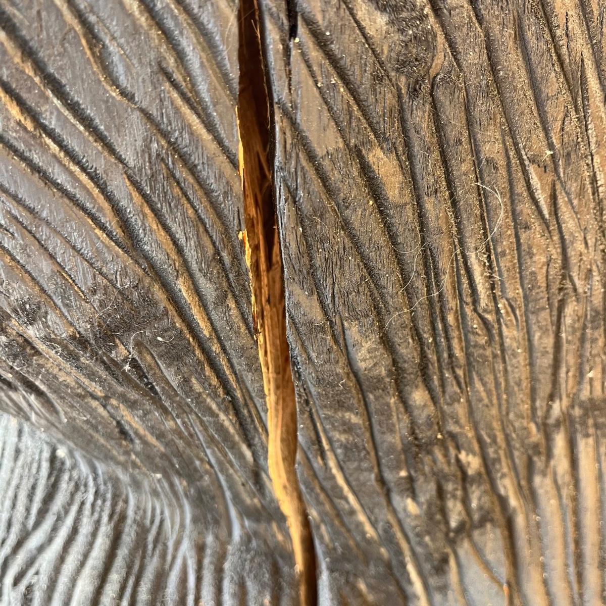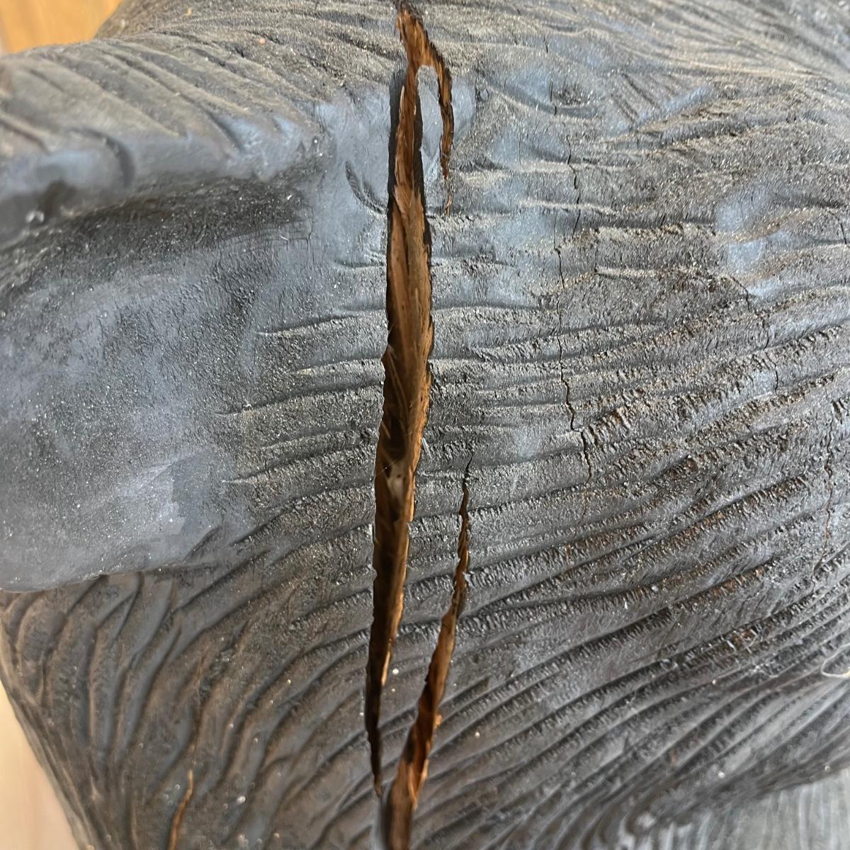 Very cute 3’ tall folk art wooden carved bear. Is currently outside but would be a nice addition in or out. The overall measurement is 20” x 17” x 36”H including the base. The light wood section of the base is 8”H. The bear itself is 17” x 15” x 28”H. There is a serious crack on both sides of the bear but it is still intact. Receipt shown is not included.