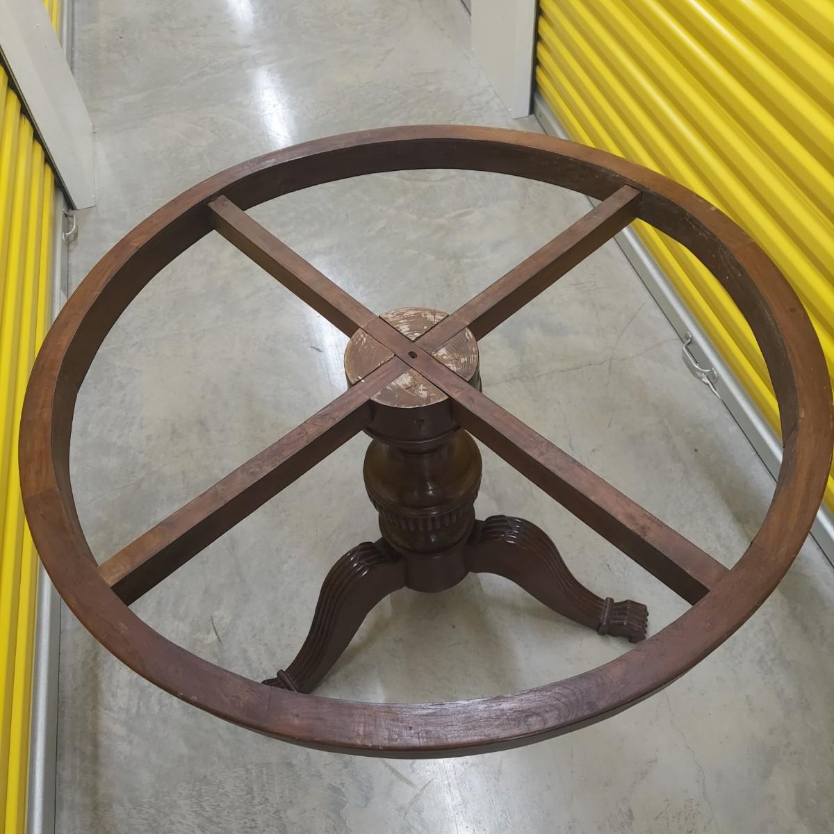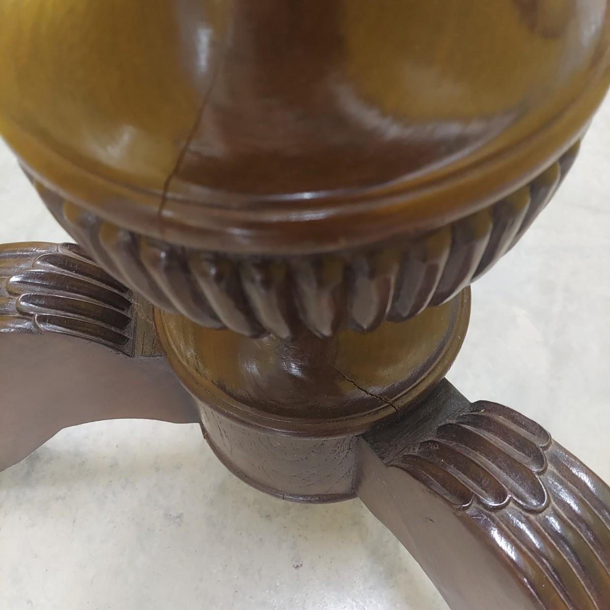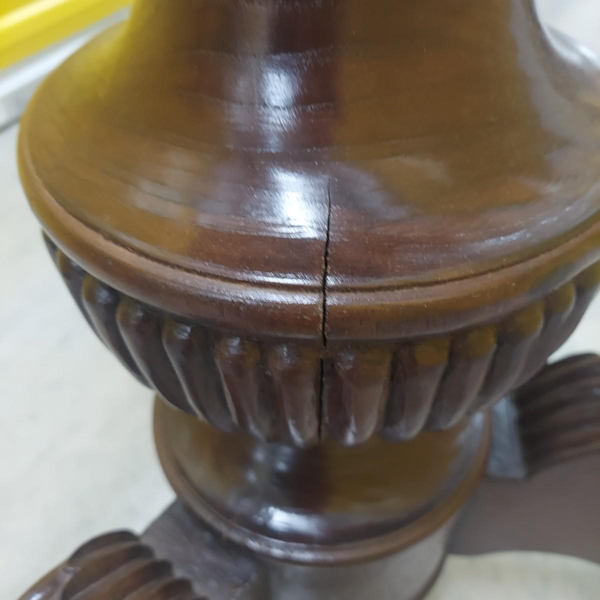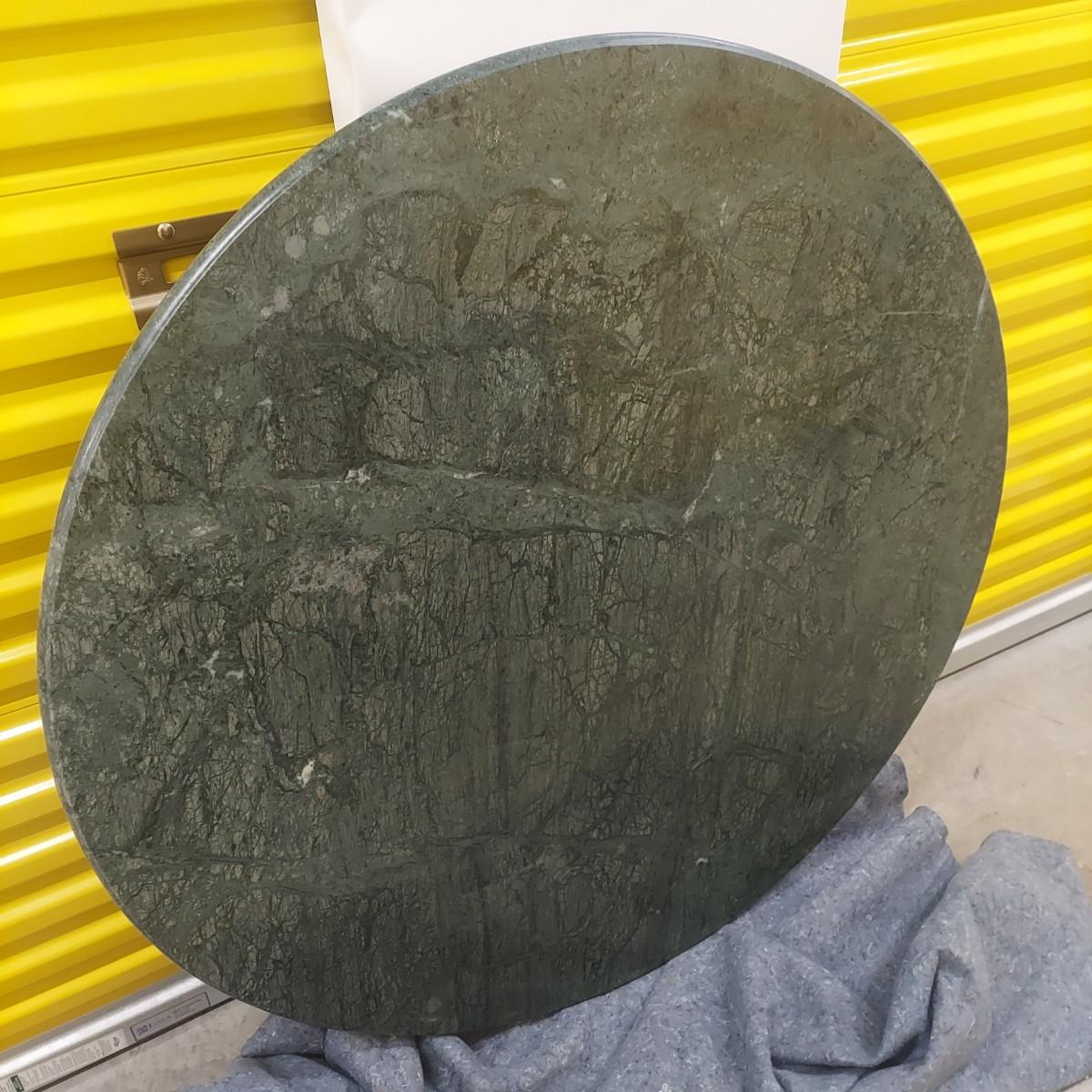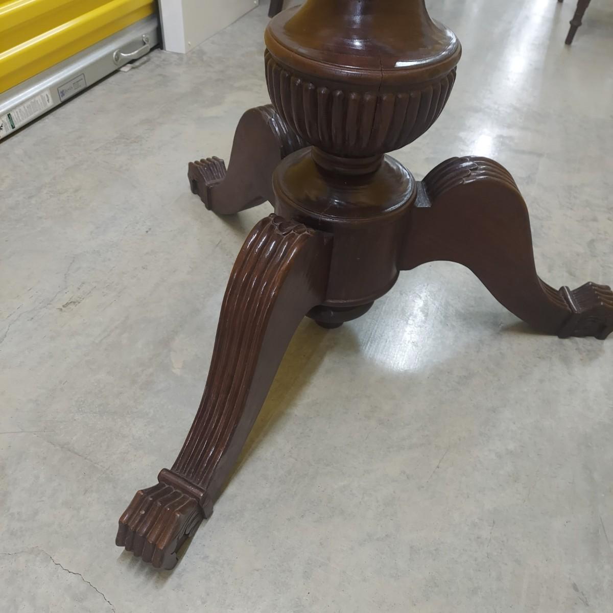 Unique round solid wood dining table with very heavy stone top that appears to be marble. There are also four chairs with upholstered seats. Table is in three pieces. The clawfoot center pedestal measures approximately 30"D x 29"H. The frame measures across 45"D. The top is 47.5"D across. There are four chairs with carved backs and fluted legs. Each chair measures 22” x 20” x 34"H with a seat height of 20”H. There are some overall condition issues like cracks in the base, chips out of a chair and what appears to be double sided tape on a chair. Please see photos for details. Local Pickup Only. Winning bidder must bring assistance to help move and load this item due to its weight and/or size.