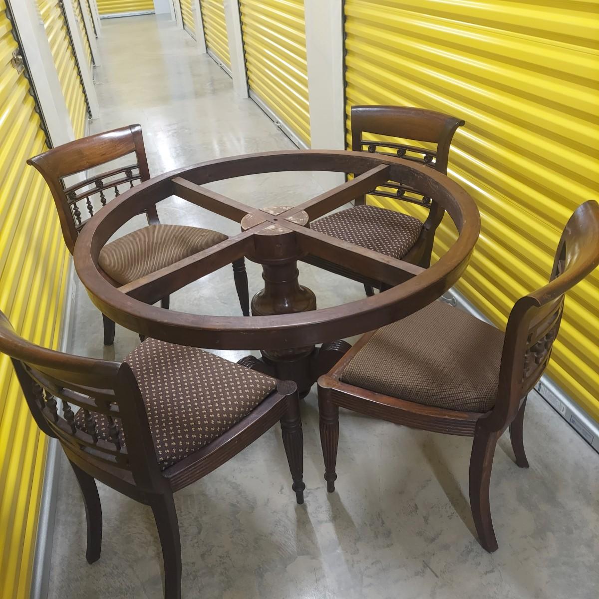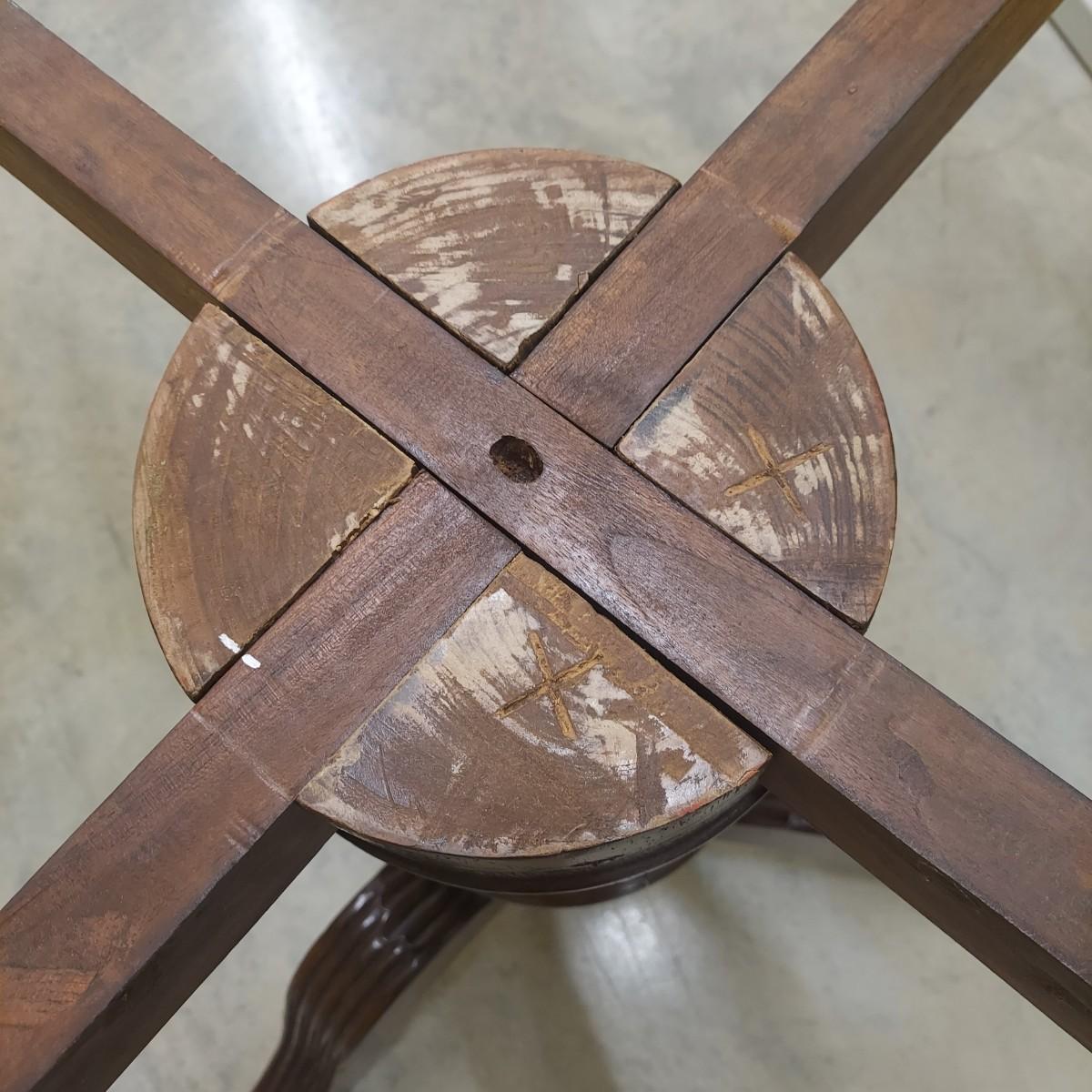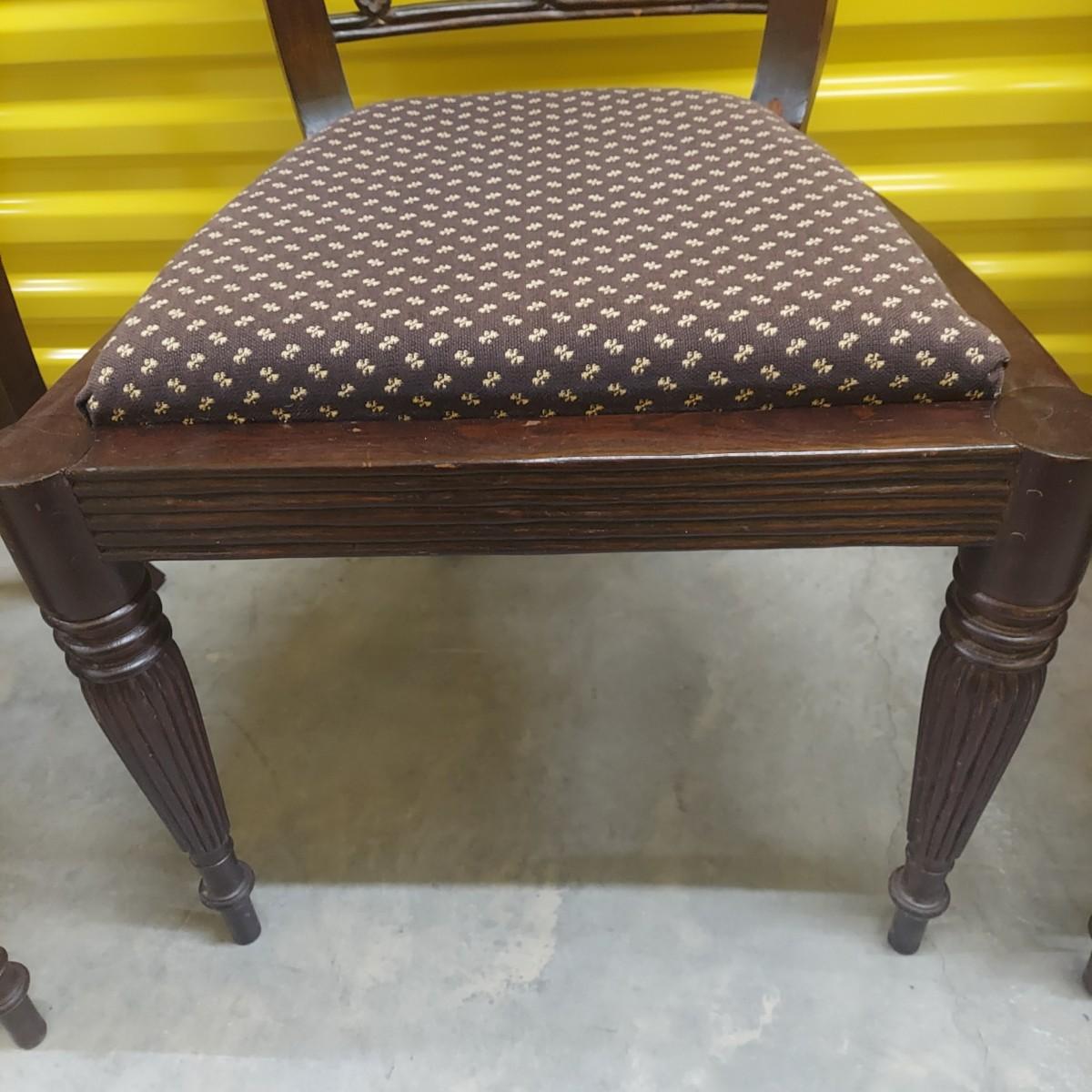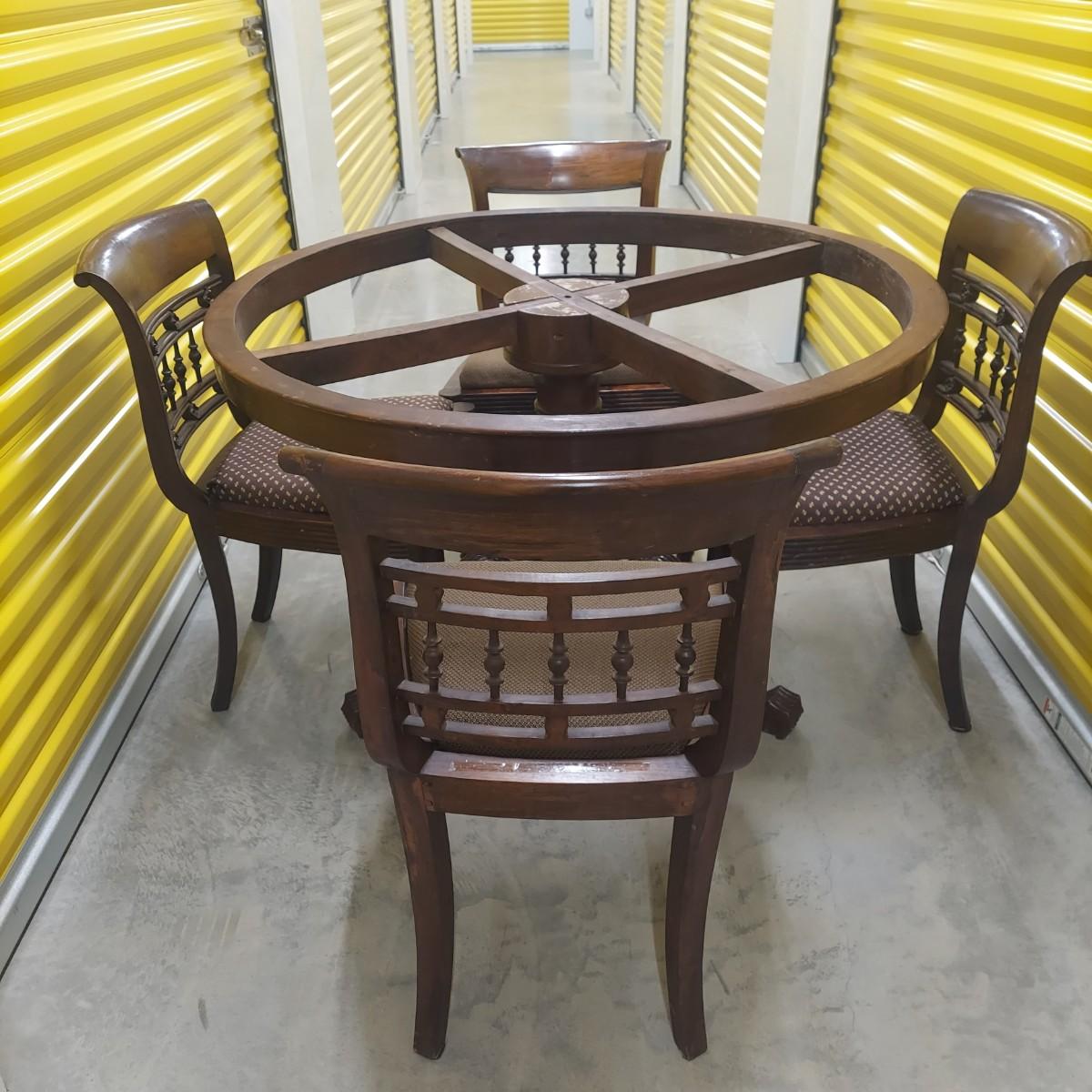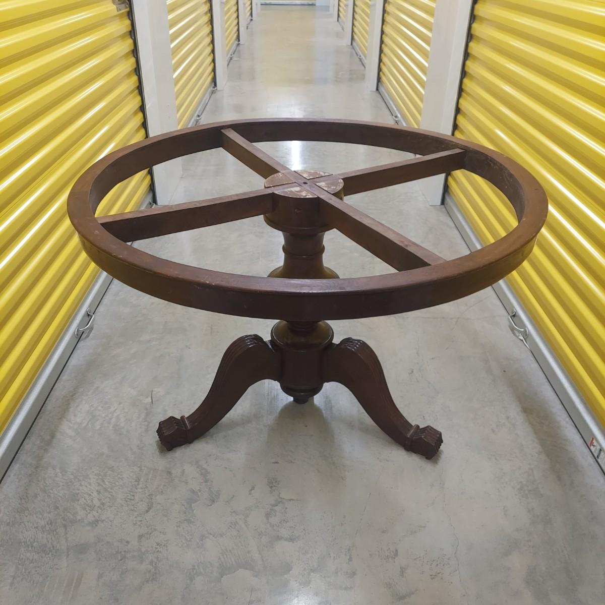Unique round solid wood dining table with very heavy stone top that appears to be marble. There are also four chairs with upholstered seats. Table is in three pieces. The clawfoot center pedestal measures approximately 30"D x 29"H. The frame measures across 45"D. The top is 47.5"D across. There are four chairs with carved backs and fluted legs. Each chair measures 22” x 20” x 34"H with a seat height of 20”H. There are some overall condition issues like cracks in the base, chips out of a chair and what appears to be double sided tape on a chair. Please see photos for details. Local Pickup Only. Winning bidder must bring assistance to help move and load this item due to its weight and/or size.