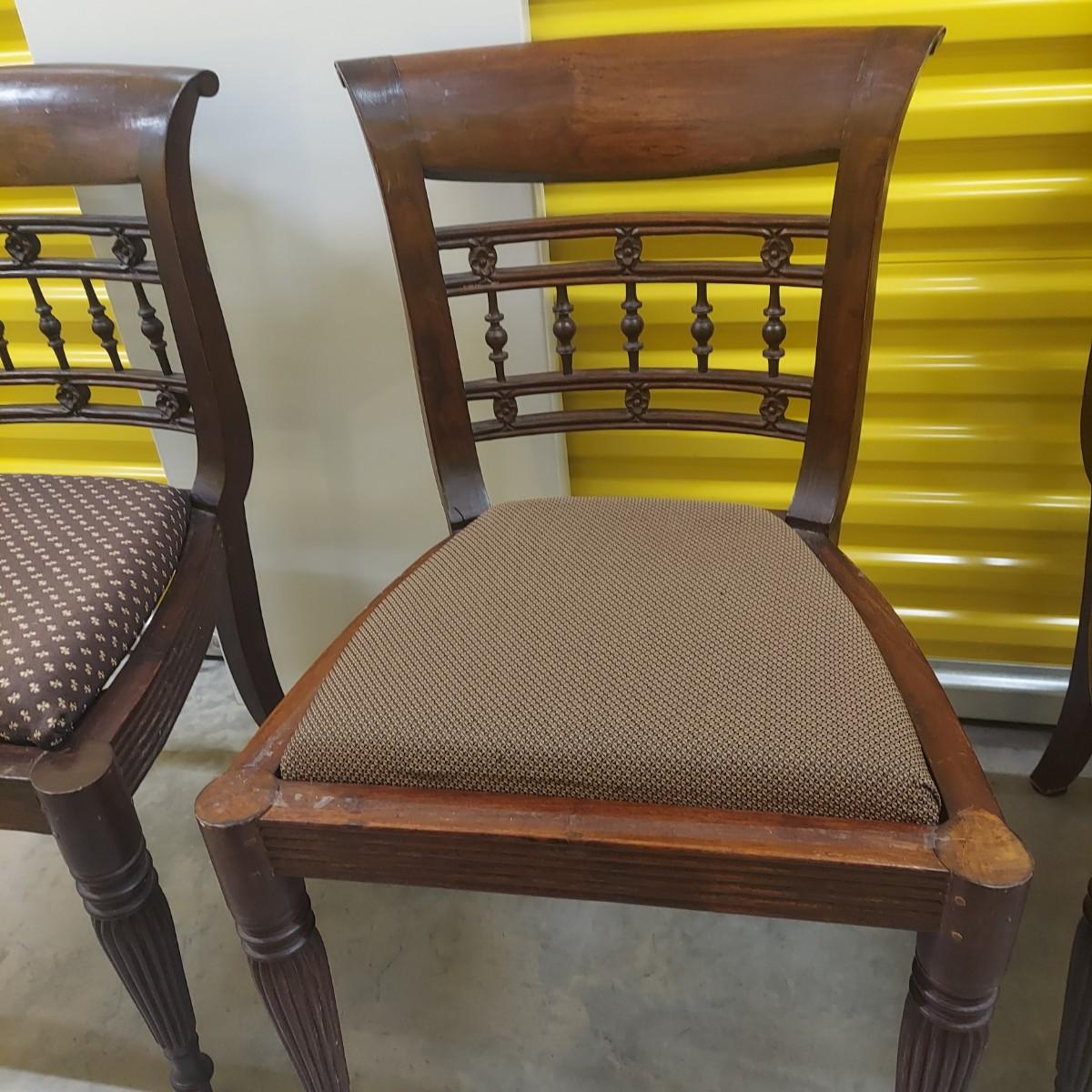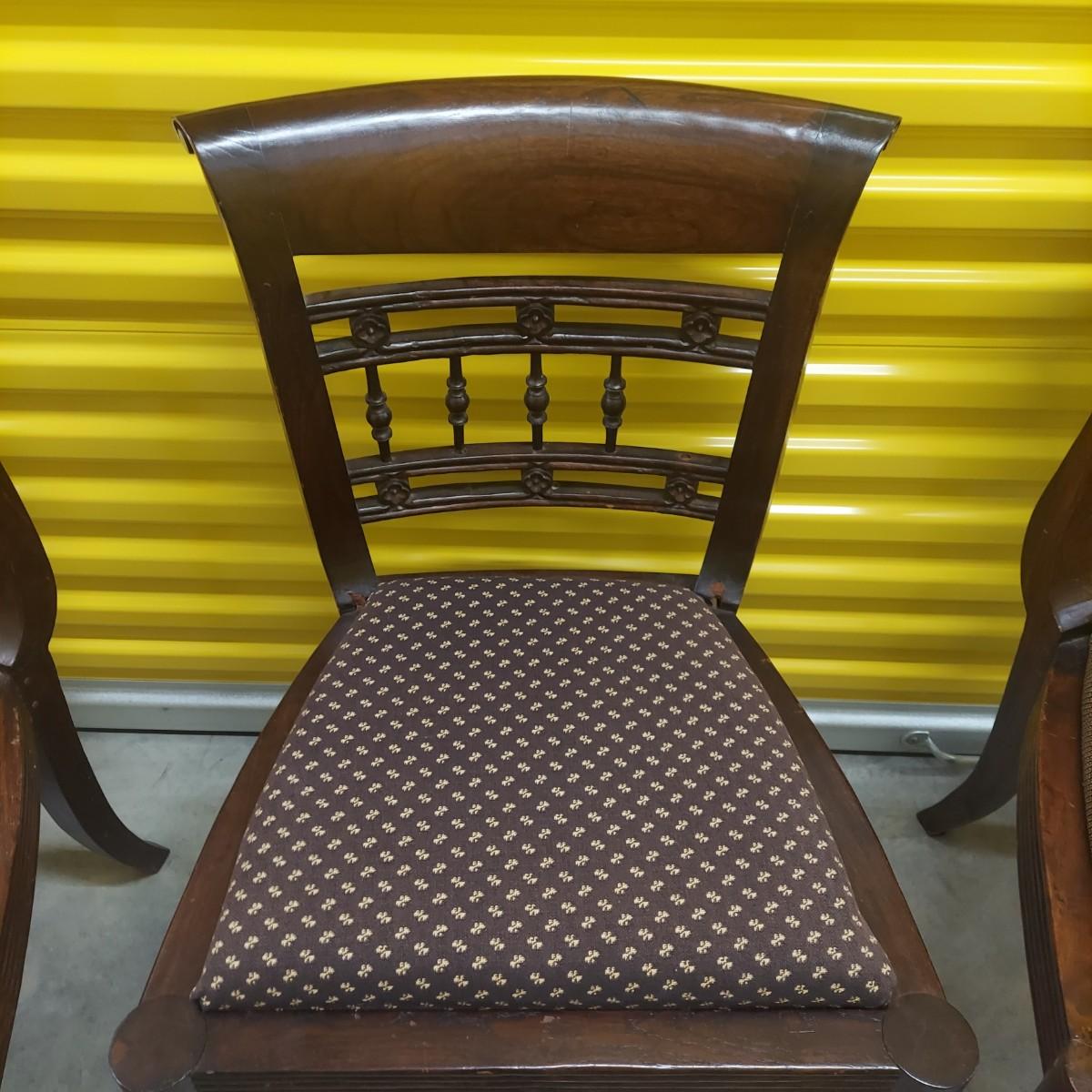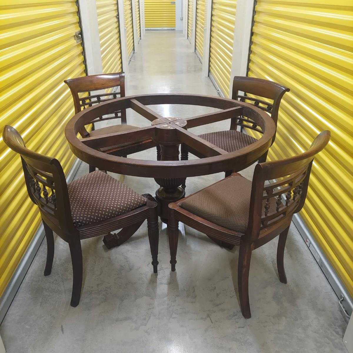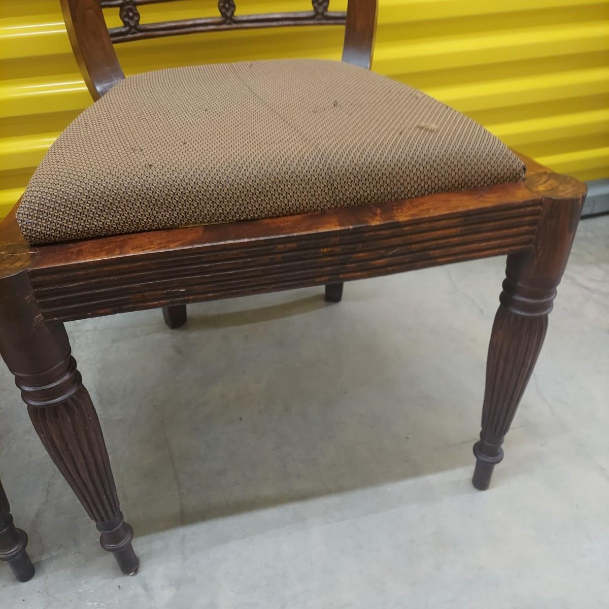Unique round solid wood dining table with very heavy stone top that appears to be marble. There are also four chairs with upholstered seats. Table is in three pieces. The clawfoot center pedestal measures approximately 30"D x 29"H. The frame measures across 45"D. The top is 47.5"D across. There are four chairs with carved backs and fluted legs. Each chair measures 22” x 20” x 34"H with a seat height of 20”H. There are some overall condition issues like cracks in the base, chips out of a chair and what appears to be double sided tape on a chair. Please see photos for details. Local Pickup Only. Winning bidder must bring assistance to help move and load this item due to its weight and/or size.