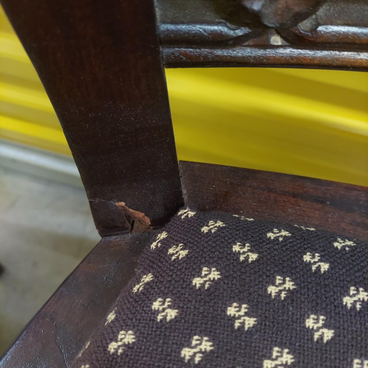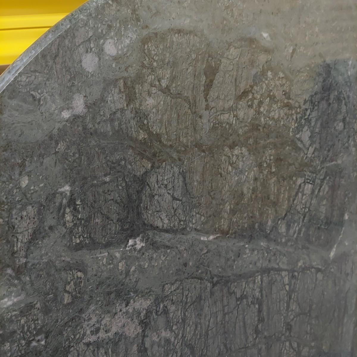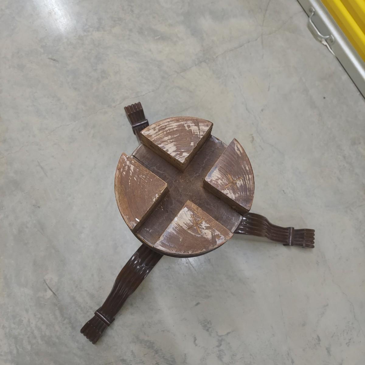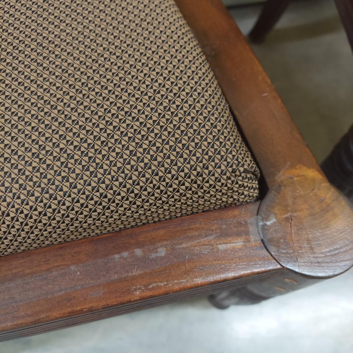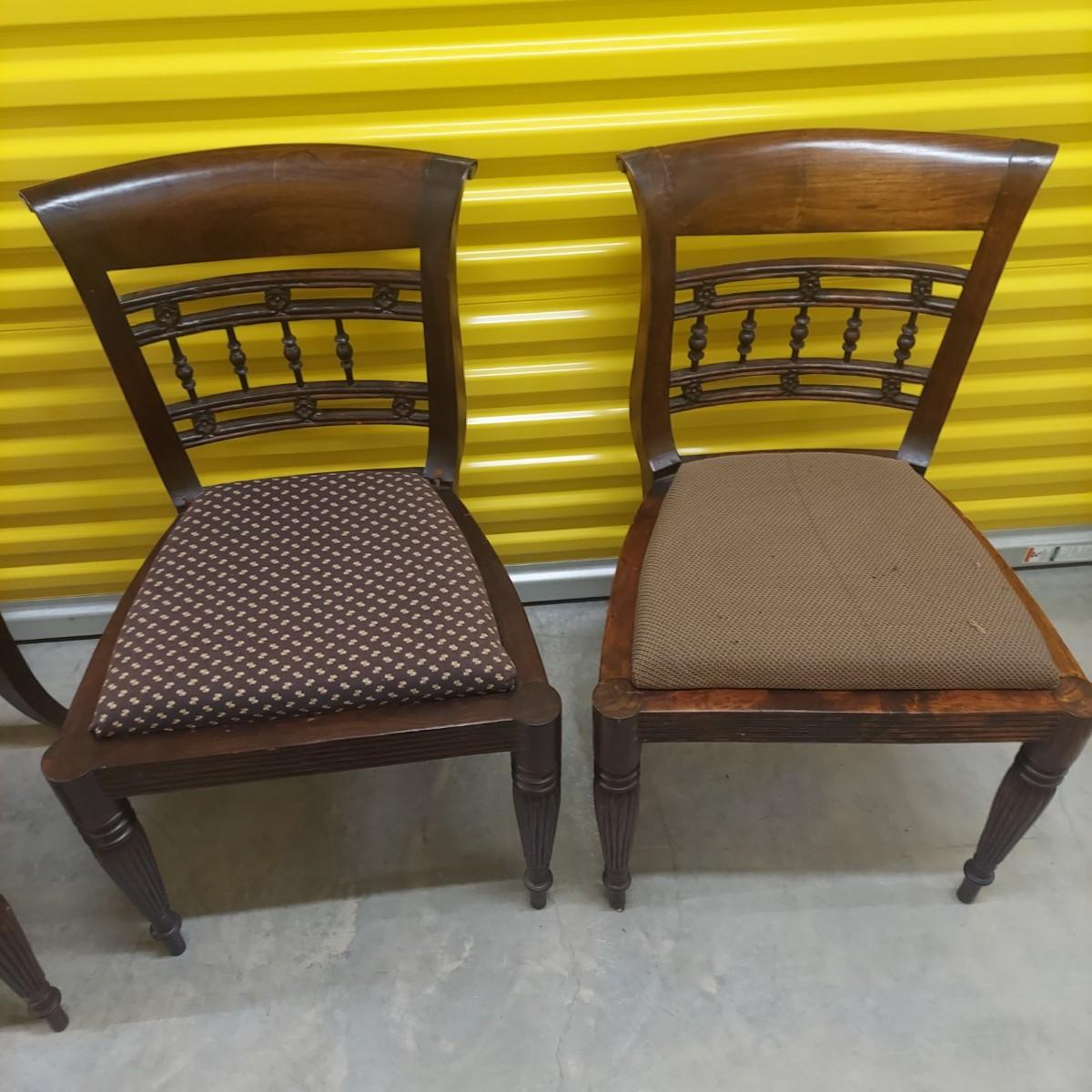Unique round solid wood dining table with very heavy stone top that appears to be marble. There are also four chairs with upholstered seats. Table is in three pieces. The clawfoot center pedestal measures approximately 30"D x 29"H. The frame measures across 45"D. The top is 47.5"D across. There are four chairs with carved backs and fluted legs. Each chair measures 22” x 20” x 34"H with a seat height of 20”H. There are some overall condition issues like cracks in the base, chips out of a chair and what appears to be double sided tape on a chair. Please see photos for details. Local Pickup Only. Winning bidder must bring assistance to help move and load this item due to its weight and/or size.
