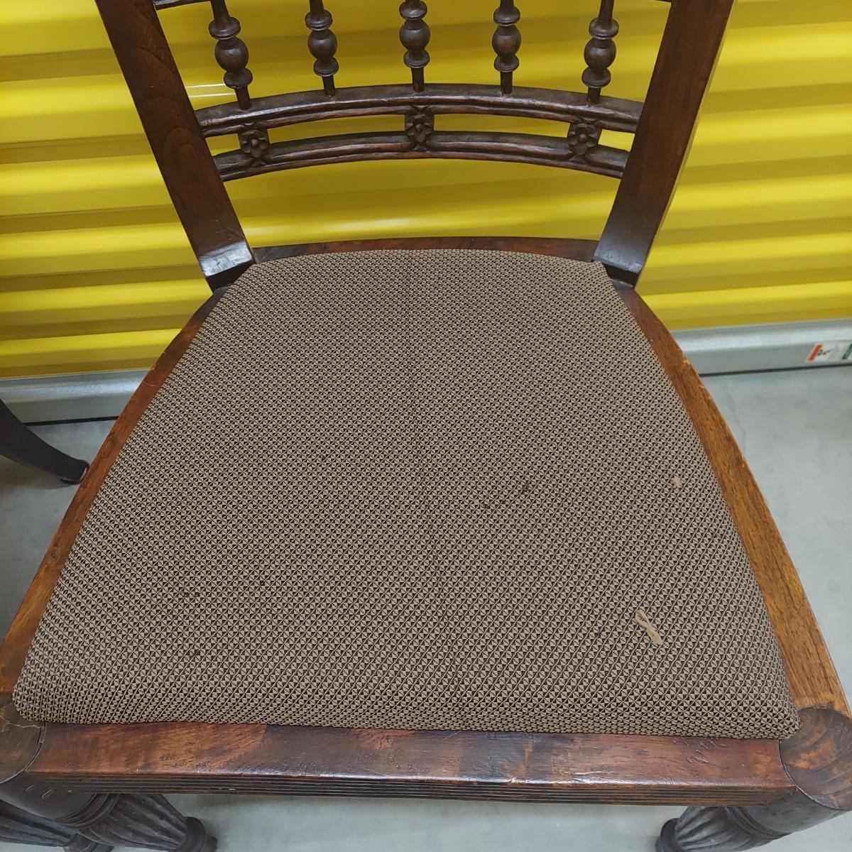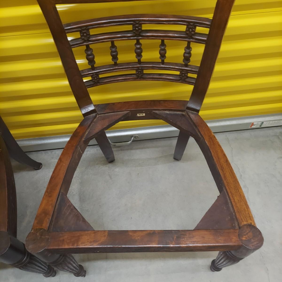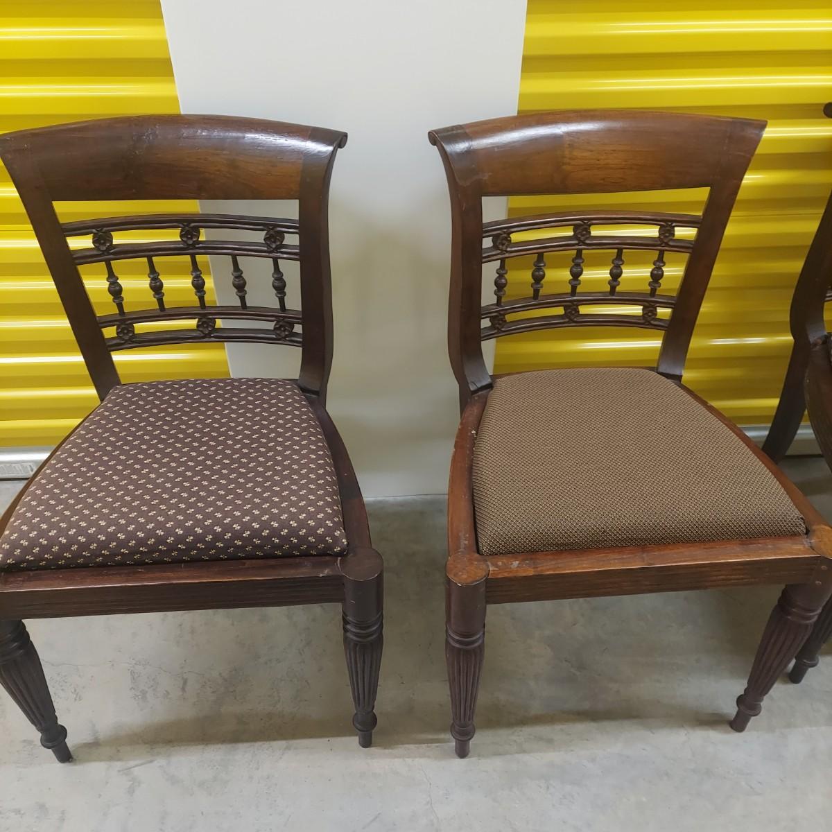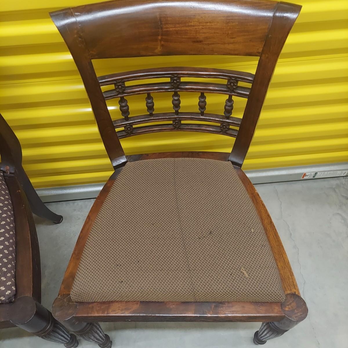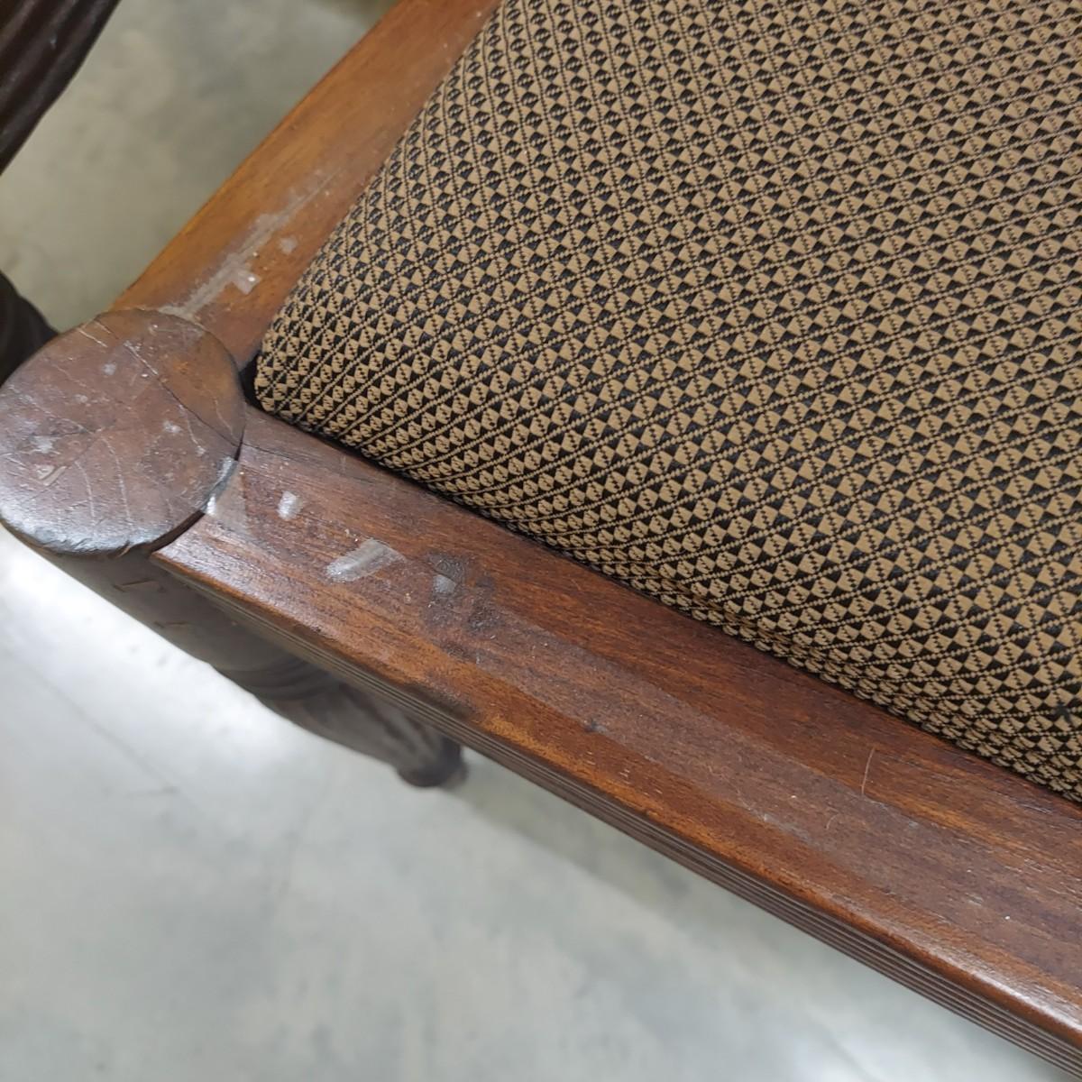 Unique round solid wood dining table with very heavy stone top that appears to be marble. There are also four chairs with upholstered seats. Table is in three pieces. The clawfoot center pedestal measures approximately 30"D x 29"H. The frame measures across 45"D. The top is 47.5"D across. There are four chairs with carved backs and fluted legs. Each chair measures 22” x 20” x 34"H with a seat height of 20”H. There are some overall condition issues like cracks in the base, chips out of a chair and what appears to be double sided tape on a chair. Please see photos for details. Local Pickup Only. Winning bidder must bring assistance to help move and load this item due to its weight and/or size.