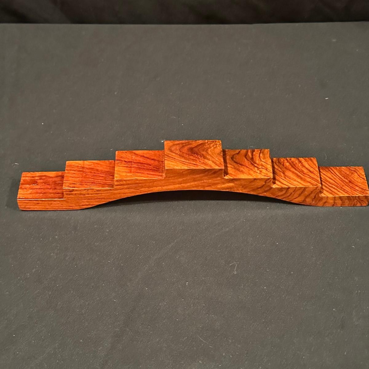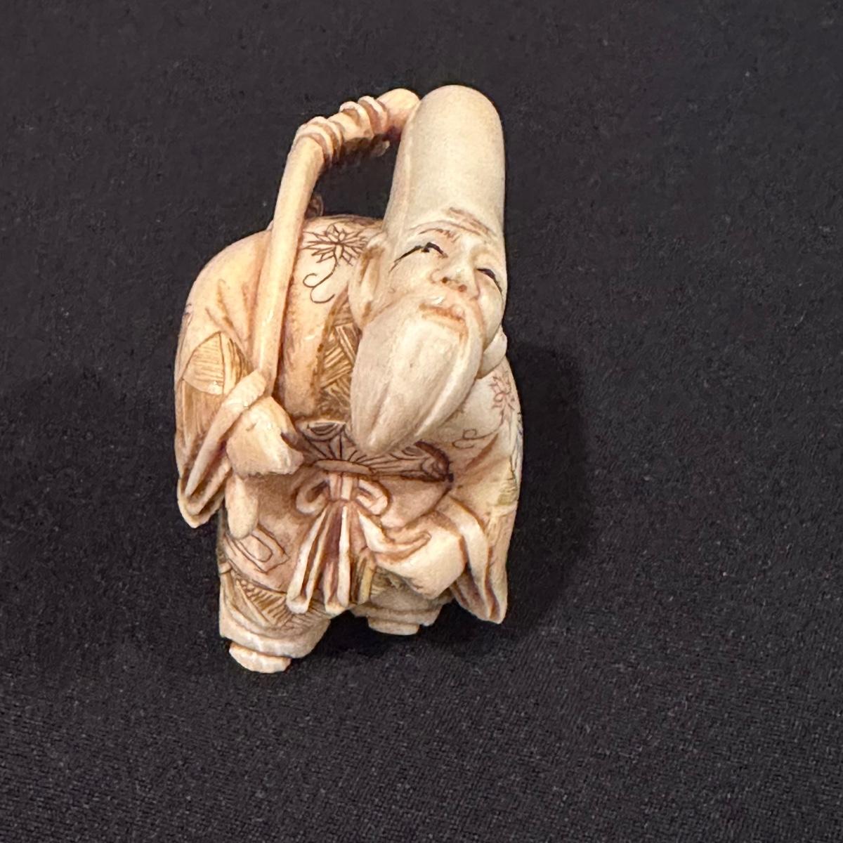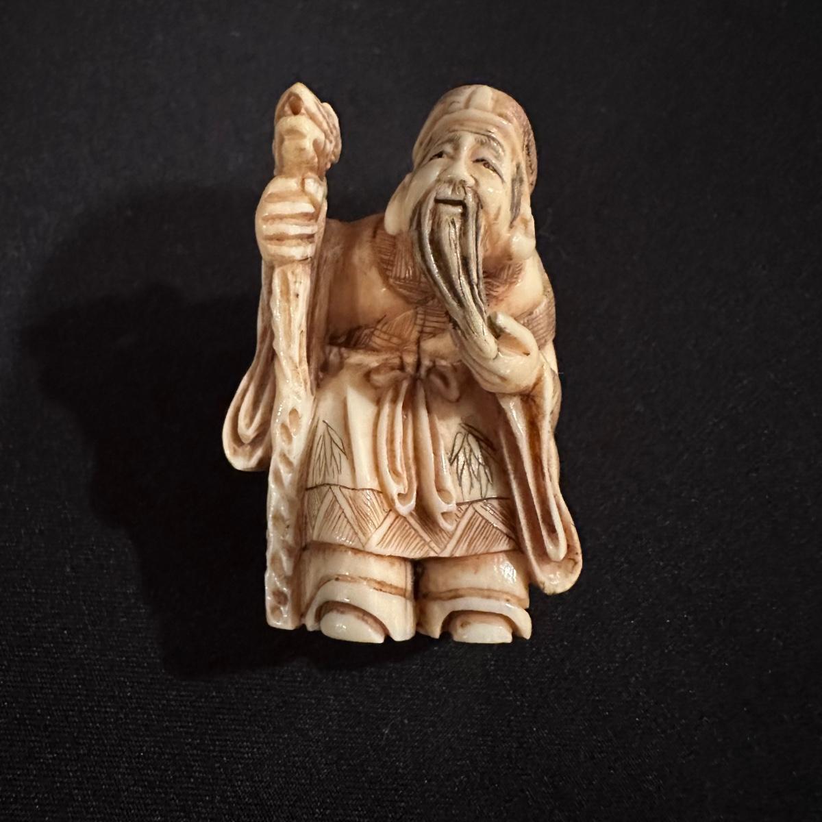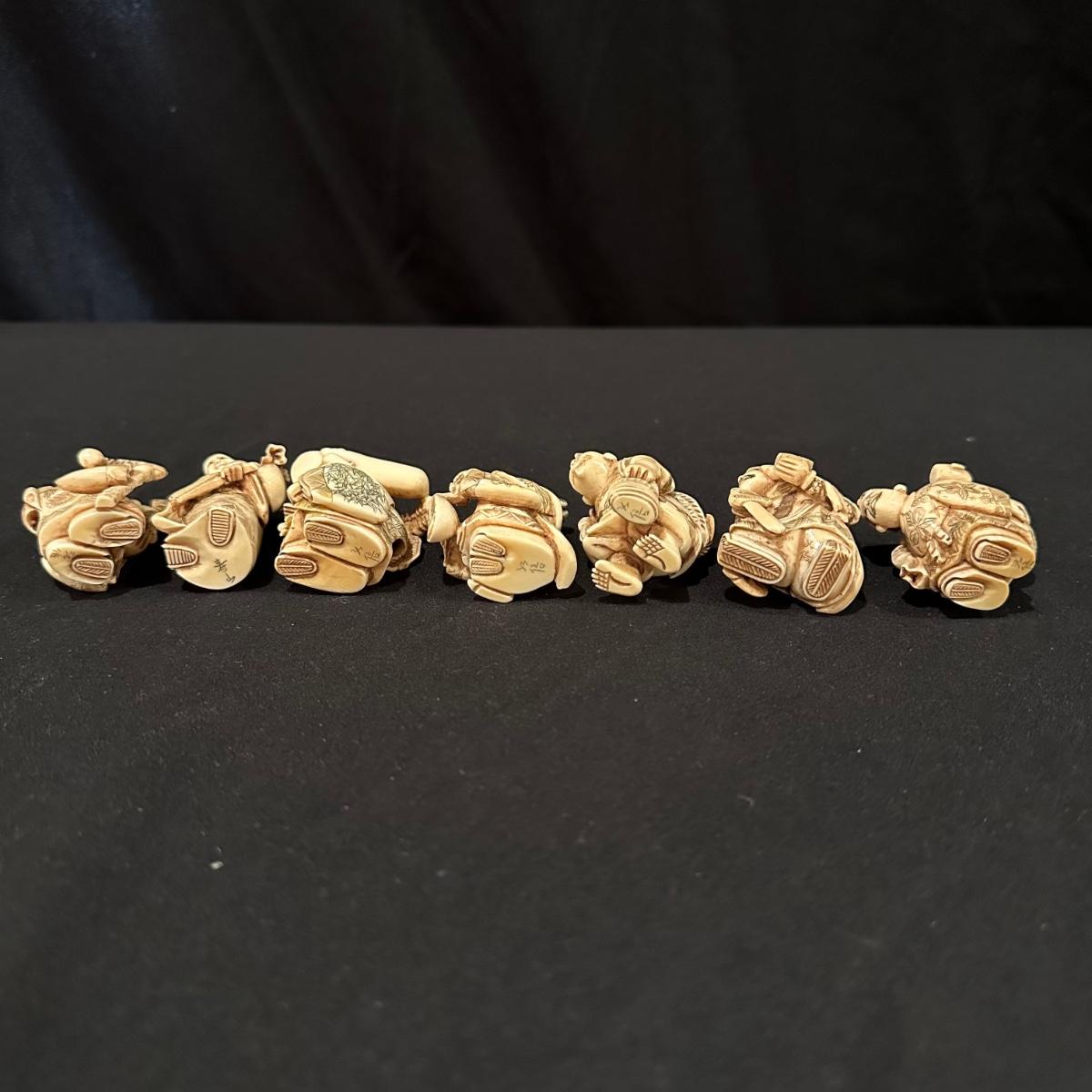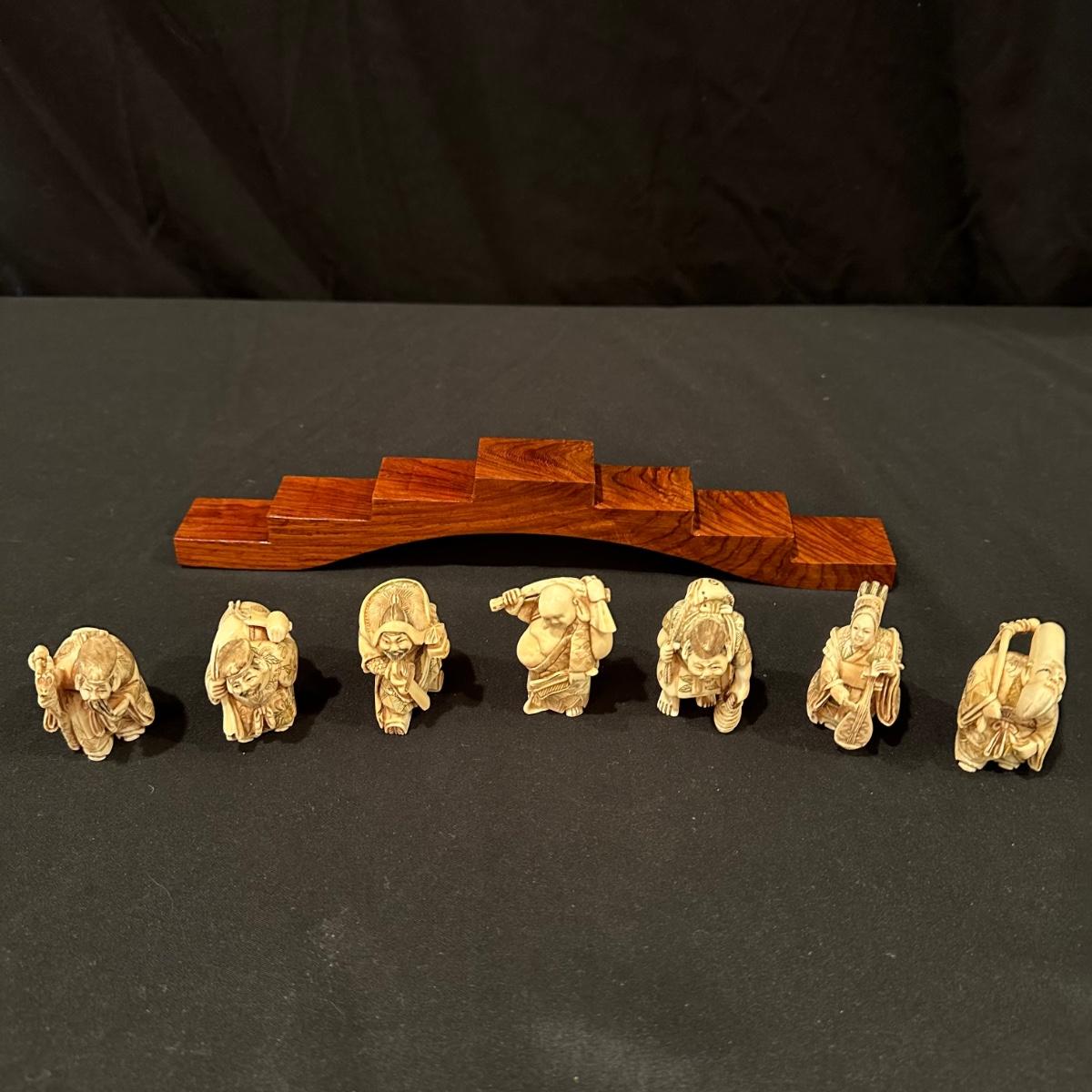 Seven immortals are small figurines of what appears to be carved bone. Includes a tiered wooden stand. Measures 10.5" x 1.25" x 3.5”H.