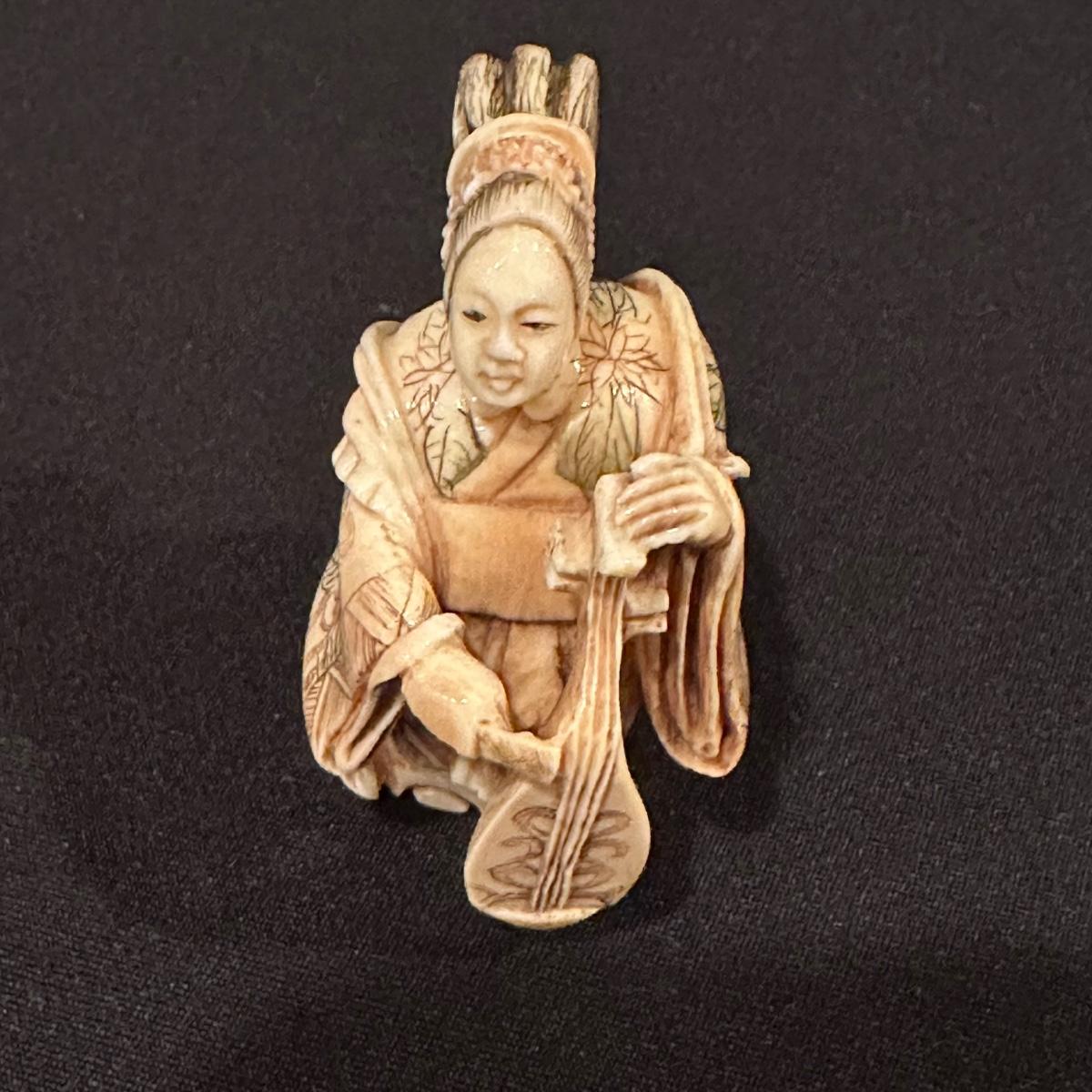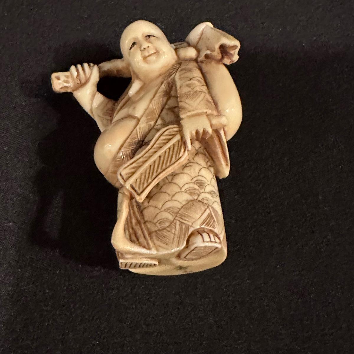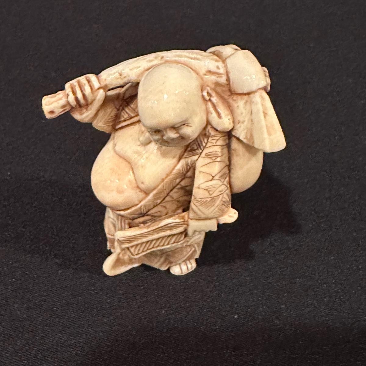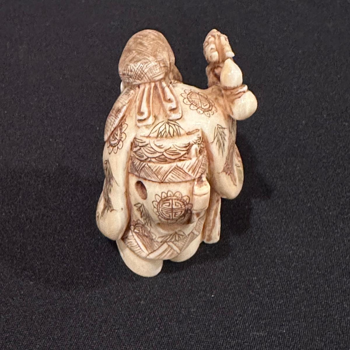 Seven immortals are small figurines of what appears to be carved bone. Includes a tiered wooden stand. Measures 10.5" x 1.25" x 3.5”H.
