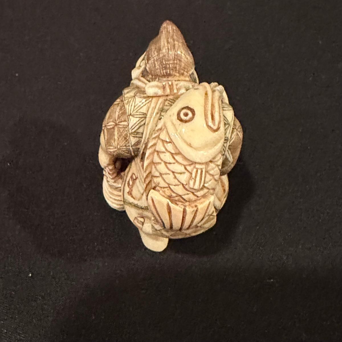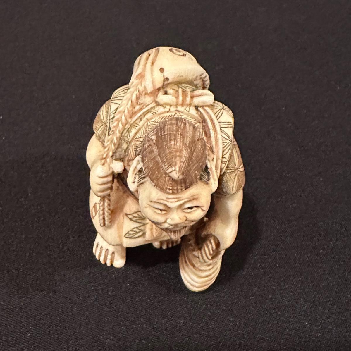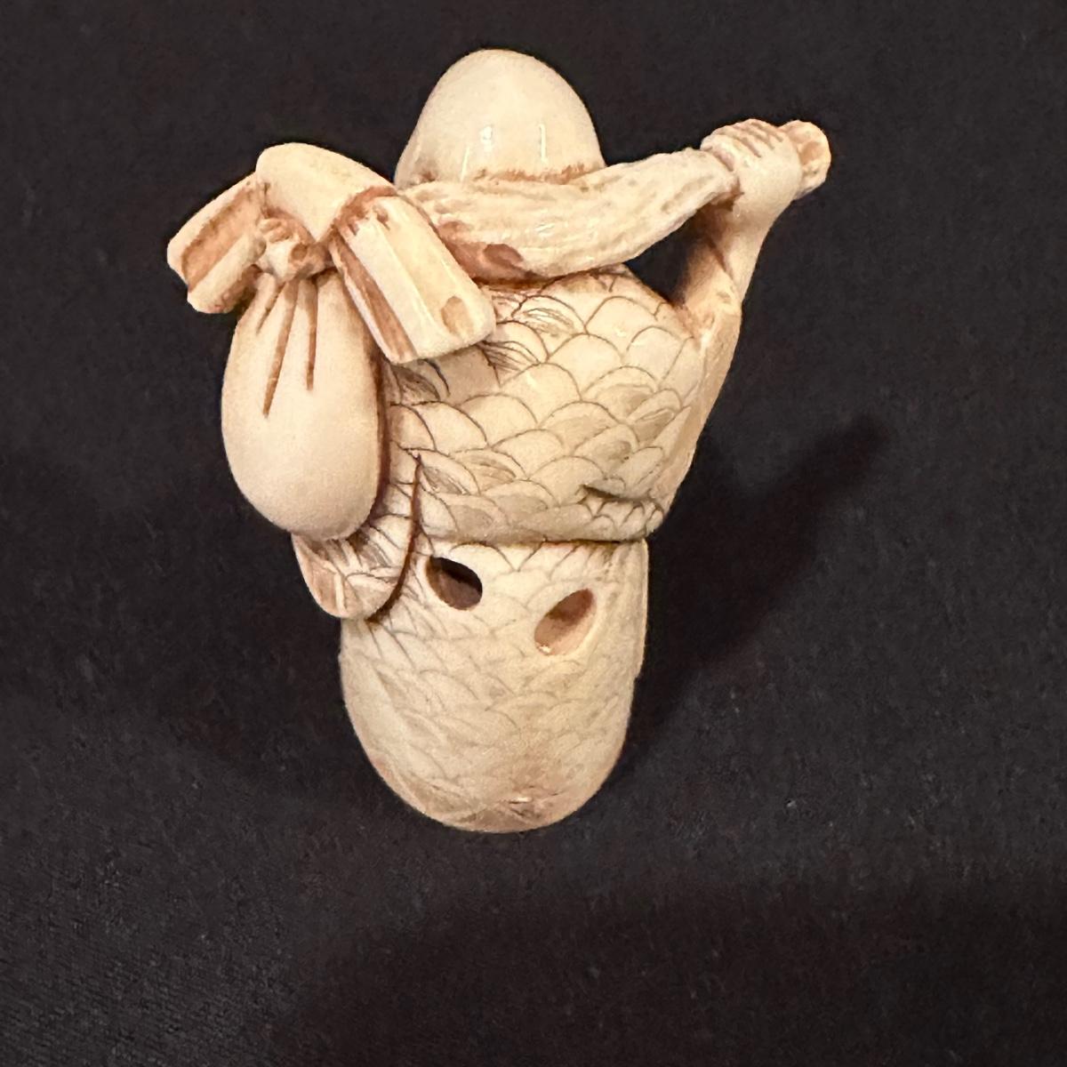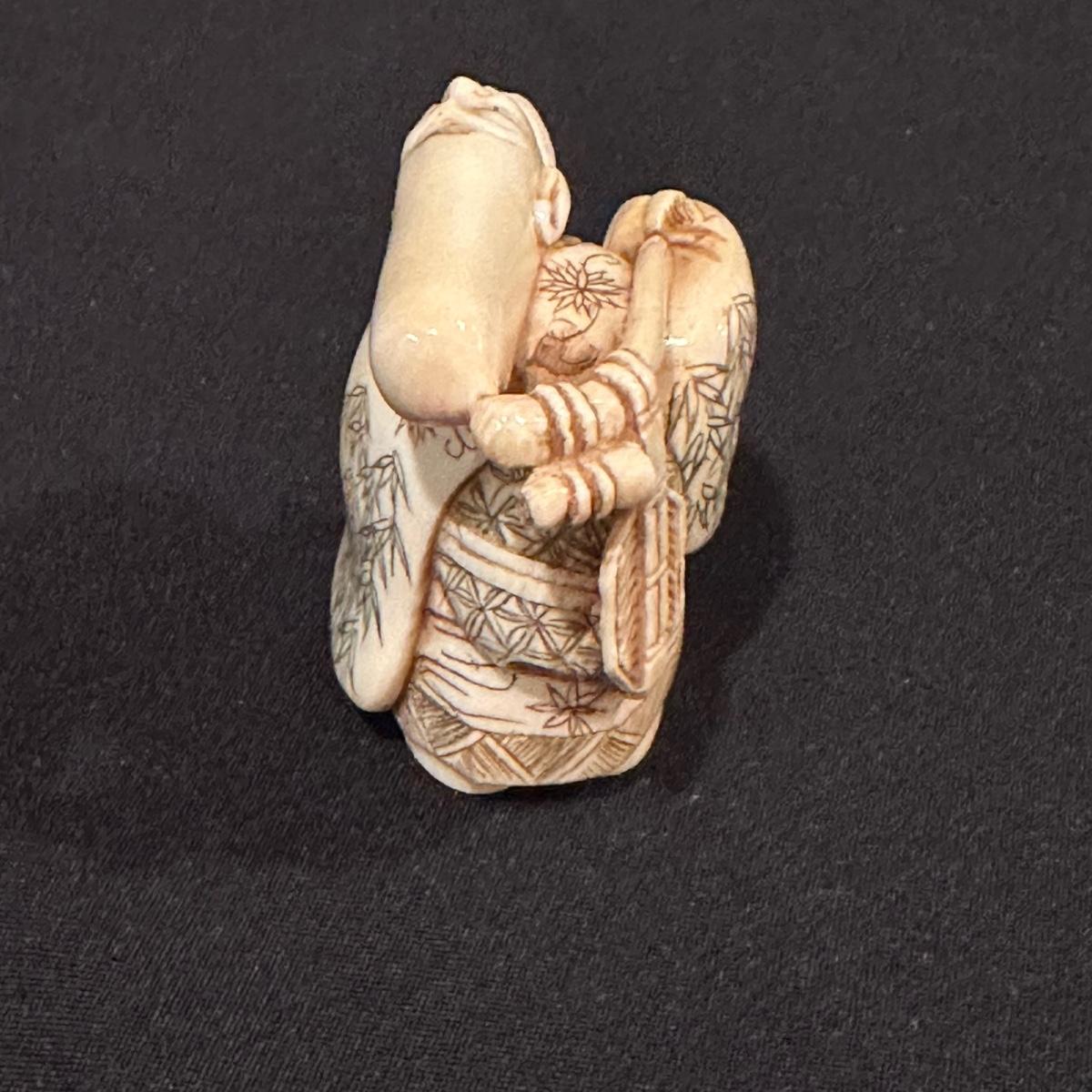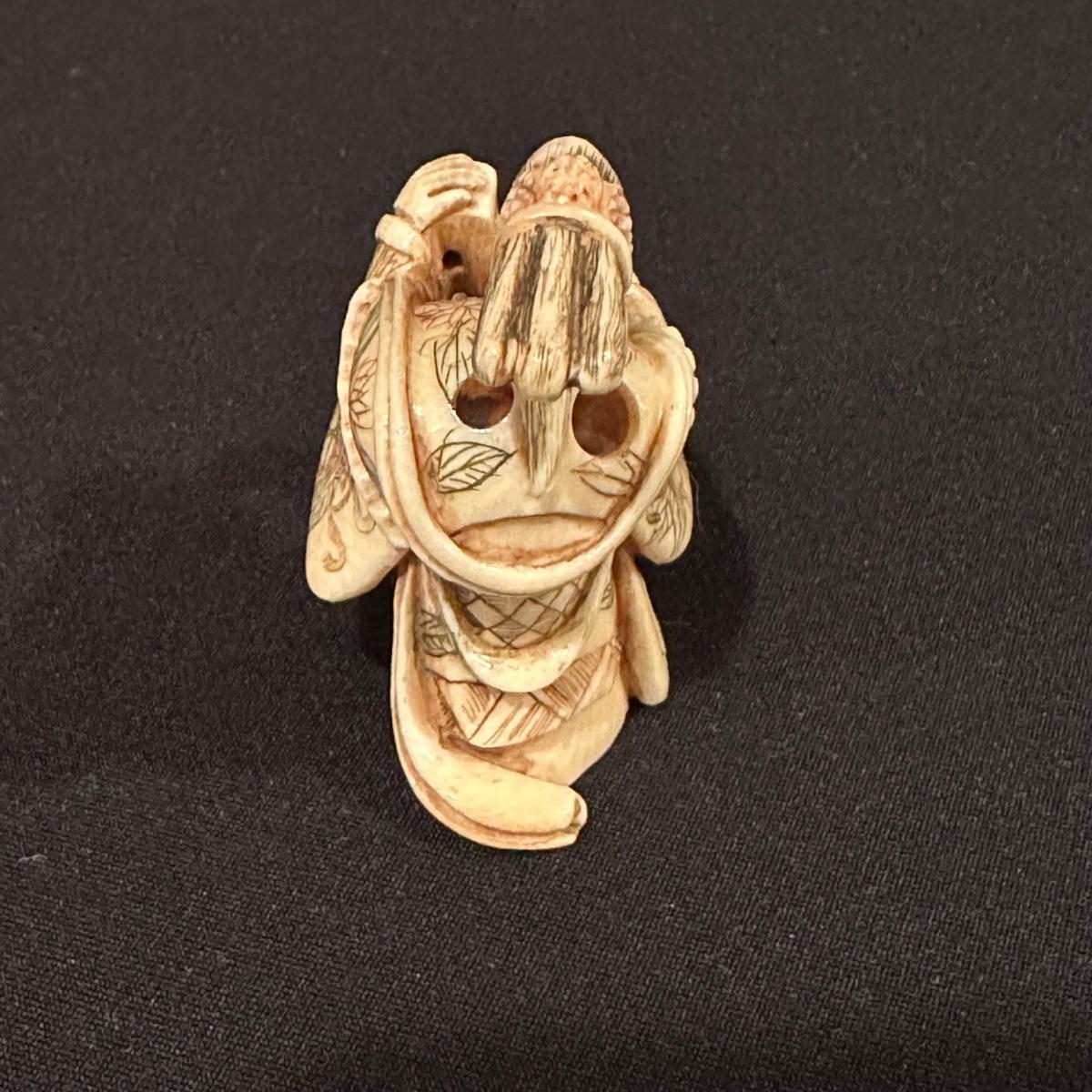Seven immortals are small figurines of what appears to be carved bone. Includes a tiered wooden stand. Measures 10.5" x 1.25" x 3.5”H.