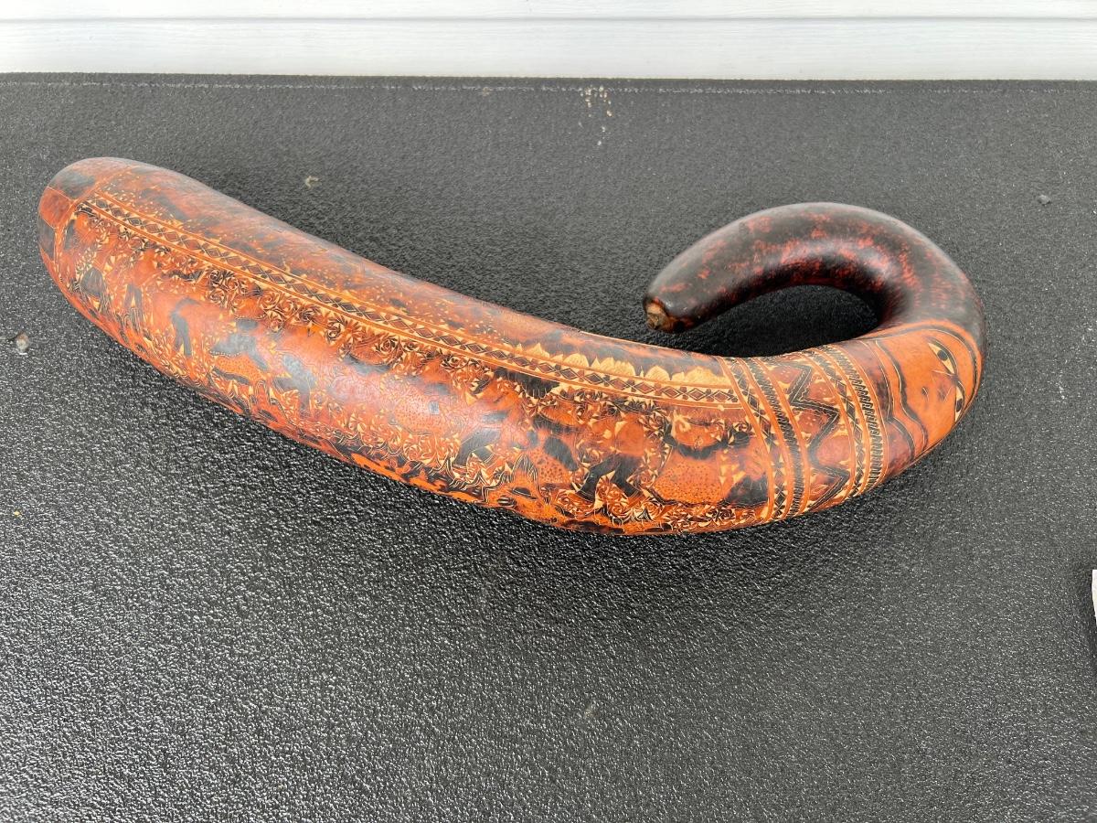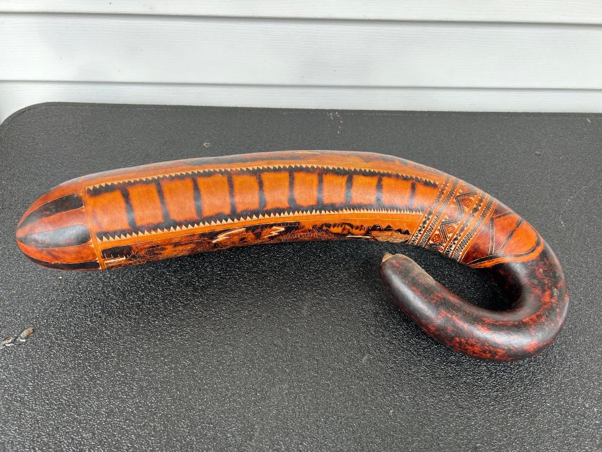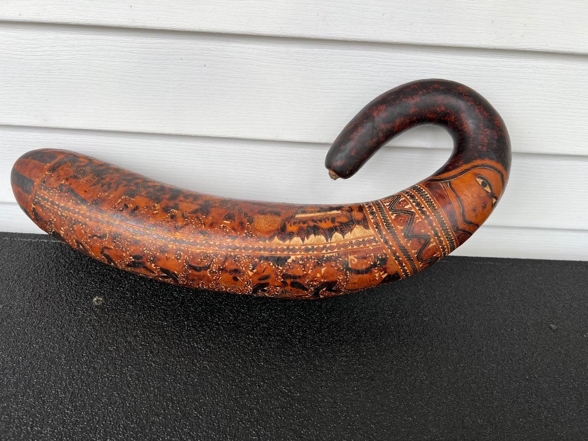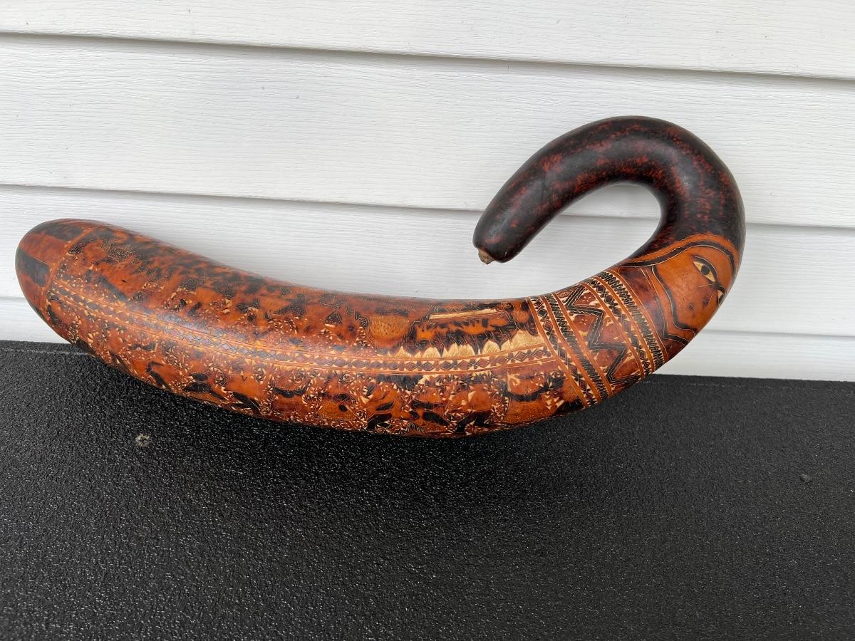 ative American Gourd Art Musical Instrument, sounds like beans or something similar inside. Measures 4 inches tall, 19 inches long and 6 1/2 wide at its widest point.