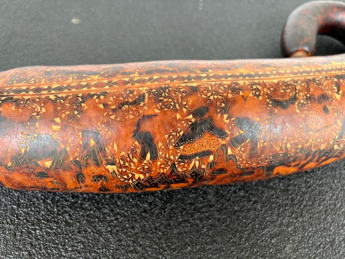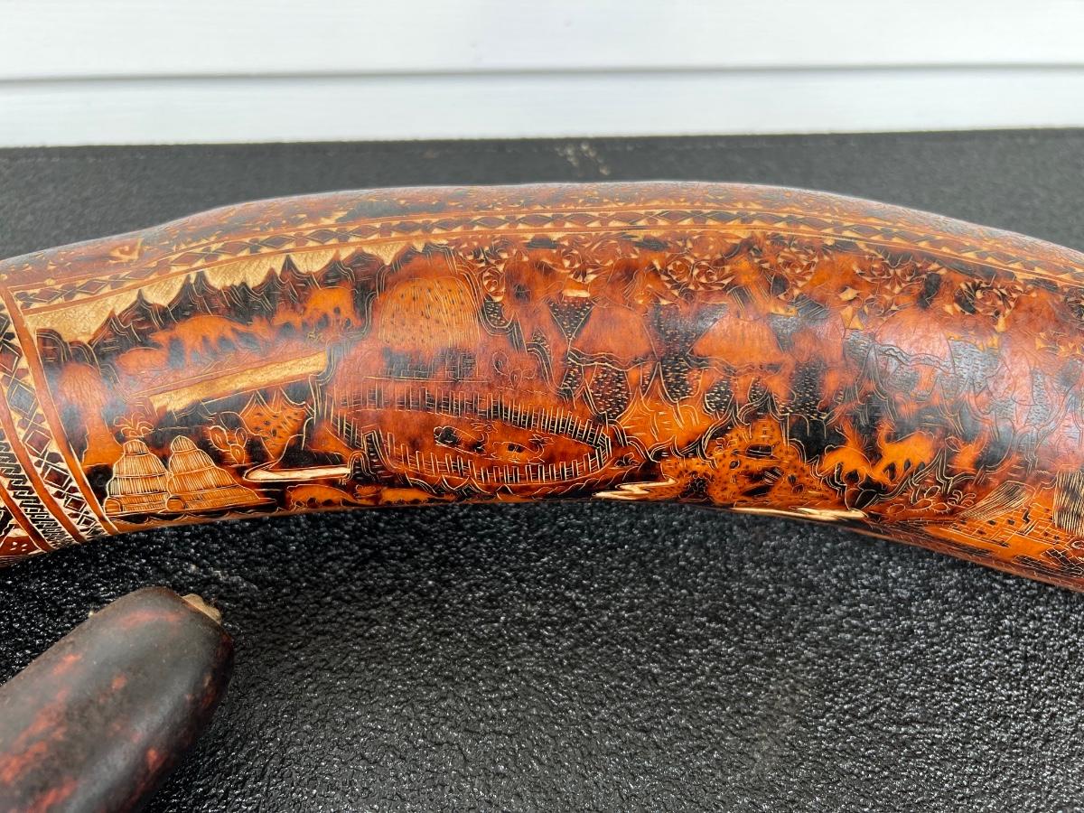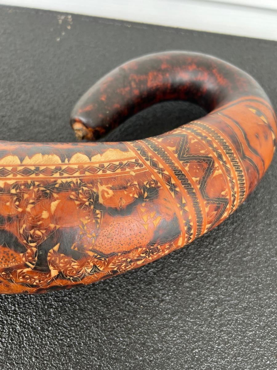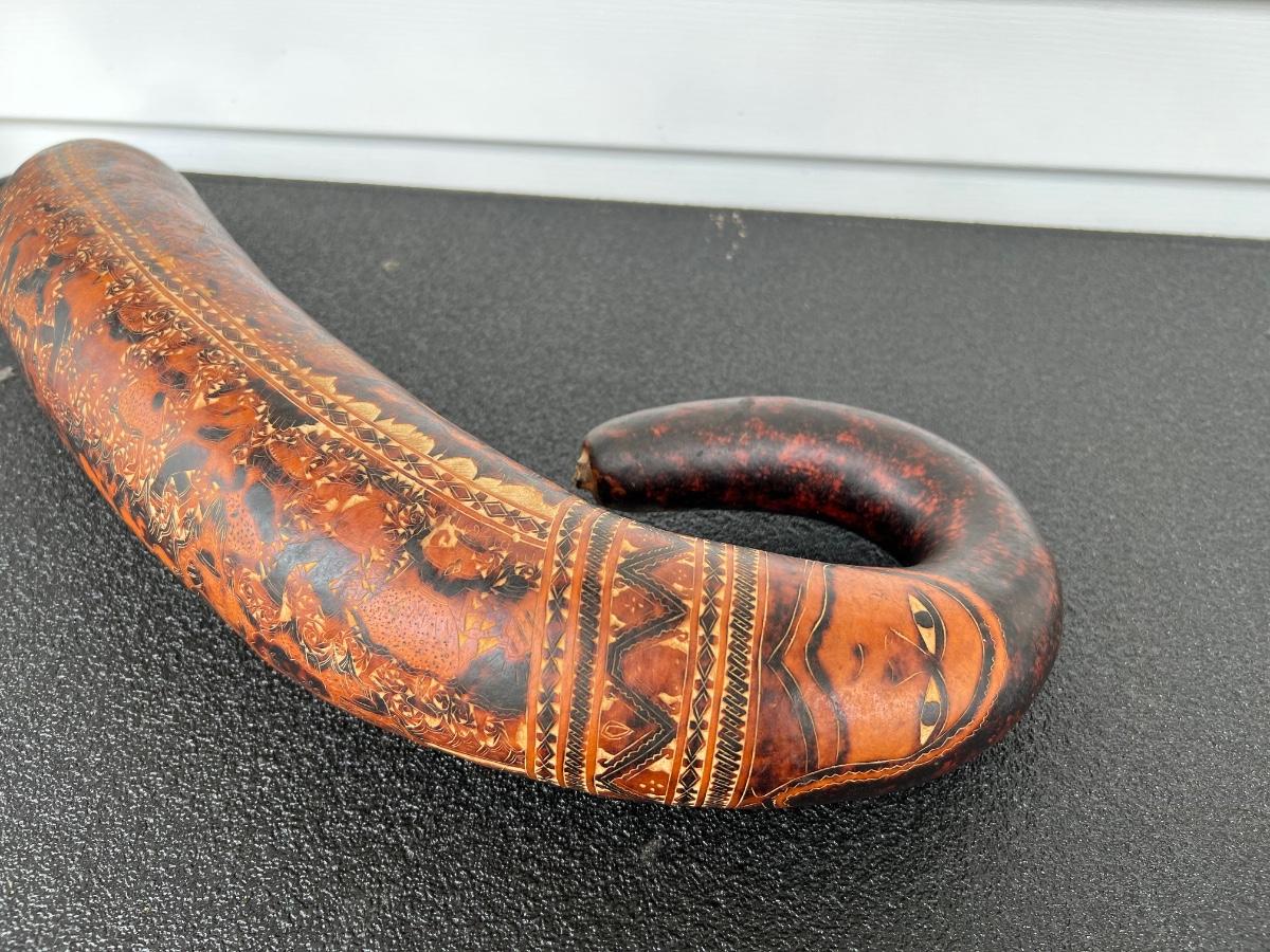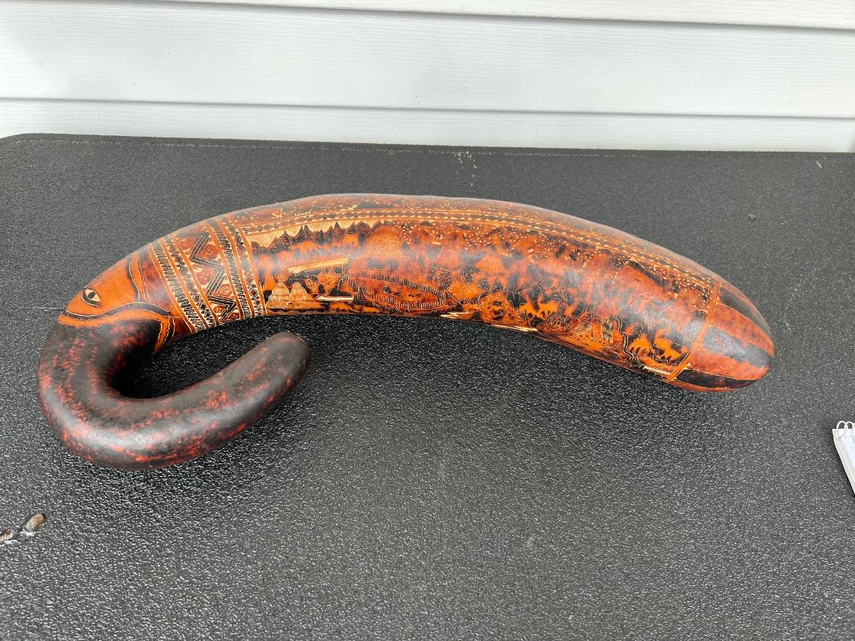 ative American Gourd Art Musical Instrument, sounds like beans or something similar inside. Measures 4 inches tall, 19 inches long and 6 1/2 wide at its widest point.
