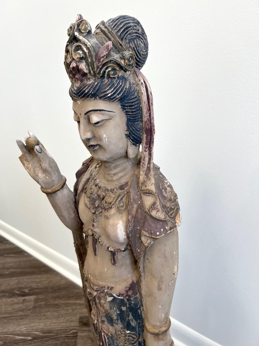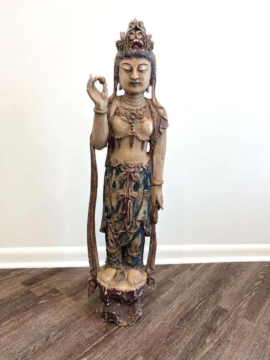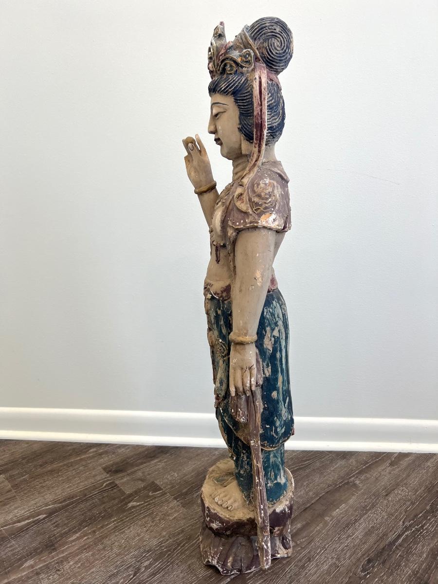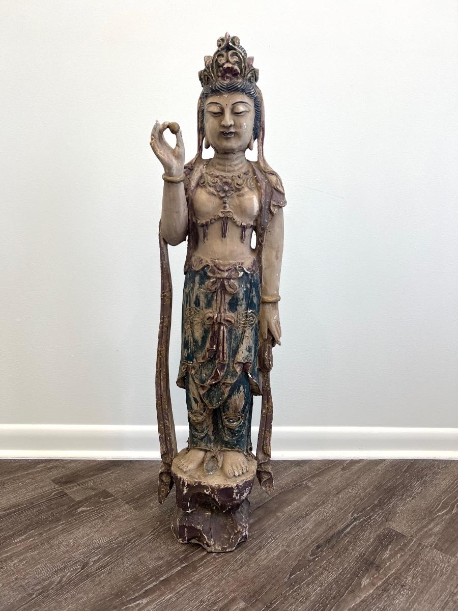 Guan Yin (I believe) goddess, Carved old wooden girl measures 41 inches tall, 11 inches wide, and 9 inches deep. Please see pictures for missing finger on the right hand and some fractures in the wood on the left hand on the backside What a find!