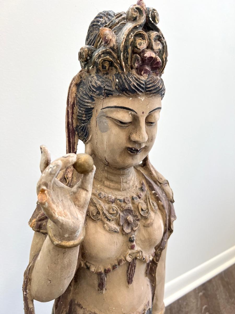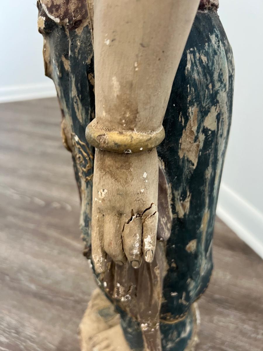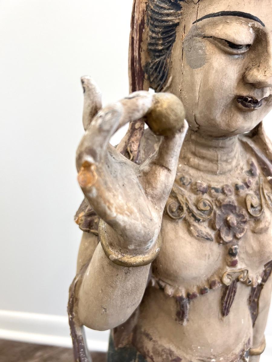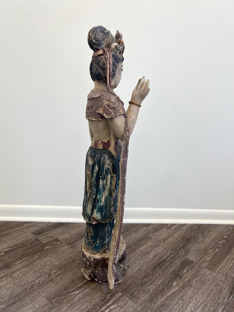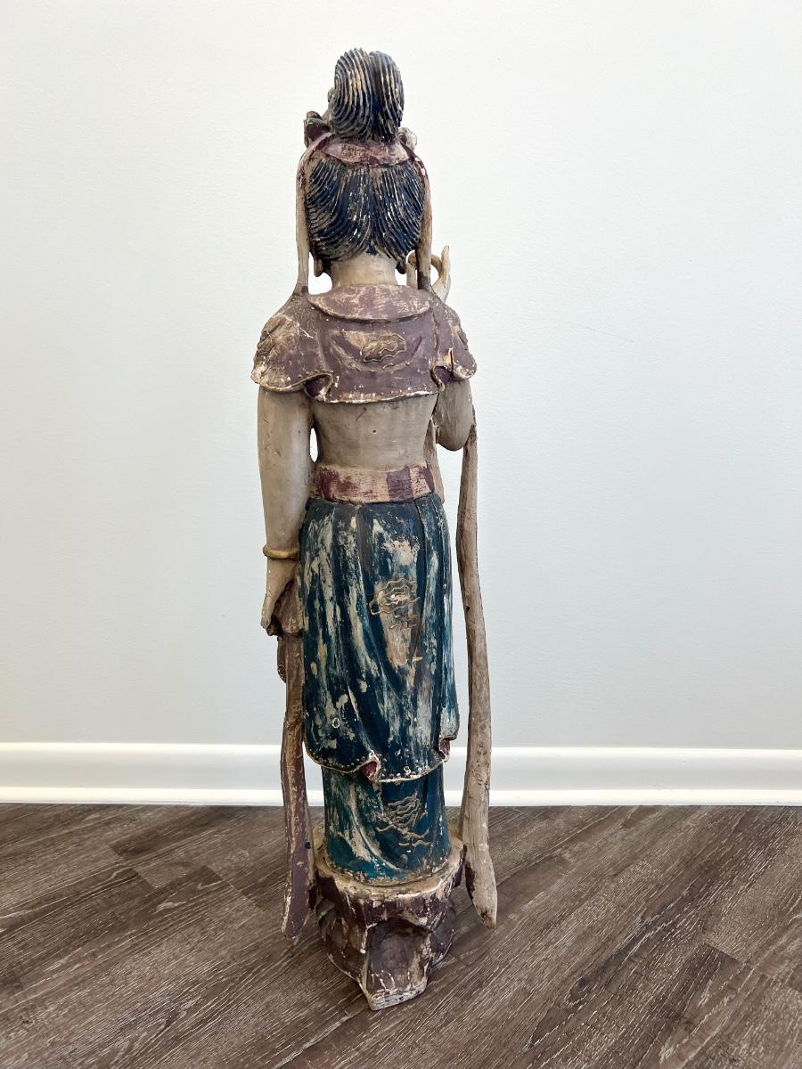 Guan Yin (I believe) goddess, Carved old wooden girl measures 41 inches tall, 11 inches wide, and 9 inches deep. Please see pictures for missing finger on the right hand and some fractures in the wood on the left hand on the backside What a find!