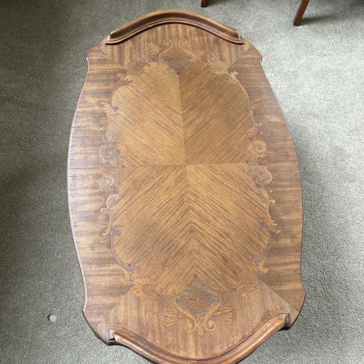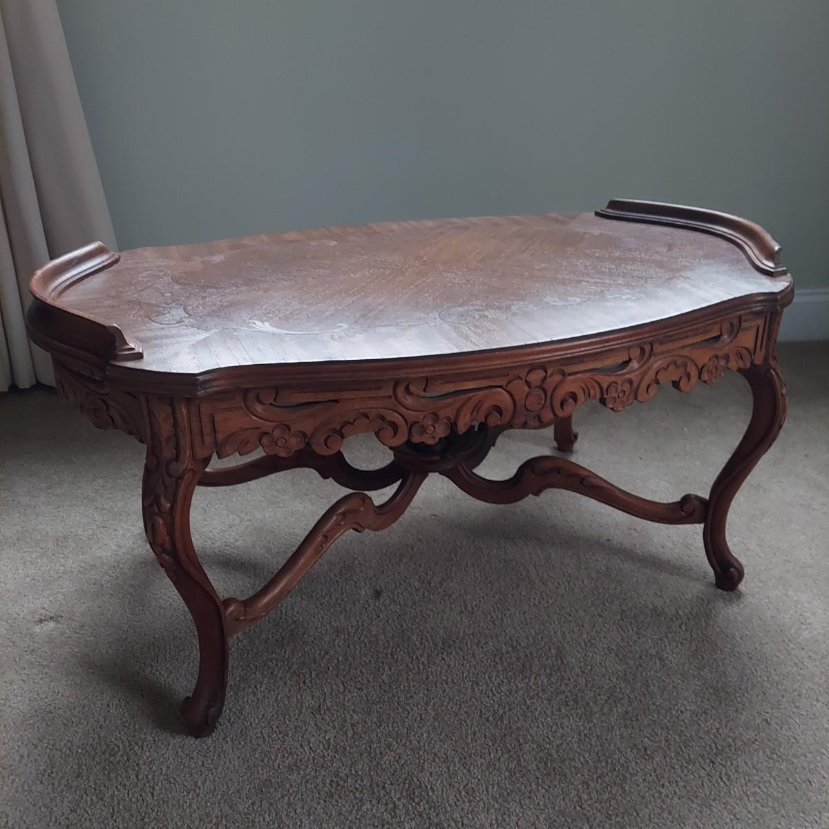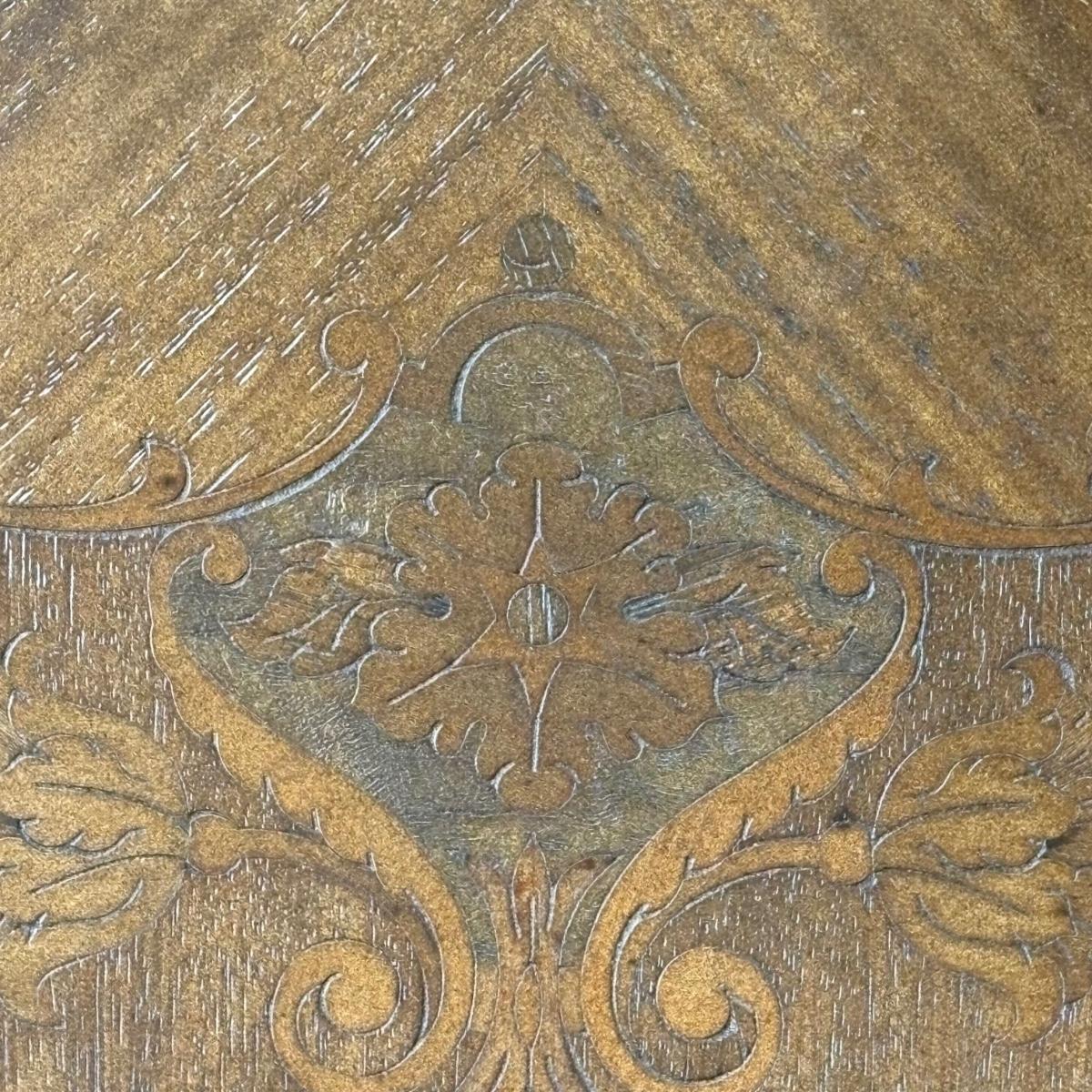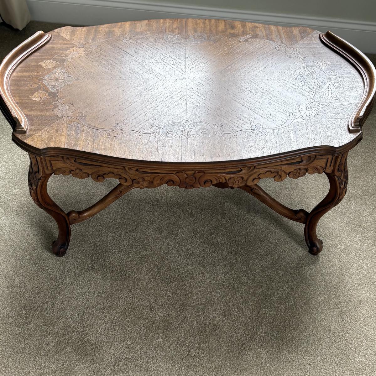 Delicate carved design on top. Antique look and feel. Label underneath is from a moving company. 33.5” x 21” x 16”H. Local pickup only.