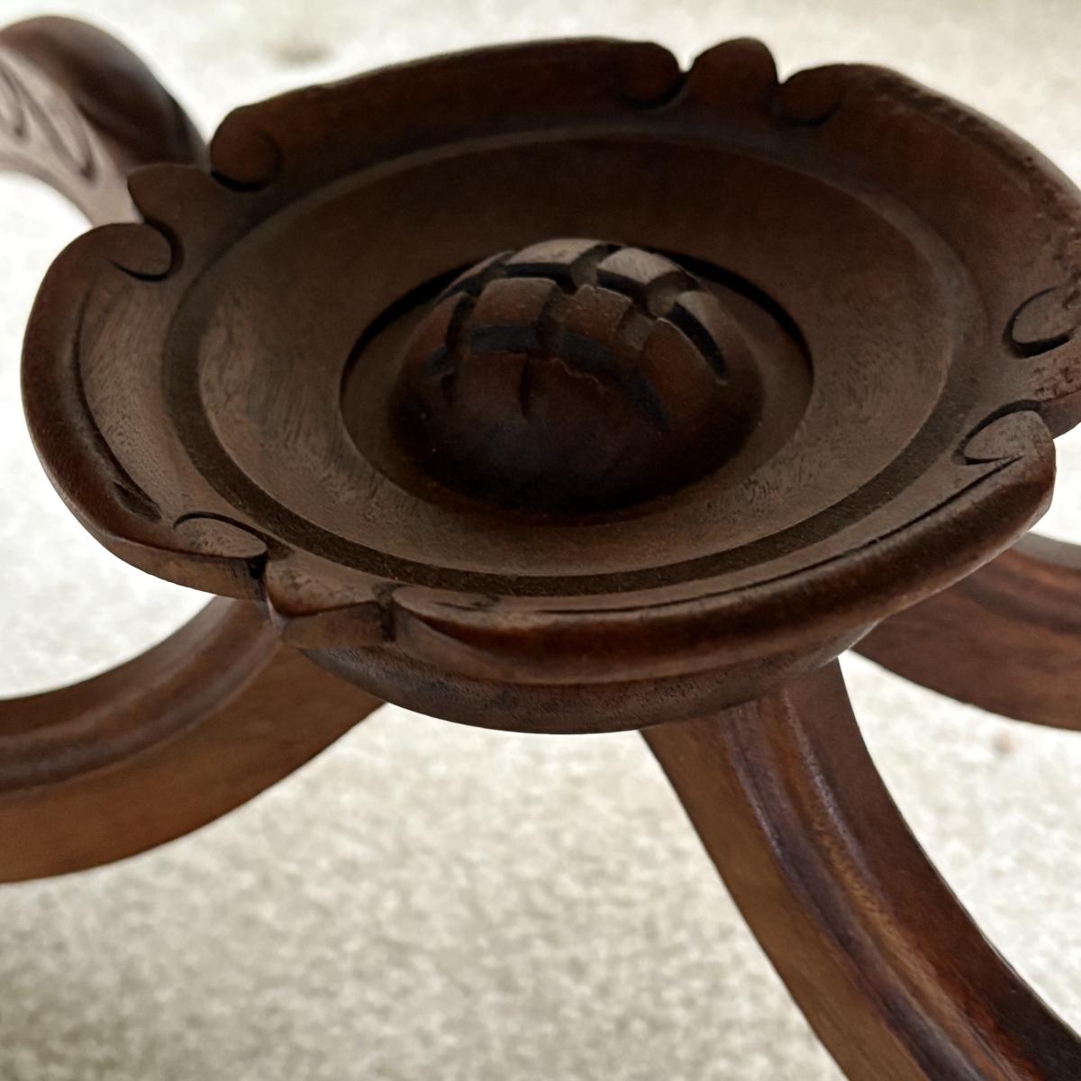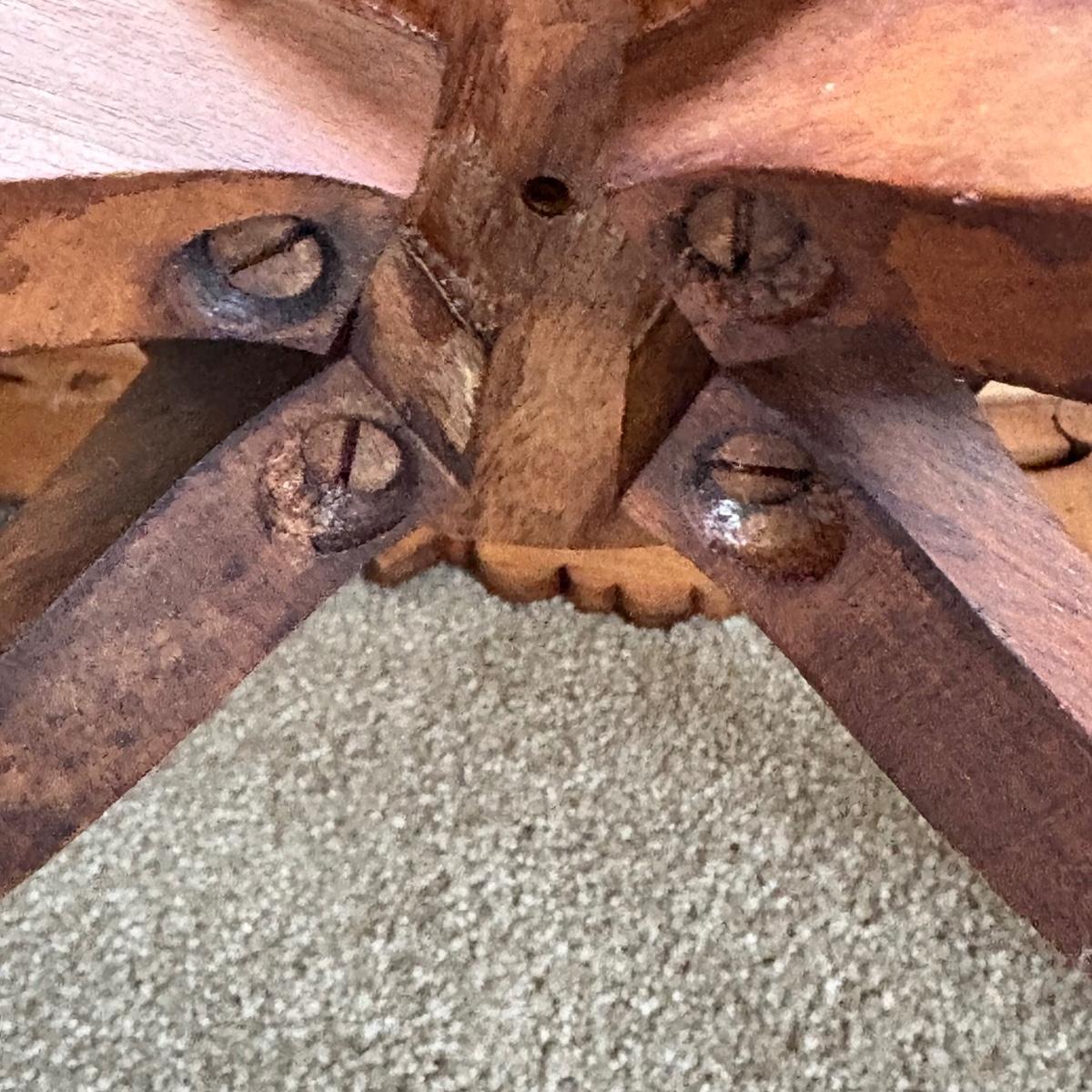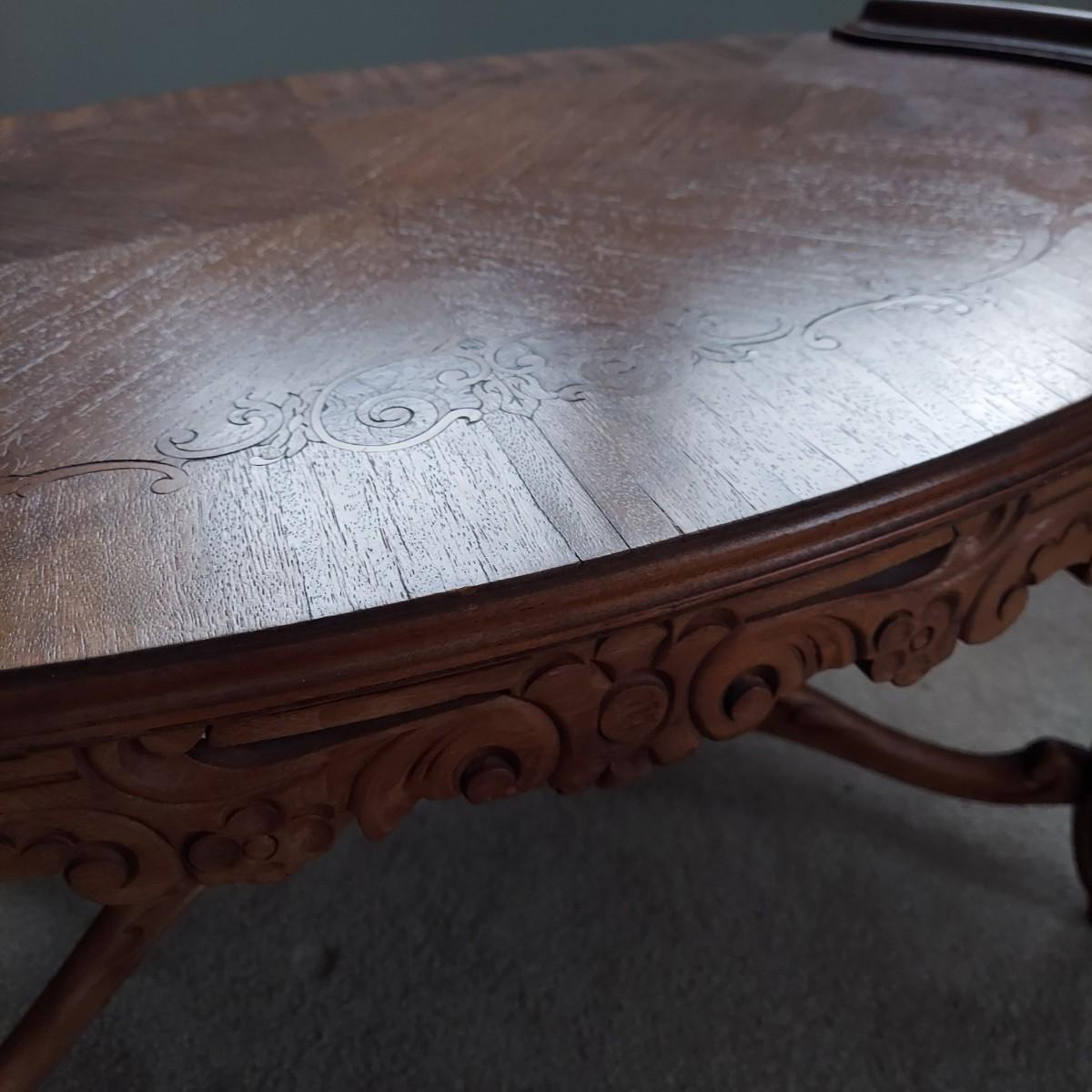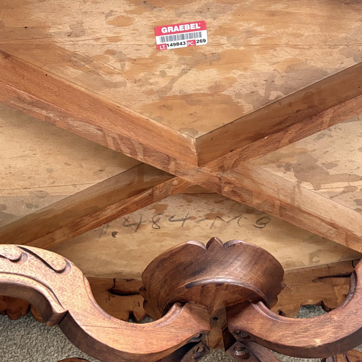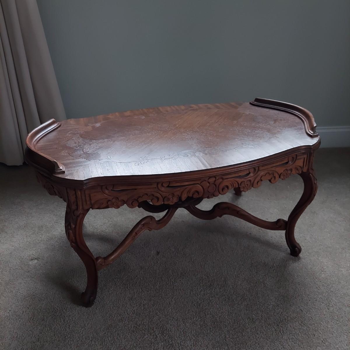 Delicate carved design on top. Antique look and feel. Label underneath is from a moving company. 33.5” x 21” x 16”H. Local pickup only.