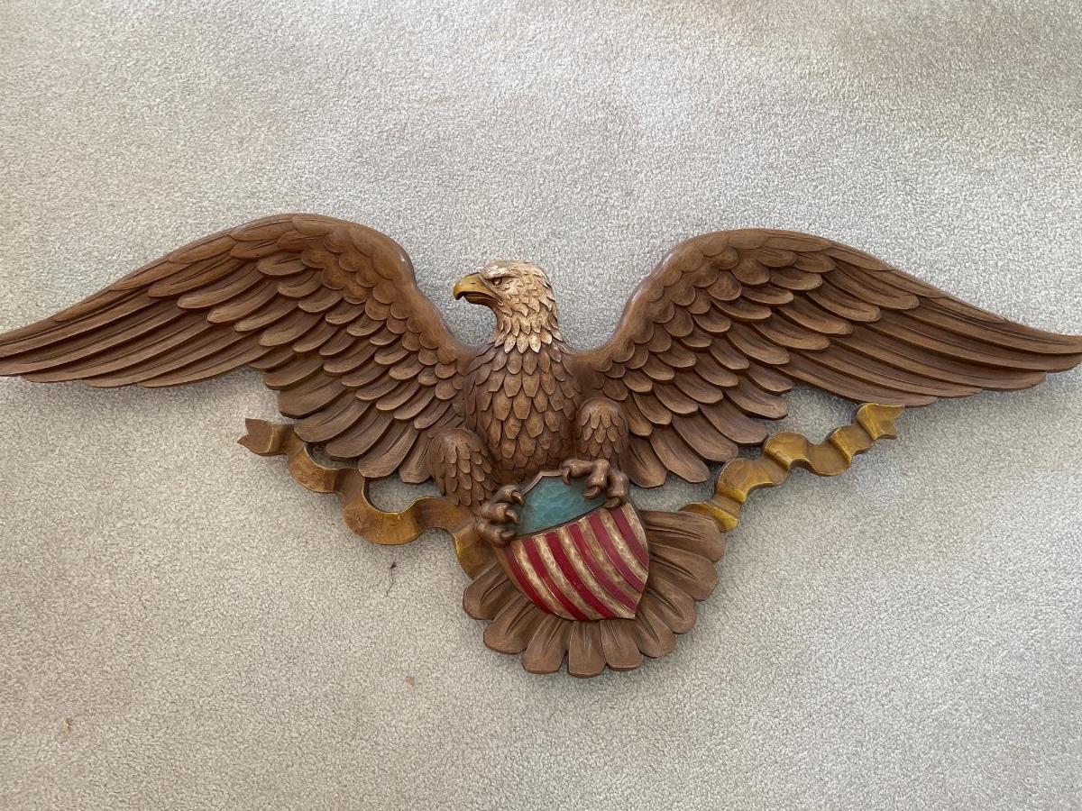 This is a great 3d style carving of a Bald Eagle with shield. Super cool piece!!