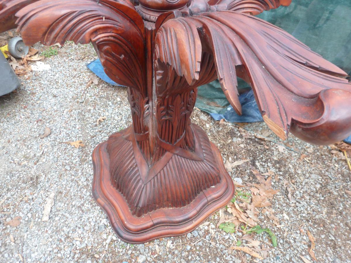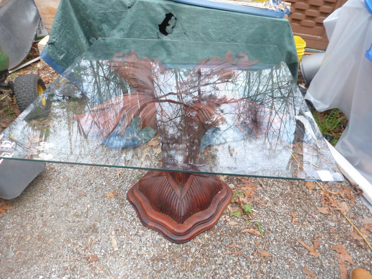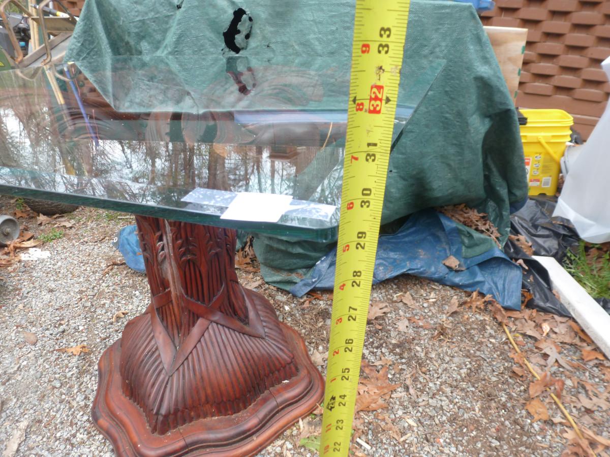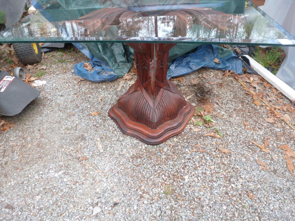 Carved Pedestal Table with Beveled Glass Top. Top is approx 38 3/4" in diameter.
