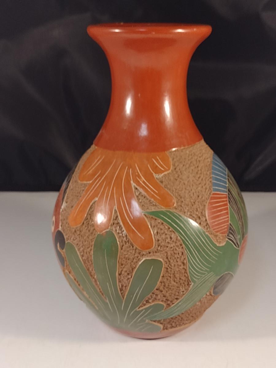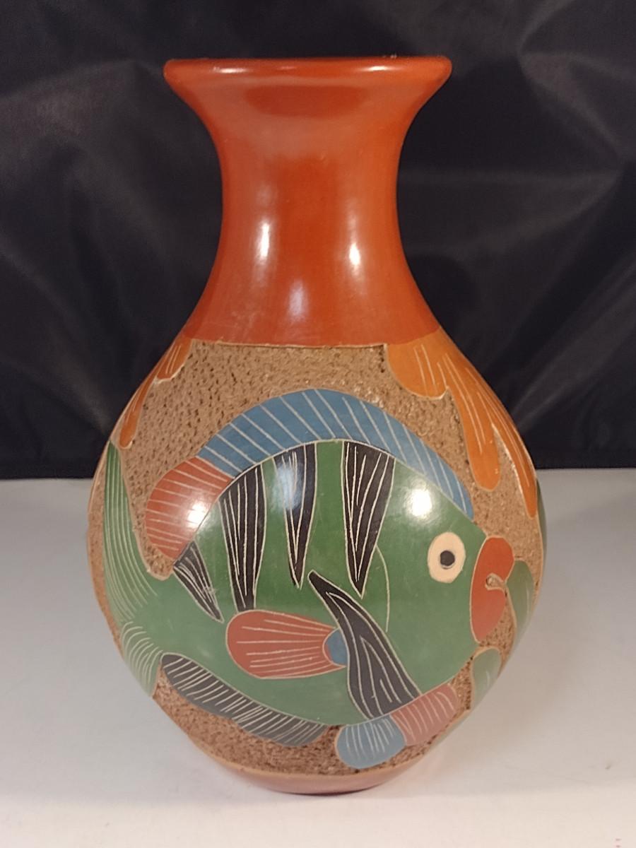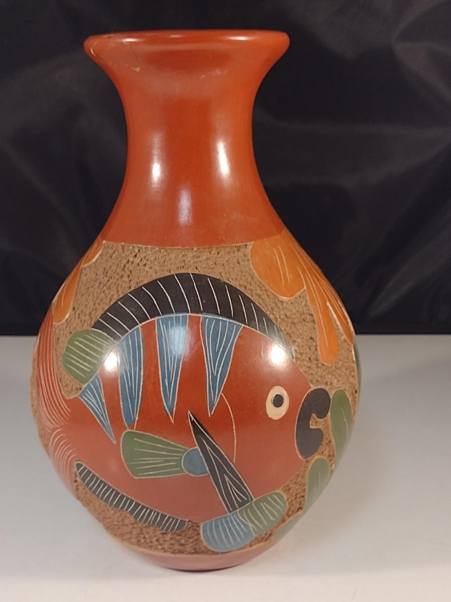 Carved Pottery Vase with Fish Design- Possibly Nicaraguan- Approx 8" Tall